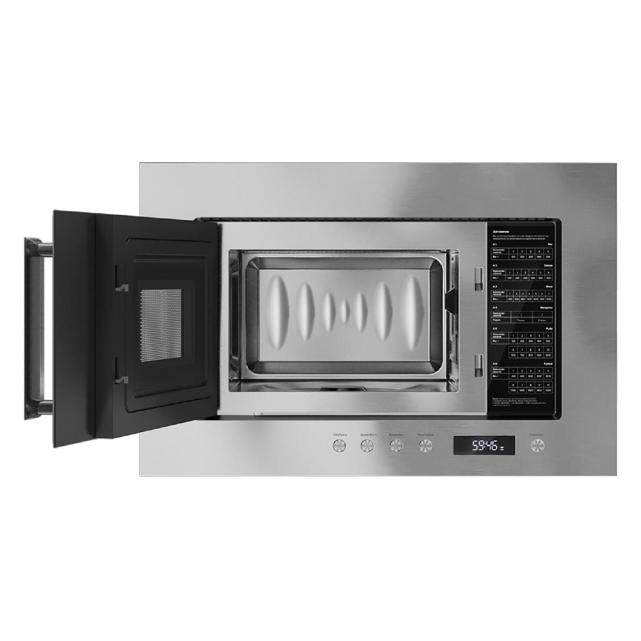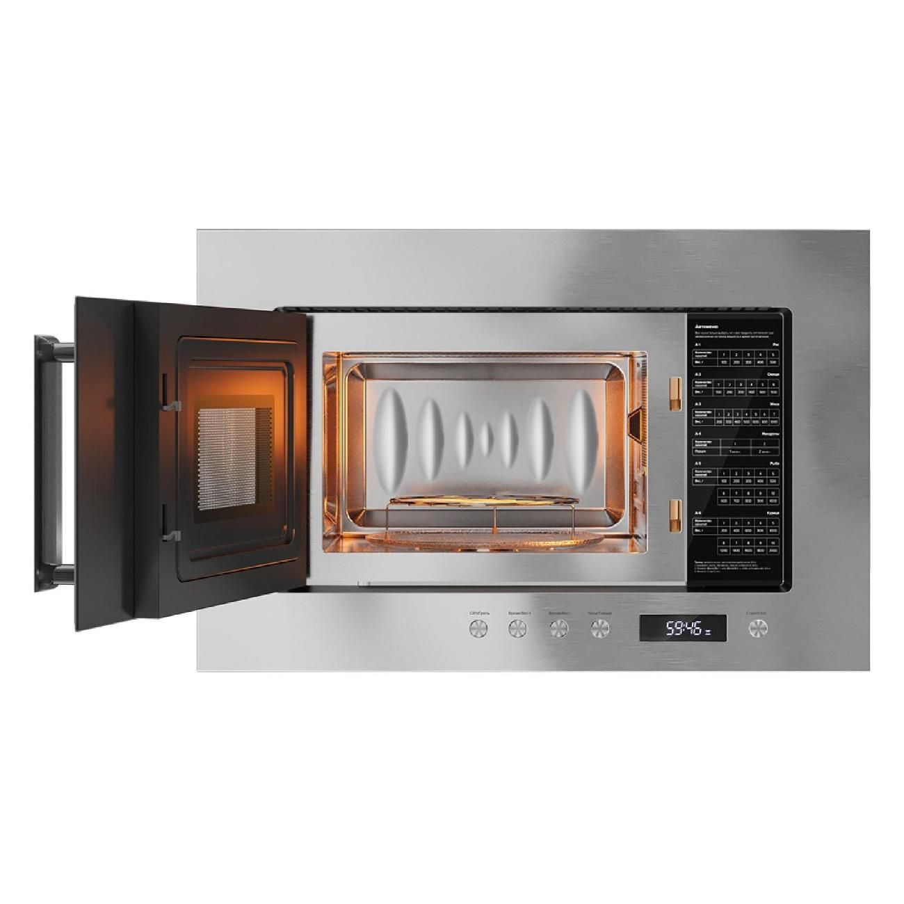 Дверца духовки оснащена жаростойким стеклом, открывается в левую сторону. Размер ниши для встраивания составляет 365x565x550 мм. Система защиты от детей позволяет заблокировать элементы управления для предотвращения случайного включения устройства. Встроен гриль на 800 Вт. Внутри установлена подсветка. Поворотный столик и высокая решетка входят в комплект.