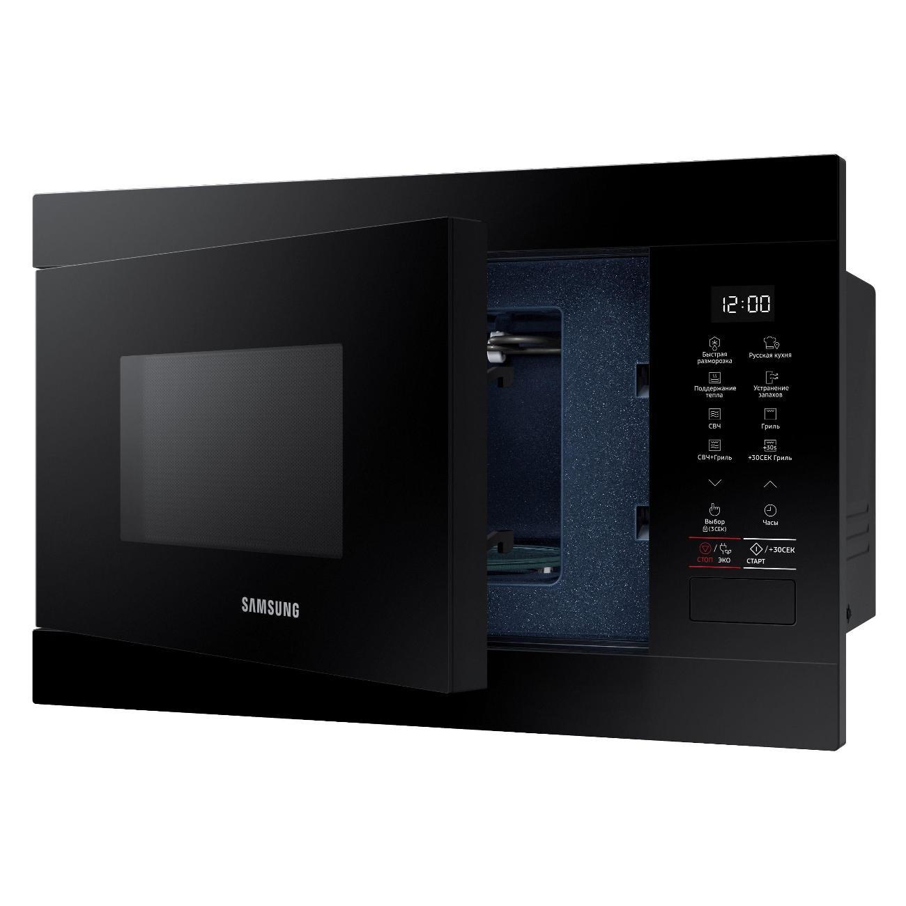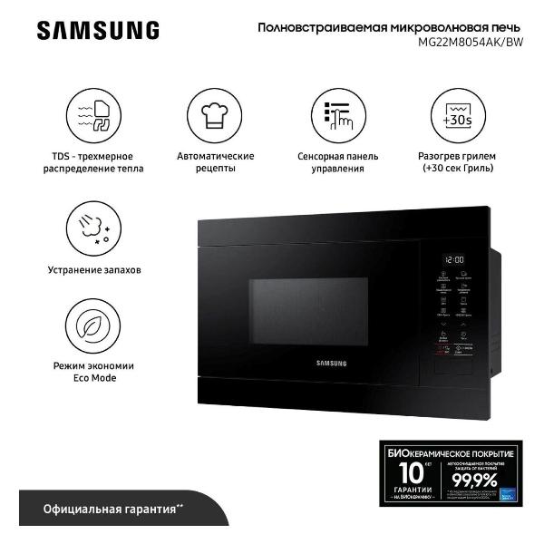 Микроволновая печь Samsung MG22M8054AK/BW предназначена для встраивания в кухонный гарнитур. Модель объемом 22 литра оснащена сенсорным управлением, покрытием Bio керамика и функцией удаления запахов.