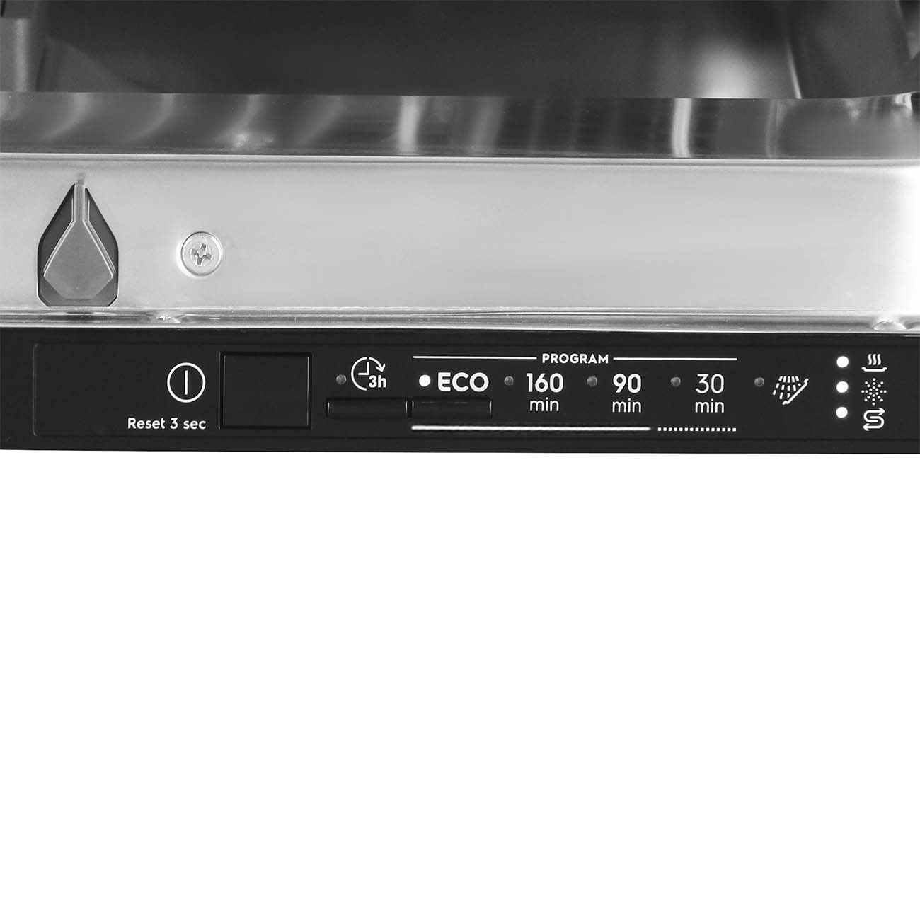 Панель управления компактно расположилась на боковой рамке откидной дверцы. Она представлена кнопочным меню и набором индикаторов с наглядными символами. Выбирайте один из пяти режимов, в том числе мини-программу длительностью всего 30 минут, или активируйте отложенный старт вплоть до трёх часов.