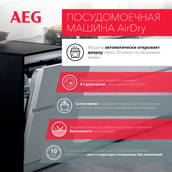 Как приятно достать чистую, идеально сухую посуду из машины и сразу убрать ее в шкаф. Но с обычной технологией сушки на посуде могут оставаться капли воды, особенно на пластиковых и стеклянных предметах. Многие потребители для улучшения качества сушки приоткрывают дверь посудомойки по окончании программы. Технология AirDry автоматически открывает дверь посудомойки после окончания фазы сушки. Большого количества пара уже нет к этому времени, поэтому вы можете быть спокойны за кухонный гарнитур. Посуда и камера посудомойки полностью высыхают, что защищает от развития бактерий и появления неприятного запаха.