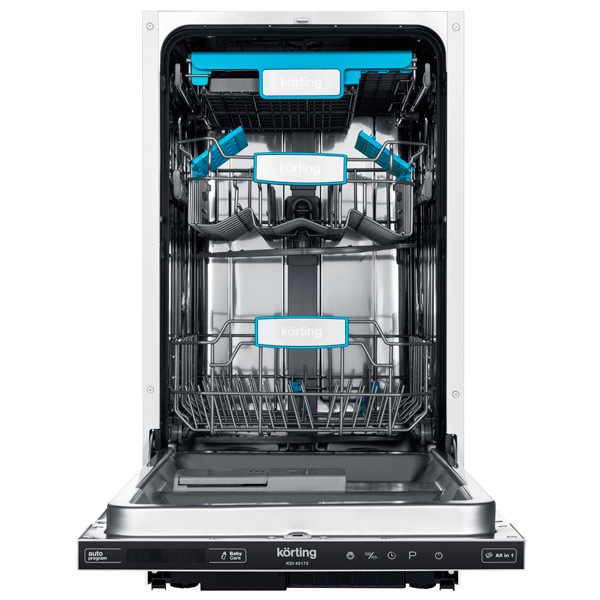 Встраиваемая посудомоечная машина Korting KDI 45175 шириной всего 45 сантиметров отлично впишется в небольшую по площади кухню и сможет за один раз отмыть десять комплектов посуды. Внутреннее пространство подсвечивается яркими лампами. Тарелки и кружки раскладываются по трём выкатным корзинам, высоту которых можно регулировать.