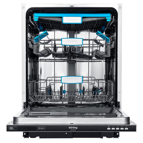 Встраиваемая посудомоечная машина Korting KDI 60165 шириной 60 сантиметров отлично впишется в небольшую по площади кухню и сможет за один раз отмыть 14 комплектов посуды. Внутреннее пространство подсвечивается яркими лампами. Тарелки и кружки раскладываются по трём выкатным корзинам, высоту которых можно регулировать.