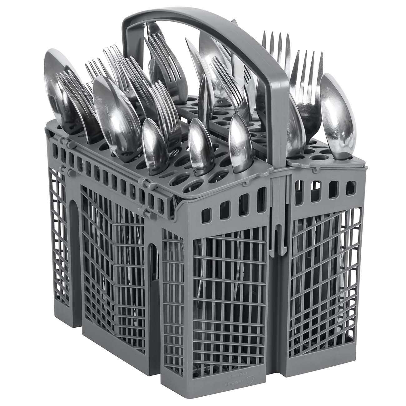 Для столовых приборов предусмотрен специальный лоток. Верхняя корзина предназначена для чашек, кружек, соусниц и блюдец. Нижний короб используйте для размещения больших тарелок, крышек и противней. Зафиксировать крупные кастрюли и сковороды помогут складные скобы.