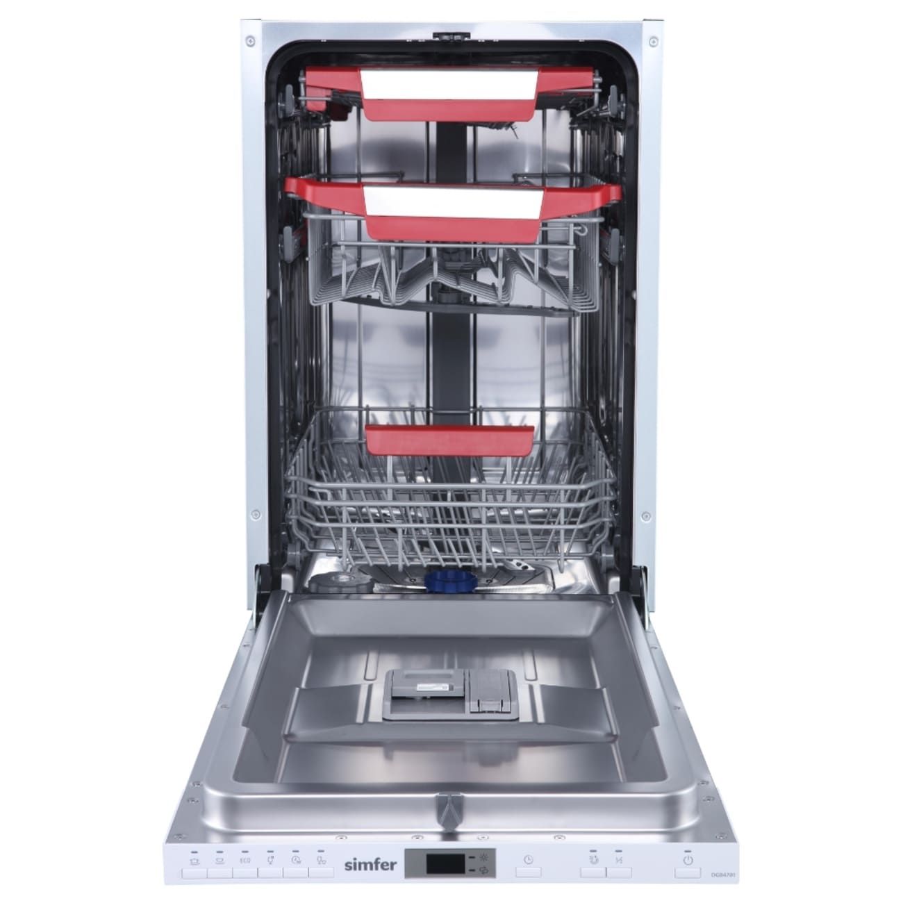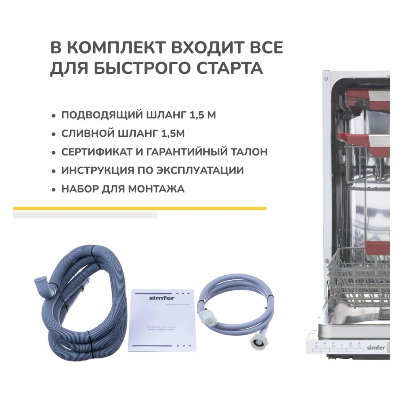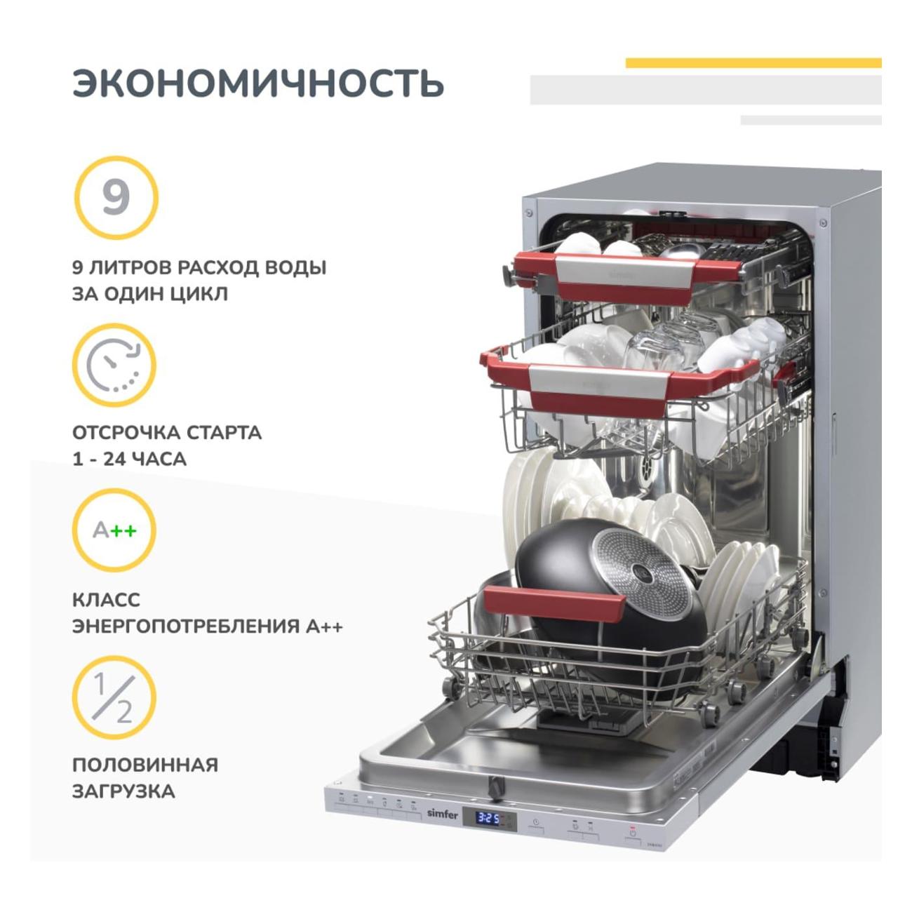 Встраиваемая посудомоечная машина Simfer DGB4701 шириной 45 см вмещает в себя до десяти комплектов посуды, оснащена шестью программами и шестью температурными режимами для мытья посуды разного типа и уровня загрязненности. Интенсивная программа отмоет большое количество жира, мини-программа за 30 минут освежит тарелки и чашки. Предусмотрен также режим для мытья тонкого стекла.