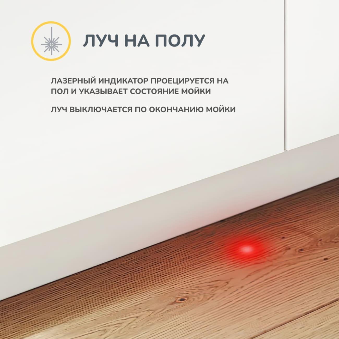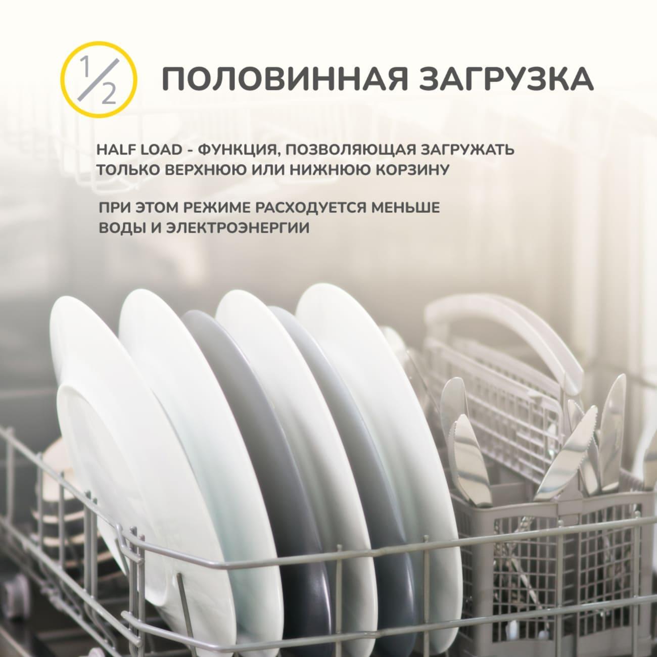 Потребление воды за цикл не превышает 9 л. Расход электроэнергии составляет 0,58 кВт*ч. Мощность модели — 2100 Вт. Машина оборудована защитой от протечек: при возникновении неполадок подача воды прекращается. В комплекте поставляется удобная воронка для засыпания соли. Вес посудомоечной машины составляет 30,5 кг.