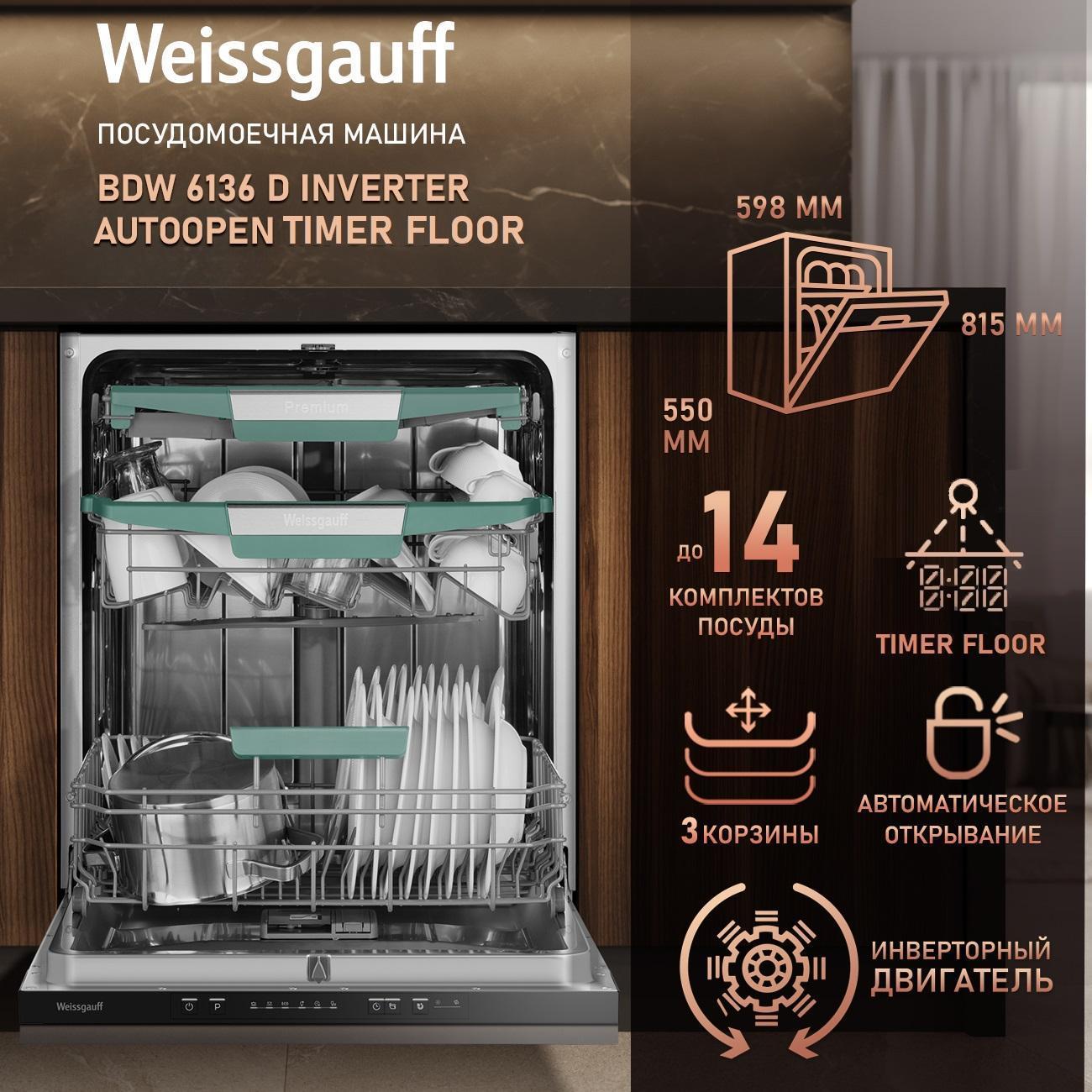 Вы можете купить Встраиваемая посудомоечная машина Weissgauff 6136 D Inverter Autoopen Timer Floor в магазинах М.Видео по доступной цене. Встраиваемая посудомоечная машина Weissgauff 6136 D Inverter Autoopen Timer Floor: подробное описание, фото и отзывы реальных покупателей, характеристики, возможность скачать инструкции и подобрать аксессуары.