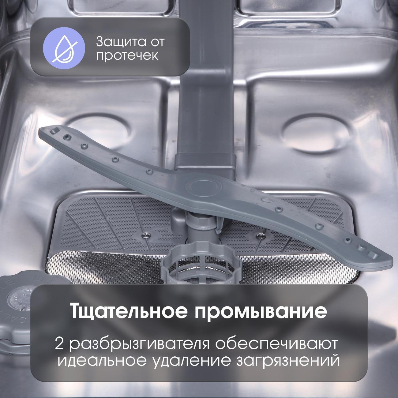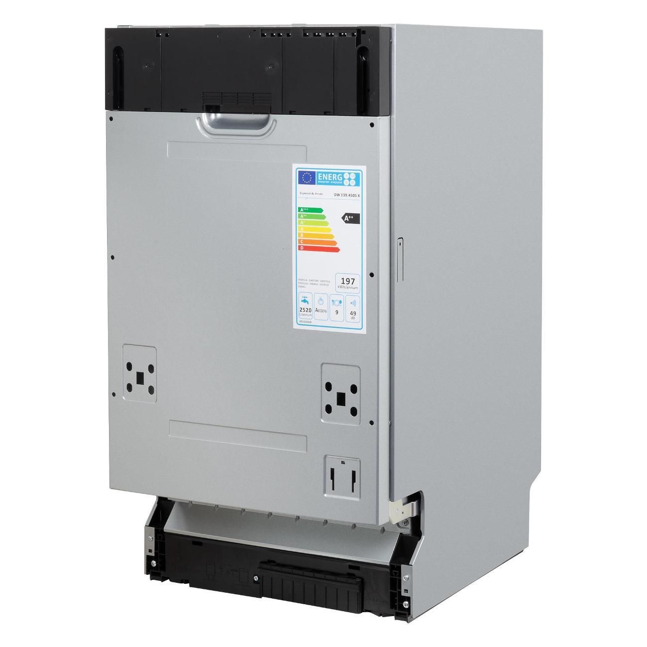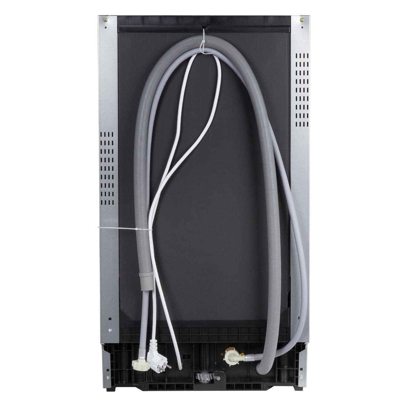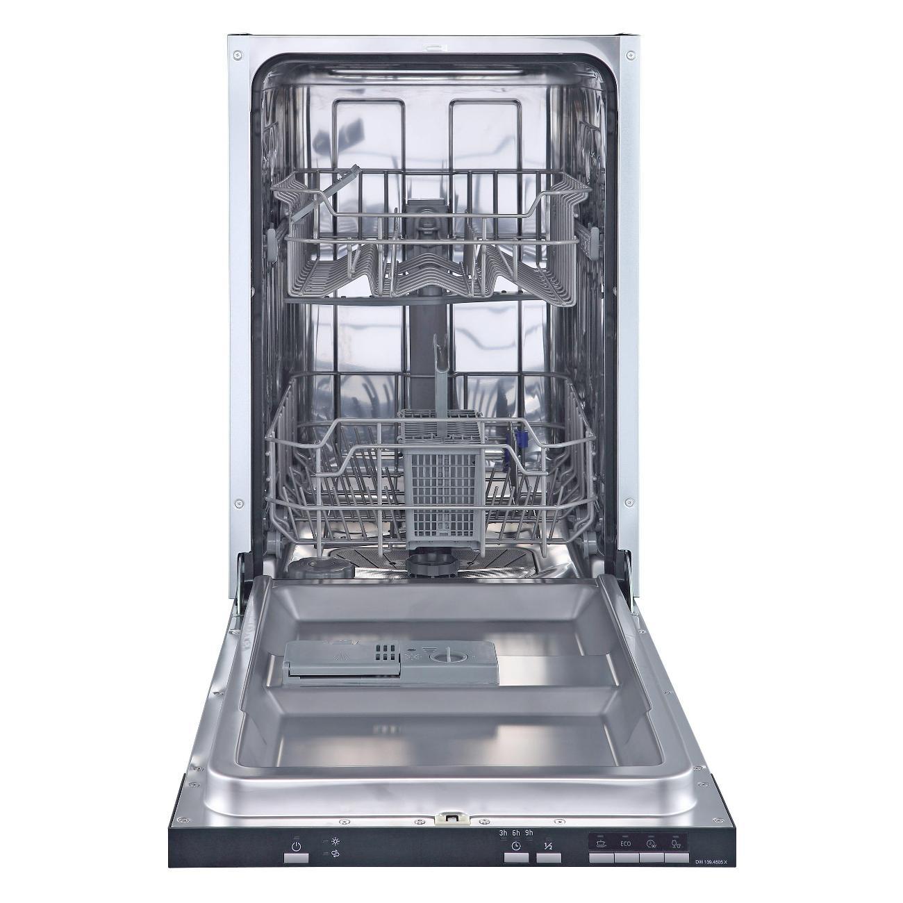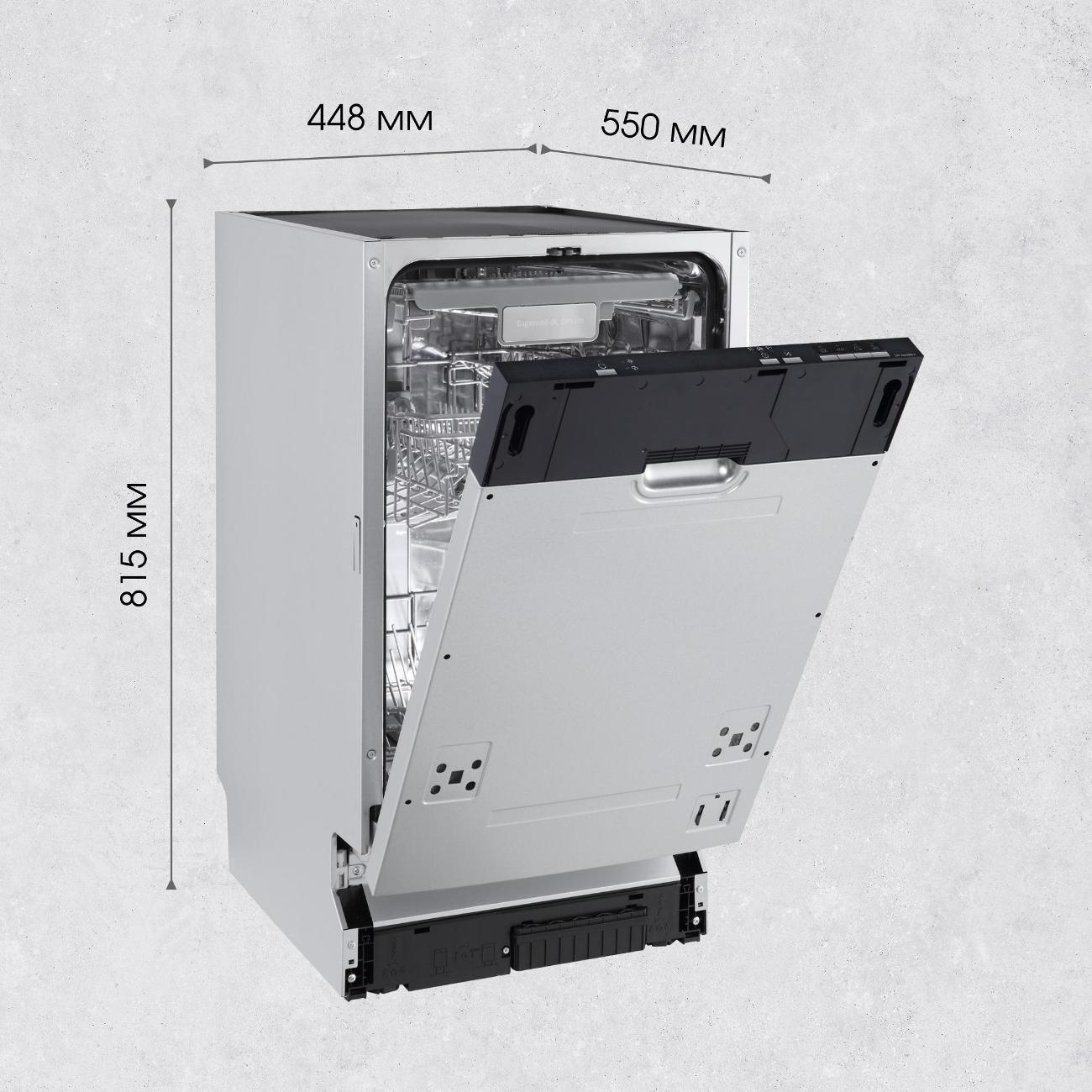 Встраиваемая посудомоечная машина шириной 45 см Zigmund & Shtain DW 139.4505 X защищена от протечек — в случае протекания электроприбор автоматически выключается, что увеличивает безопасность применения. Модель потребляет за один цикл 0,69 кВт*ч электроэнергии и расходует до 16,5 л воды. Устройство рассчитано на 10 комплектов посуды. Короб регулируется по высоте, что позволяет размещать утварь любых габаритов. Предусмотрены полки для кружек.