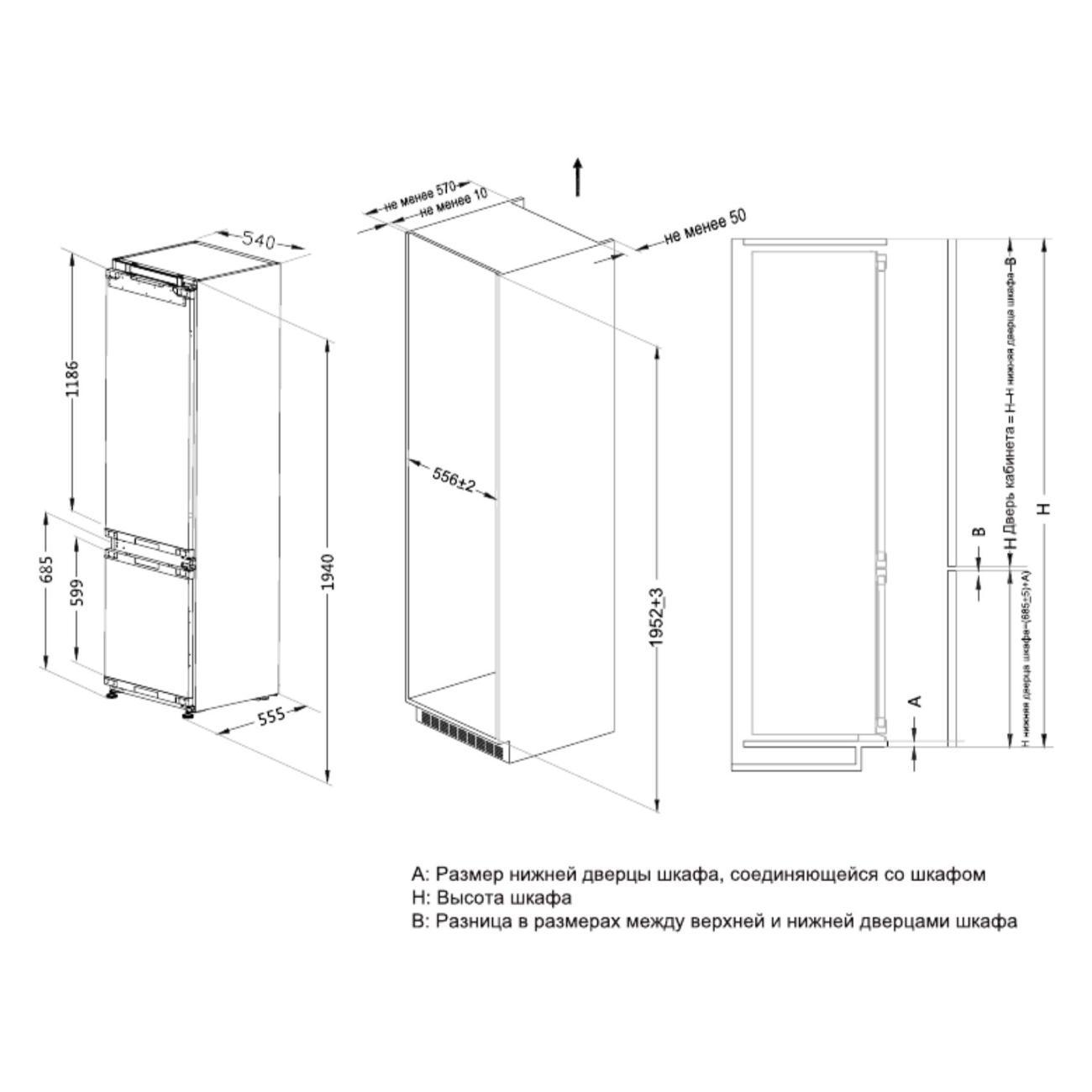 Объем морозильной камеры, расположенной в нижней части холодильника, равен 62 л. Внутри отделения находятся три отделения с прозрачными ящиками. За сутки может заморозиться до 3,5 кг продуктов. Управление моделью осуществляется при помощи электронной панели. При необходимости дверцу из нержавеющей стали можно перенавесить. Класс энергопотребления — А+. В год расходуется до 350 кВт*ч. При оставлении двери открытой срабатывает звуковой сигнал. В случае отключения питания холодильник может работать в автономном режиме до 24 часов. В комплект входят подставка для яиц, ванночки для льда, поднос для замораживания. Габаритные размеры холодильника — 545х1937х540 мм, вес — 65 кг.