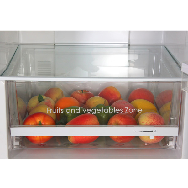 Объём холодильной и морозильной камер составляет 179 л и 62 л соответственно. Холодильное отделение оборудовано 5 полками и ящиком для хранения овощей и фруктов, в морозильнике присутствуют 3 ящика, обеспечивающие раздельное хранения сырых продуктов и полуфабрикатов.