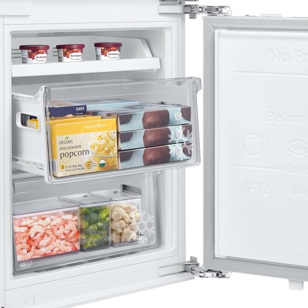 Встраиваемый холодильник комби Samsung BRB267154WW предназначен для установки в нишу или шкаф габаритами 1780х562х580 мм (высота/ширина/глубина). Крепление фасада — на фиксированных направляющих. Прибор работает на базе инверторного компрессора, который ежегодно потребляет до 238 кВт*ч энергии (класс энергоэффективности А+). Применяемый в системе хладагент изобутан безопасен для окружающей среды. Уровень шума во время работы не превышает 35 дБ.