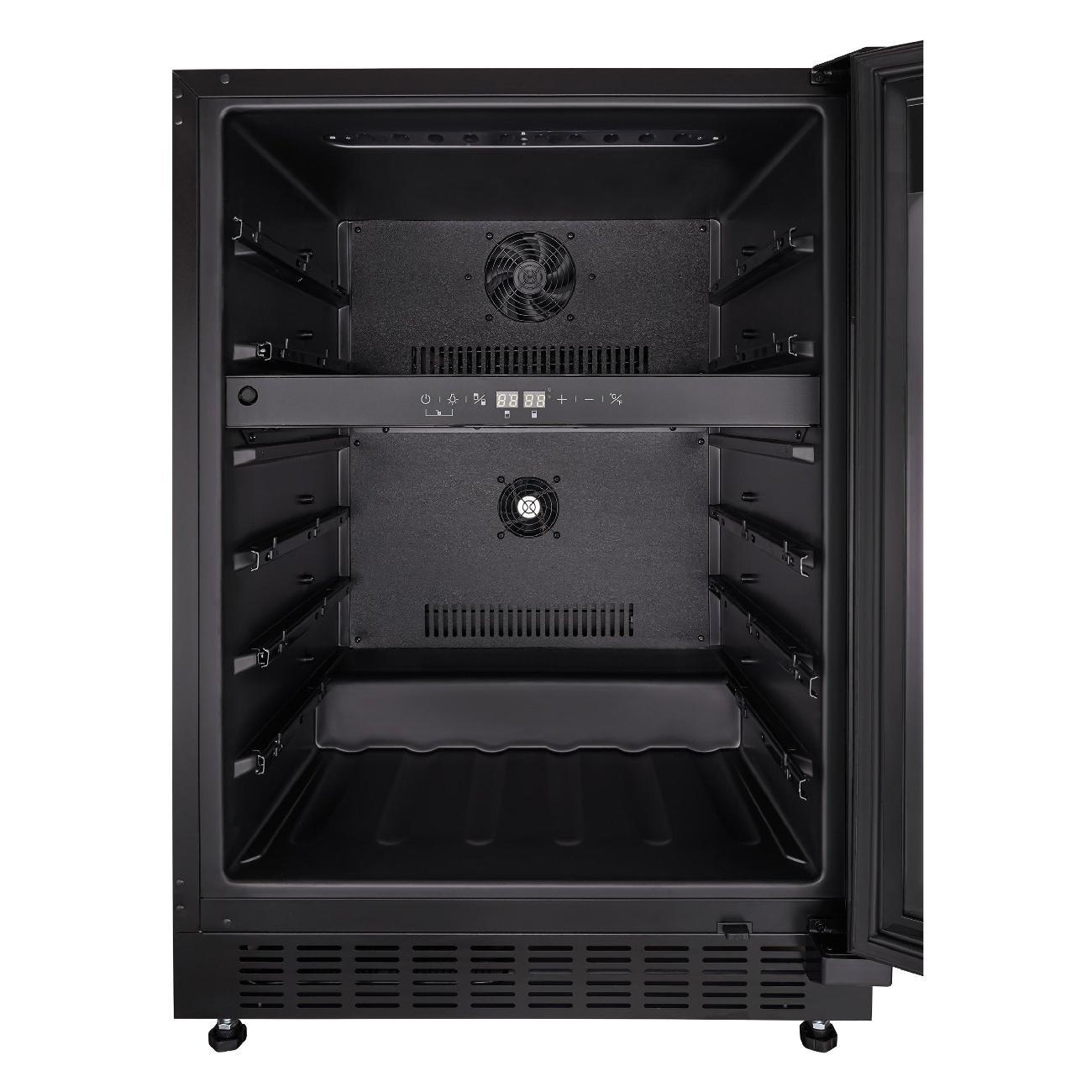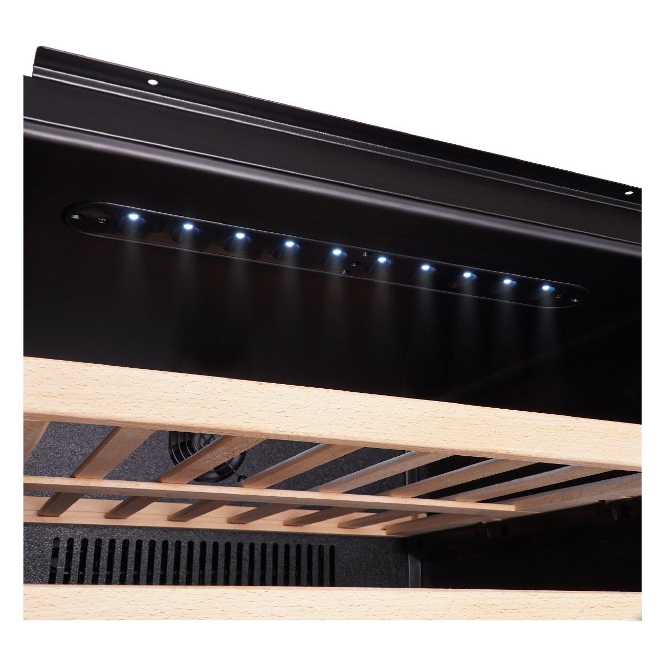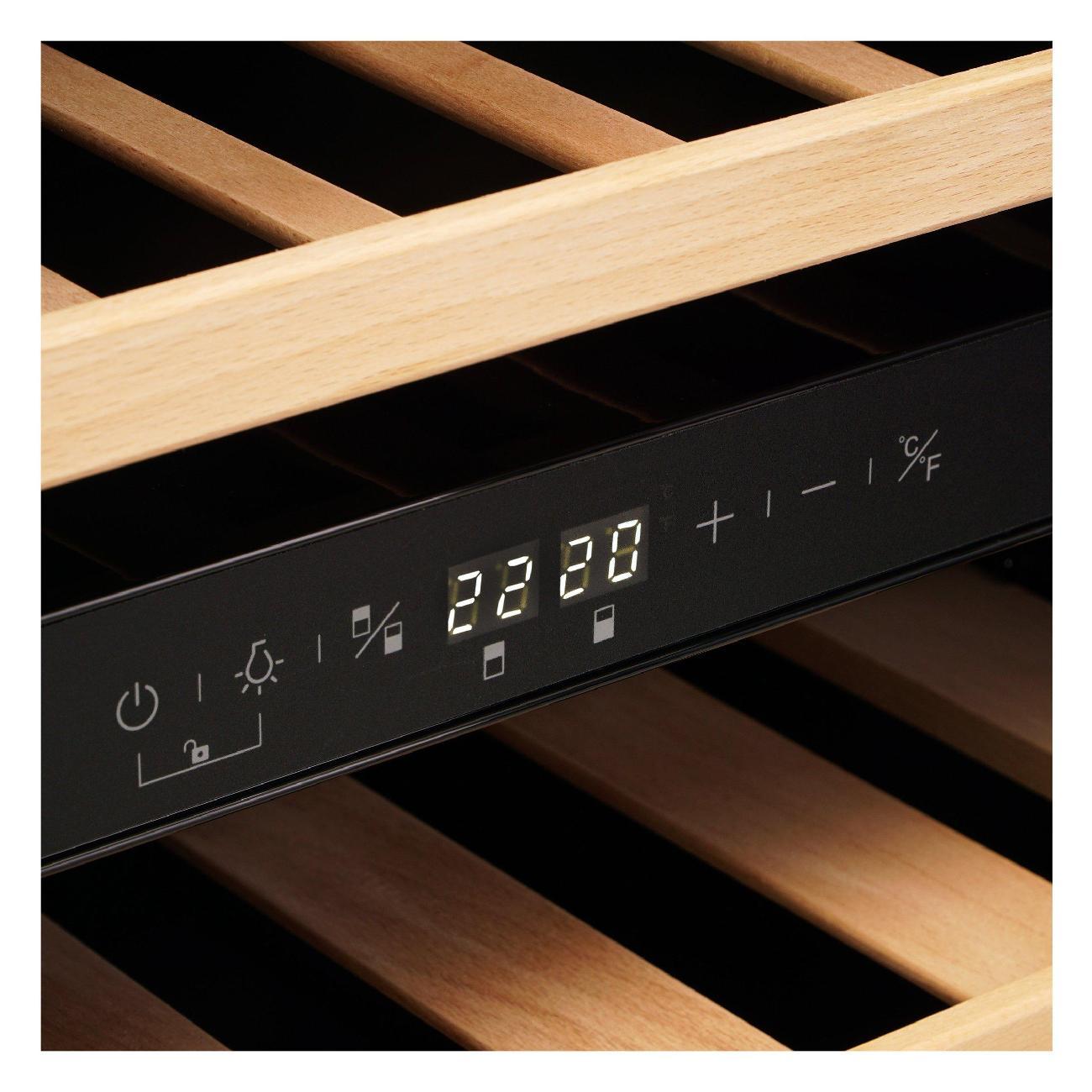 Камера оснащена пятью полками из натурального бука, которые регулируют уровень влажности и позволяют разместить бутылки в горизонтальном положении без повреждения этикеток. В двух температурных зонах можно индивидуально настроить температуру от 5°С до 22°С для хранения любых сортов вина. Вентилятор способствует равномерному распределению воздуха в камере для охлаждения всех уровней.