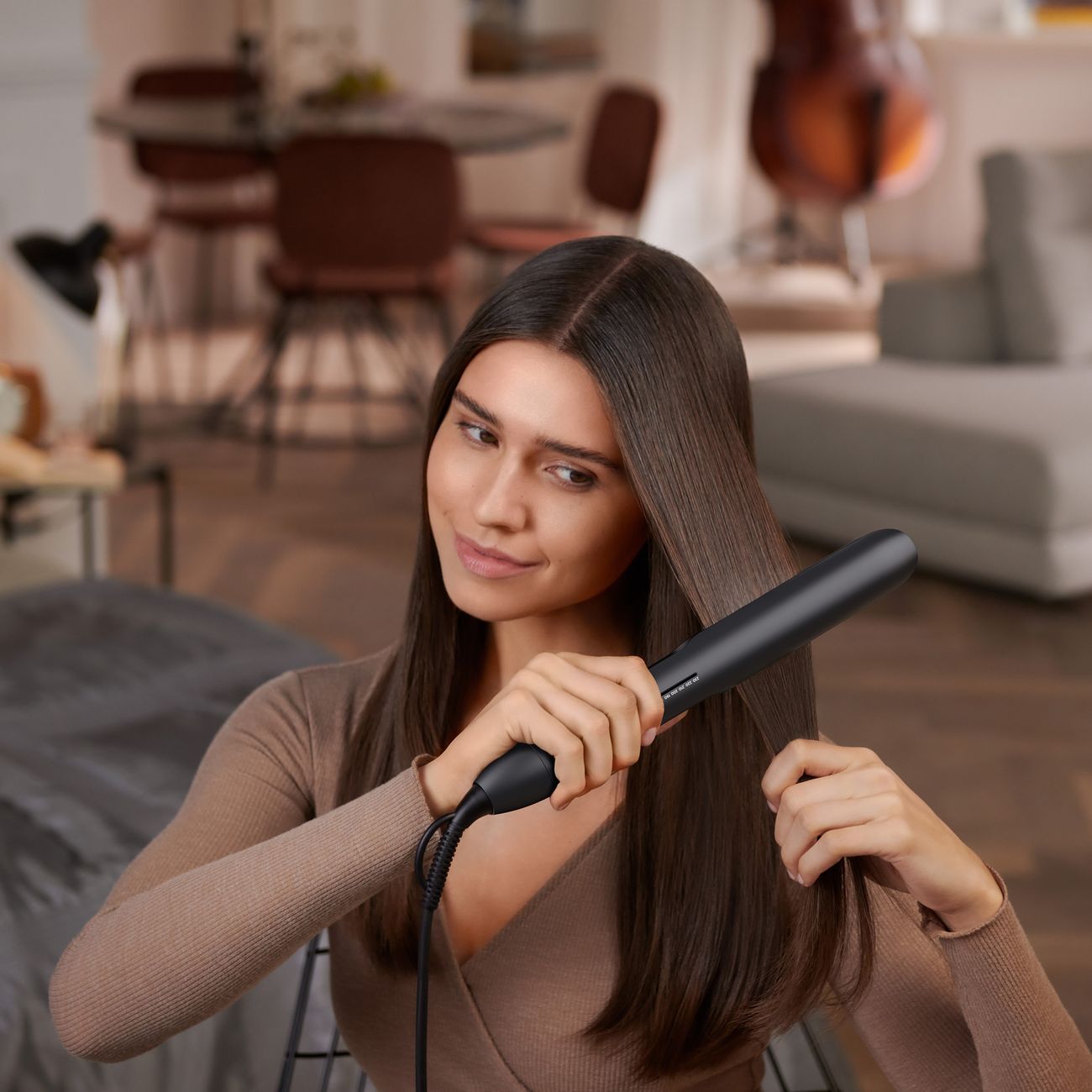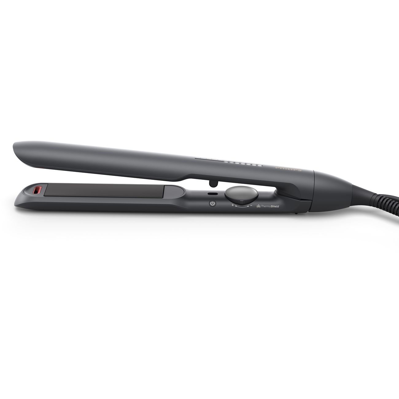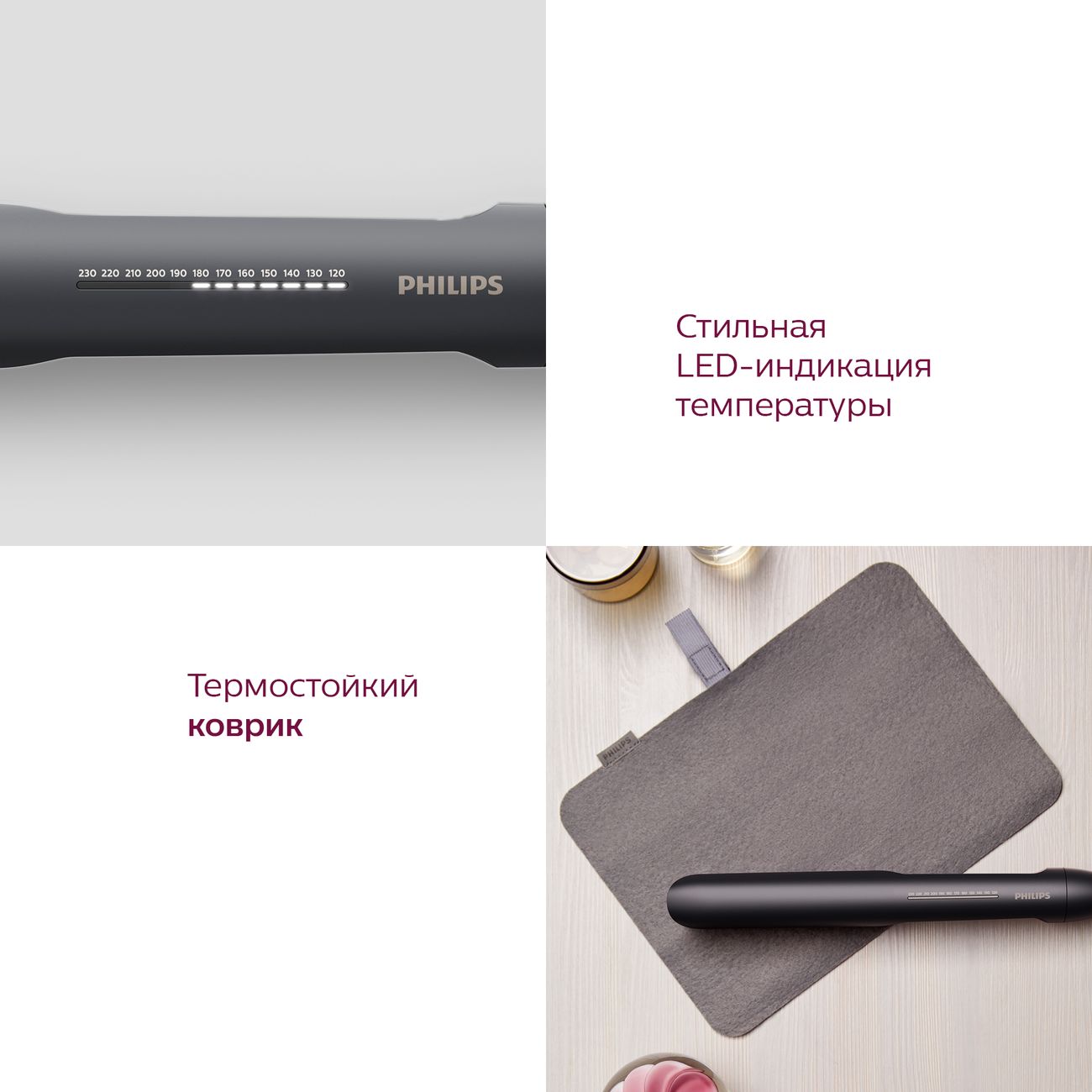 Стайлер Philips BHS510/00 оснащен гладкими плавающими пластинами, которые обеспечивают легкое скольжение. Ионизация снимает статическое электричество, а интегрированная система ThermoShield защищает волосы от перегрева.