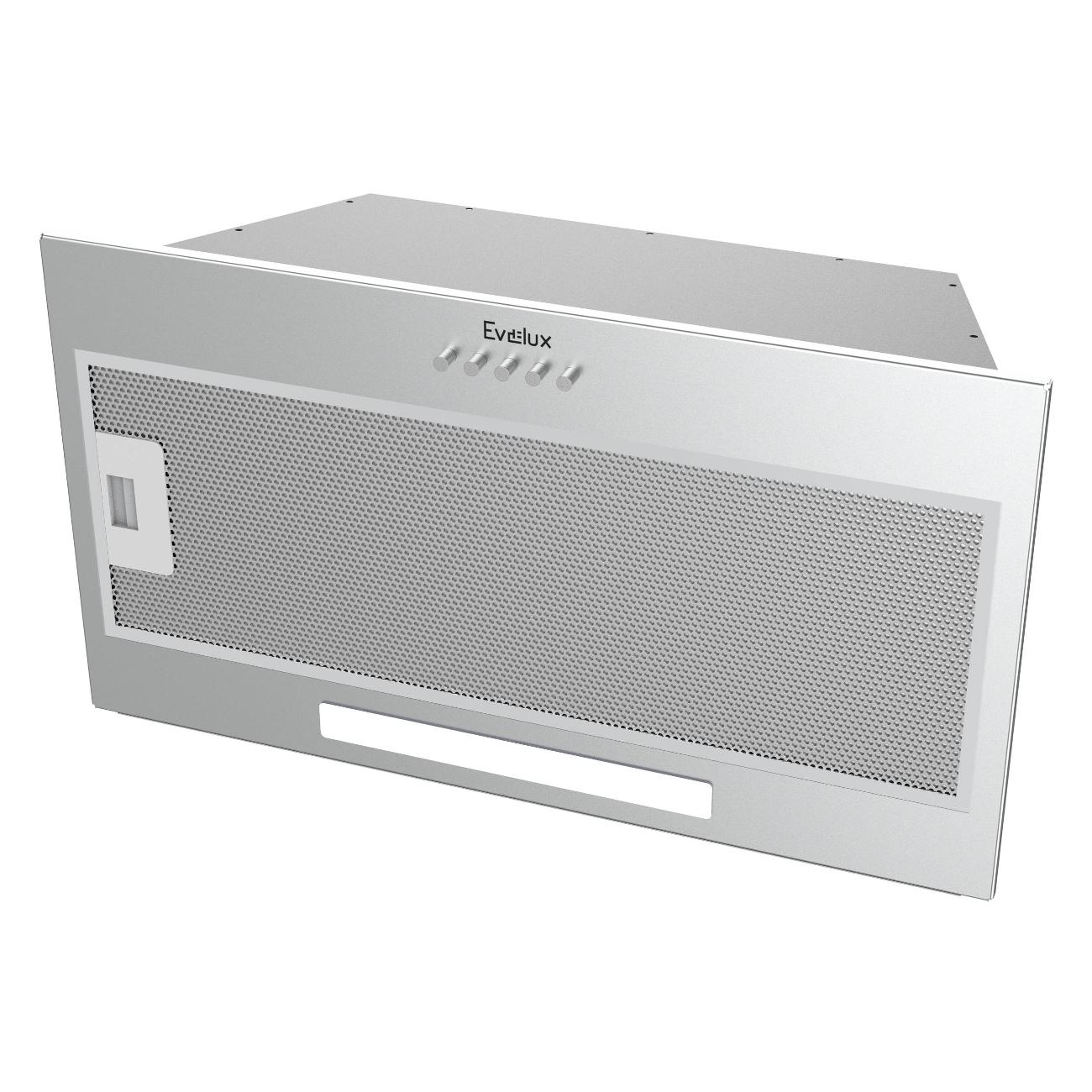 Вытяжка Evelux Integral 60 X с корпусом из нержавеющей стали — встраиваемая модель размером 170х520х290 мм. Производительность достигает 860 куб. м/ч, рекомендованная площадь помещения — до 20 кв. м.