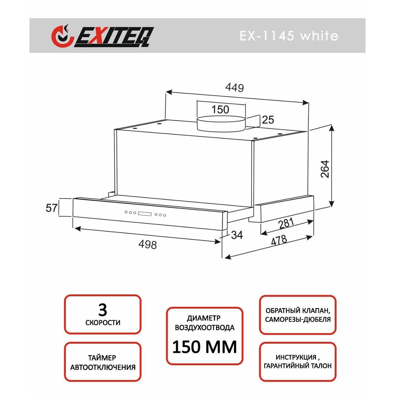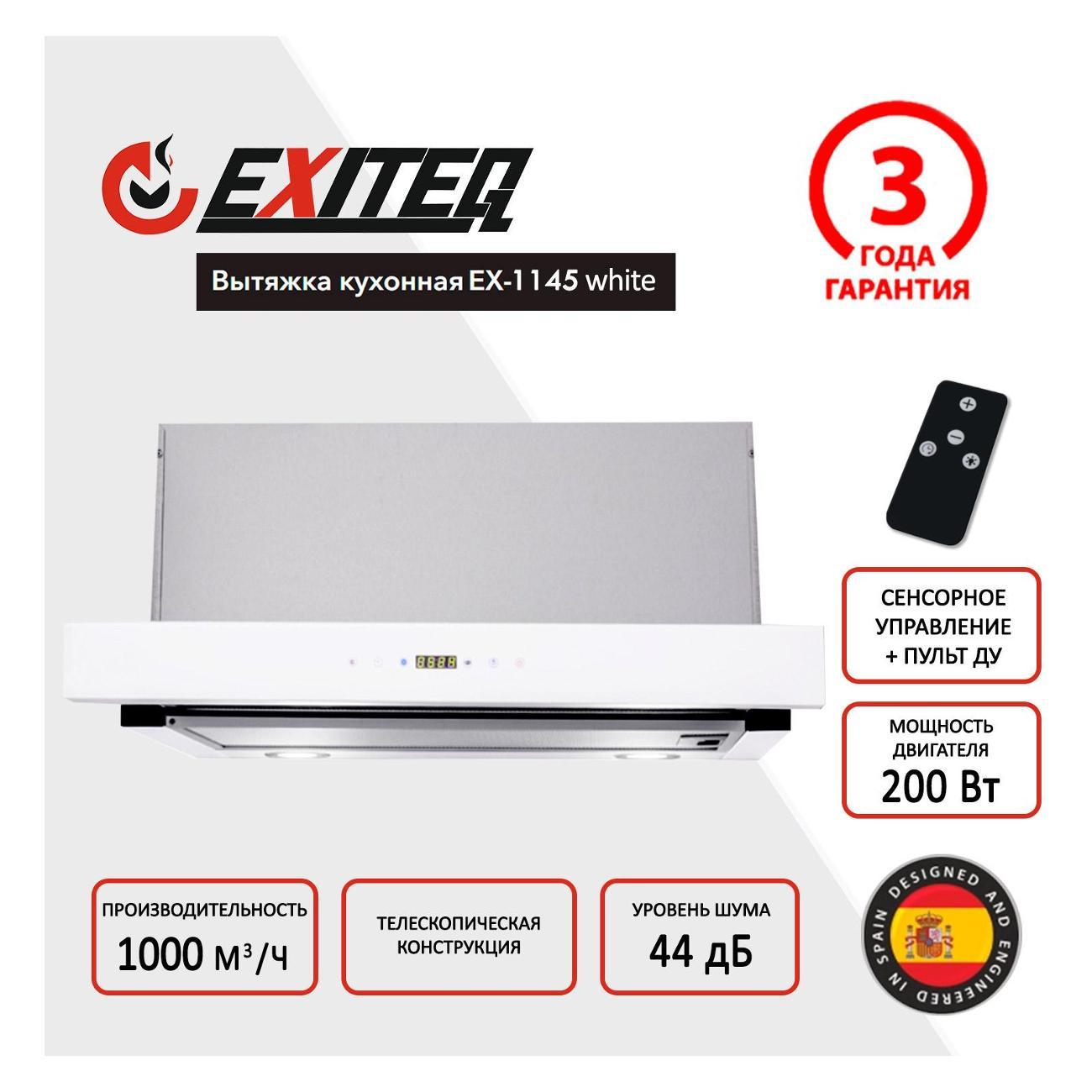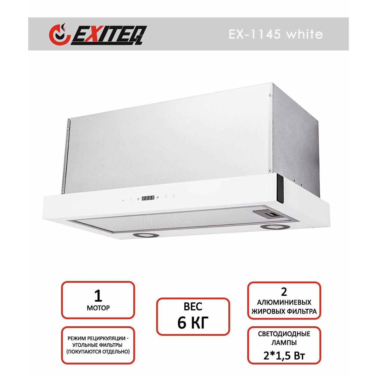 Вытяжка Exiteq EX-1145 шириной 50 см подходит для кухонных помещений площадью до 25 м². Производительность устройства в режиме отвода и рециркуляции достигает 1000 м³/ч. Прибор устанавливается над газовой плитой на расстоянии 75 см, над электрической — 65 см. За управление функциями отвечает сенсорная панель и пульт ДУ.