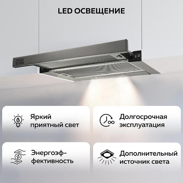 LED-лампы, расположенные спереди, ярко освещают варочную поверхность. За счет выдвижного козырька площадь вытяжки увеличивается вдвое. Максимальный уровень шума — 72 дБ. Размеры устройства — 18х60,3х28,7 см.