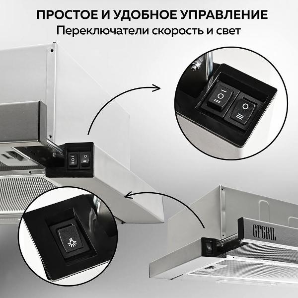 Вытяжка GFGril GF-HD100TIN в корпусе серебристого цвета устанавливается над газовой плитой на высоте 75 см, электрической — 65 см. Устройство рассчитано на использование в помещениях площадью до 20 м². Производительность модели — до 450 м³/ч.