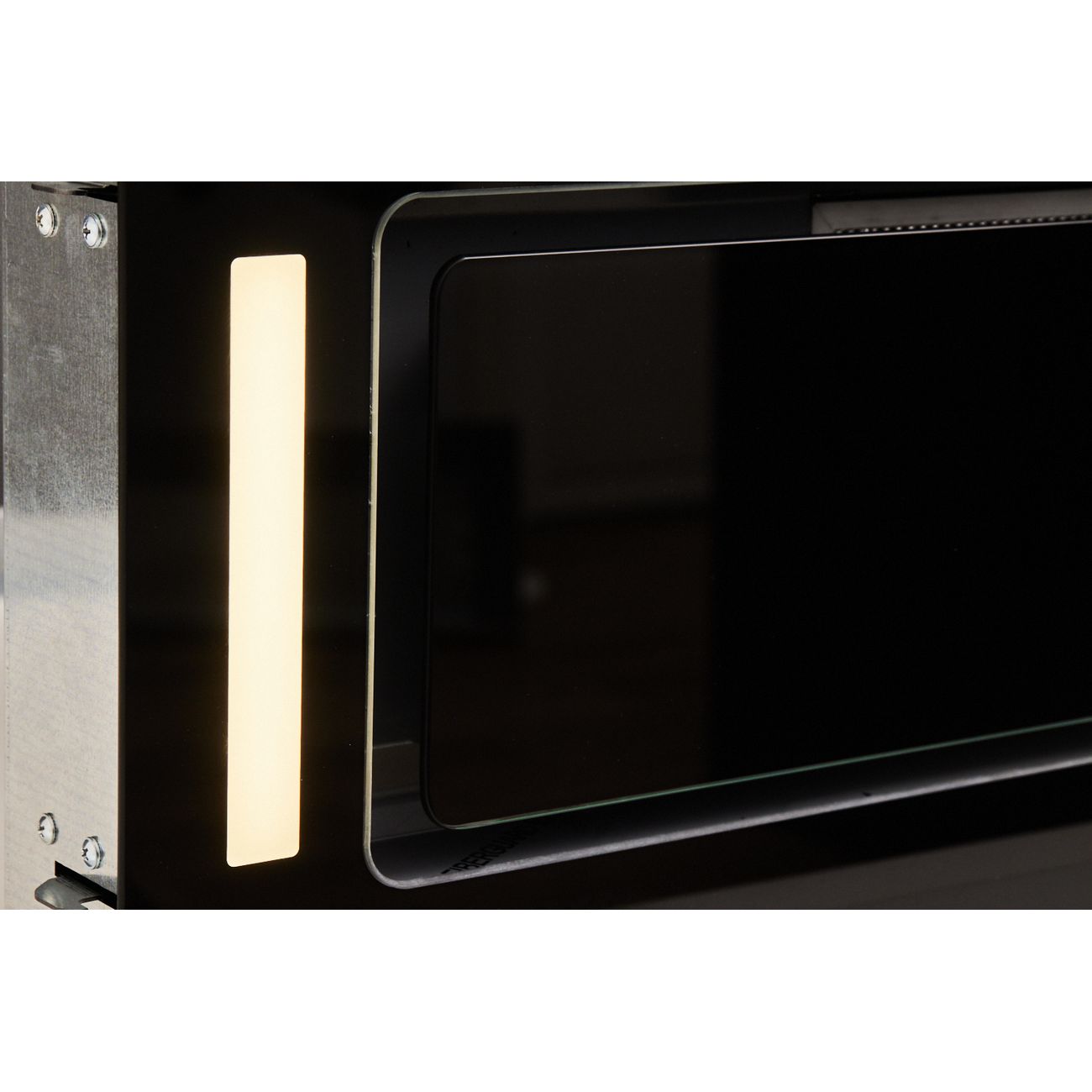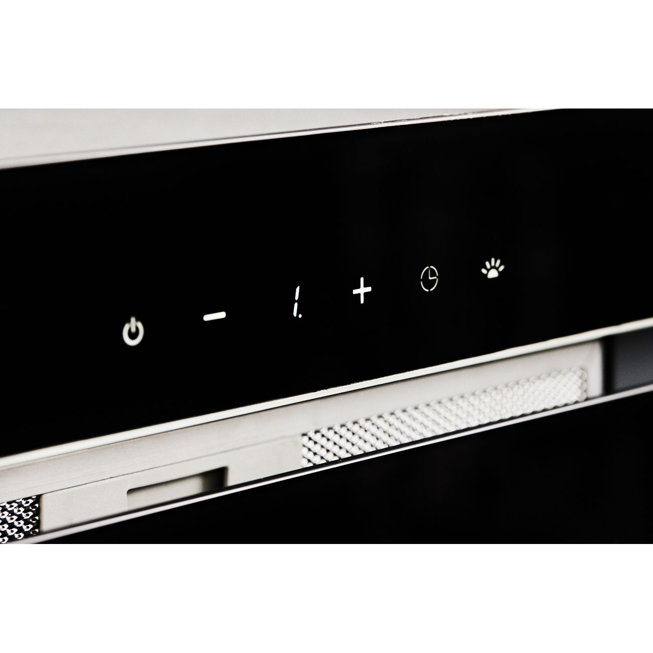 Производительность устройства — до 850 м³ воздуха в час. Она подходит для кухонь площадью до 15 м². Во время работы уровень шума не превышает 56 дБ. Управление обеспечивает сенсорная панель, спереди размещено LED-освещение. Корпус выполнен из нержавеющей стали. Размеры вытяжки — 30,8х79,2х32 см, вес — 11 кг.