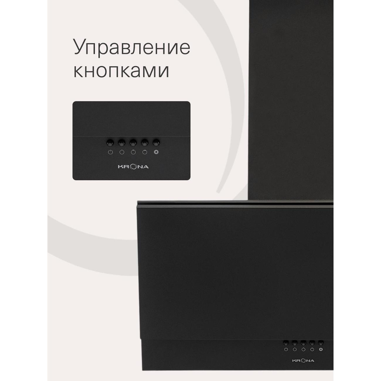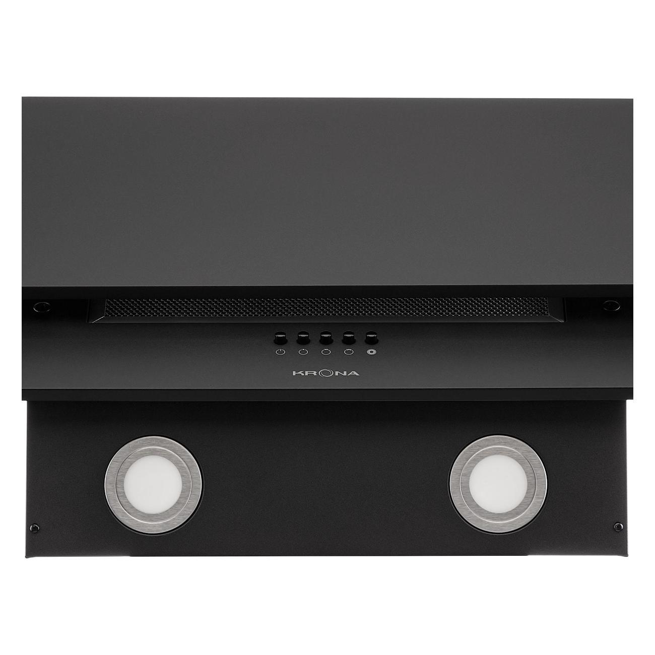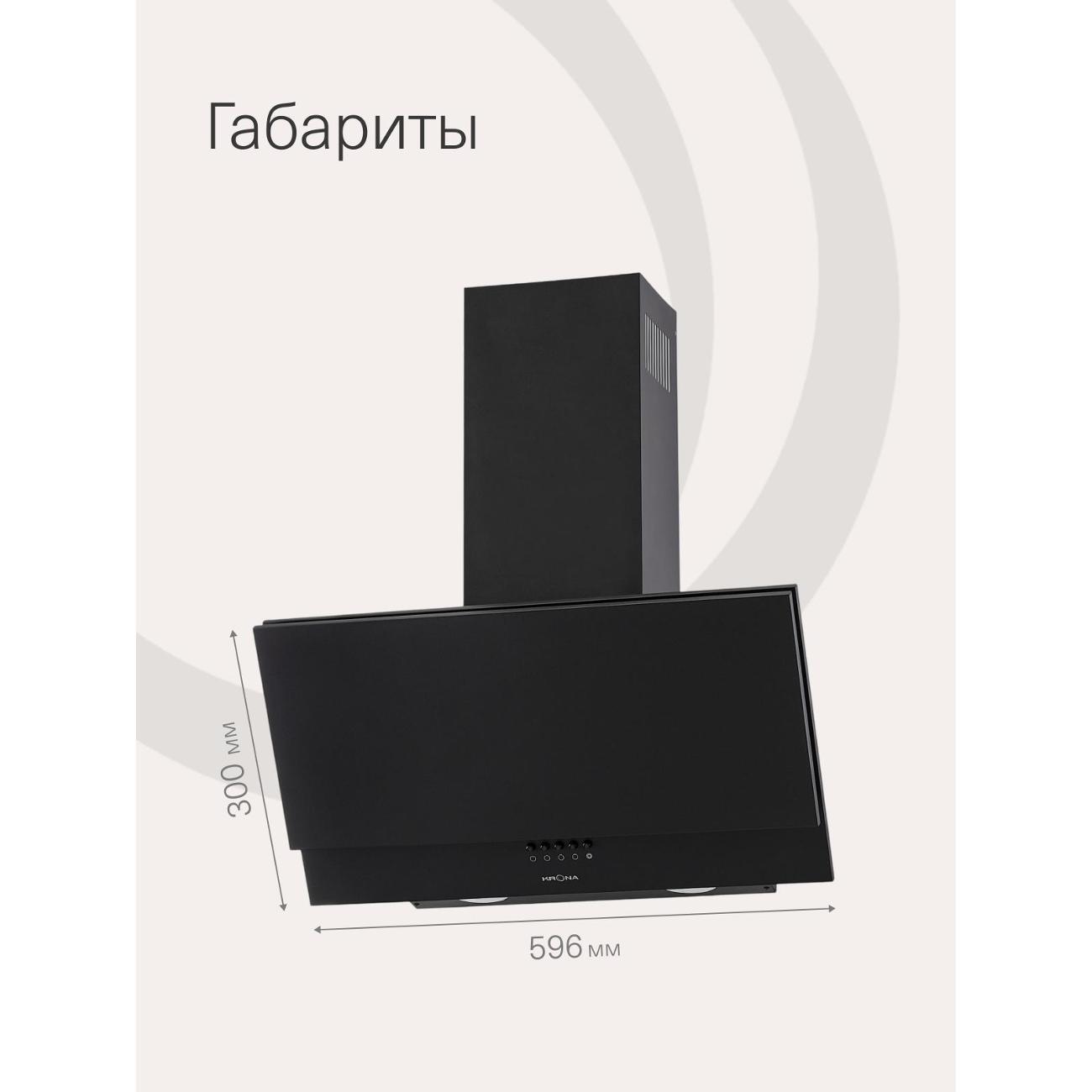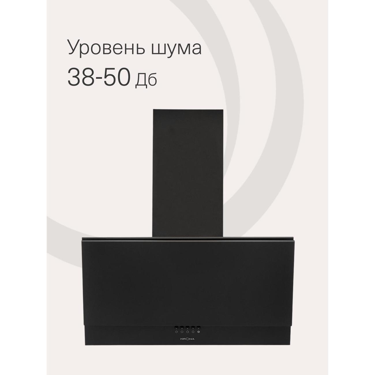 Вытяжка Krona Olly 600 Black PB оснащена одним мотором, который работает с уровнем шума не более 50 дБ. Производительность в режиме отвода воздуха — 500 м³/час. Функция рециркуляции будет доступна после установки угольных фильтров — их надо купить дополнительно. Модель эффективна на площади до 10 м².