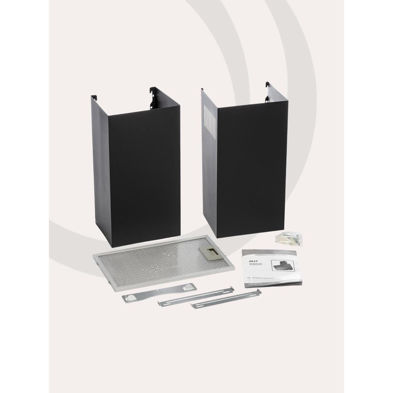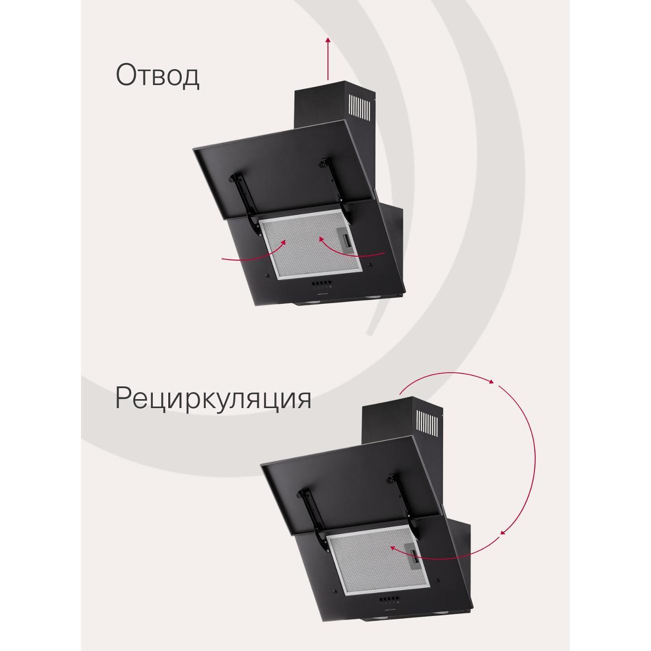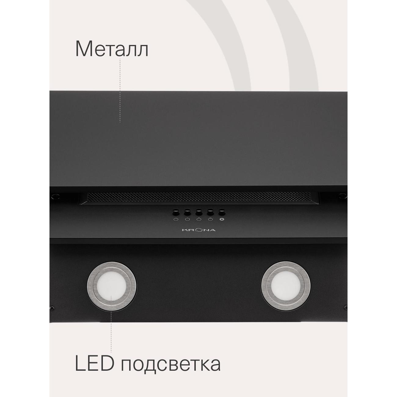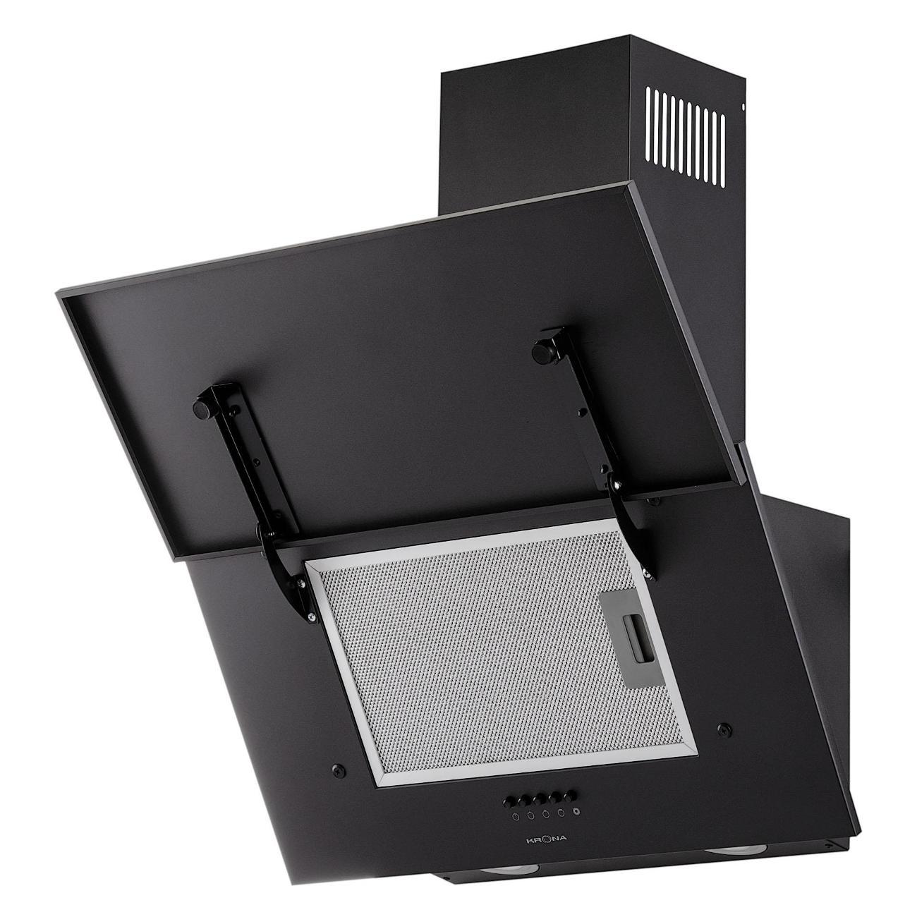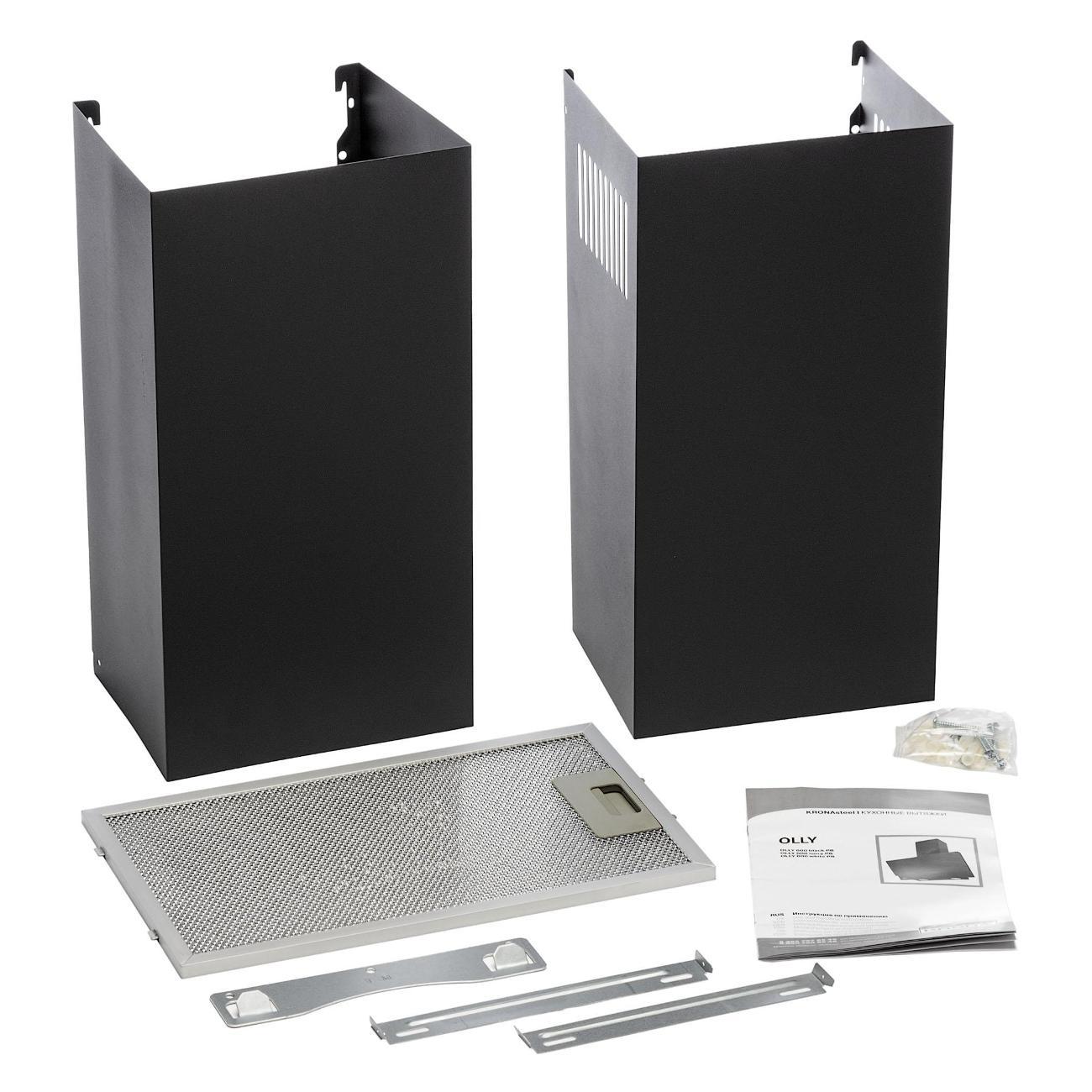 Вытяжка Krona Olly 600 Black PB оснащена одним мотором, который работает с уровнем шума не более 50 дБ. Производительность в режиме отвода воздуха — 500 м³/час. Функция рециркуляции будет доступна после установки угольных фильтров — их надо купить дополнительно. Модель эффективна на площади до 10 м².