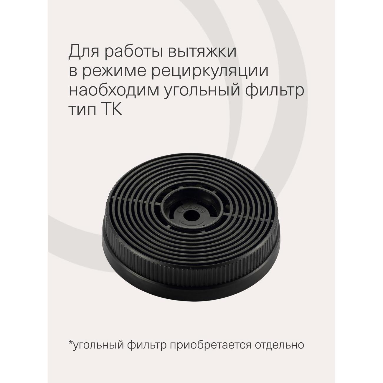 Функция рециркуляции будет доступна после установки угольных фильтров, которые продаются отдельно. Система управления — сенсорная, есть три скоростных режима. Корпус изготовлен из металла из стекла, на нем находятся индикаторы включения и выбранной мощности. В заднюю часть встроена LED-подсветка, которая помогает следить за тем, что происходит на варочной поверхности. Размеры — 31х89,5х106,1 см, вес — 11,9 кг.
