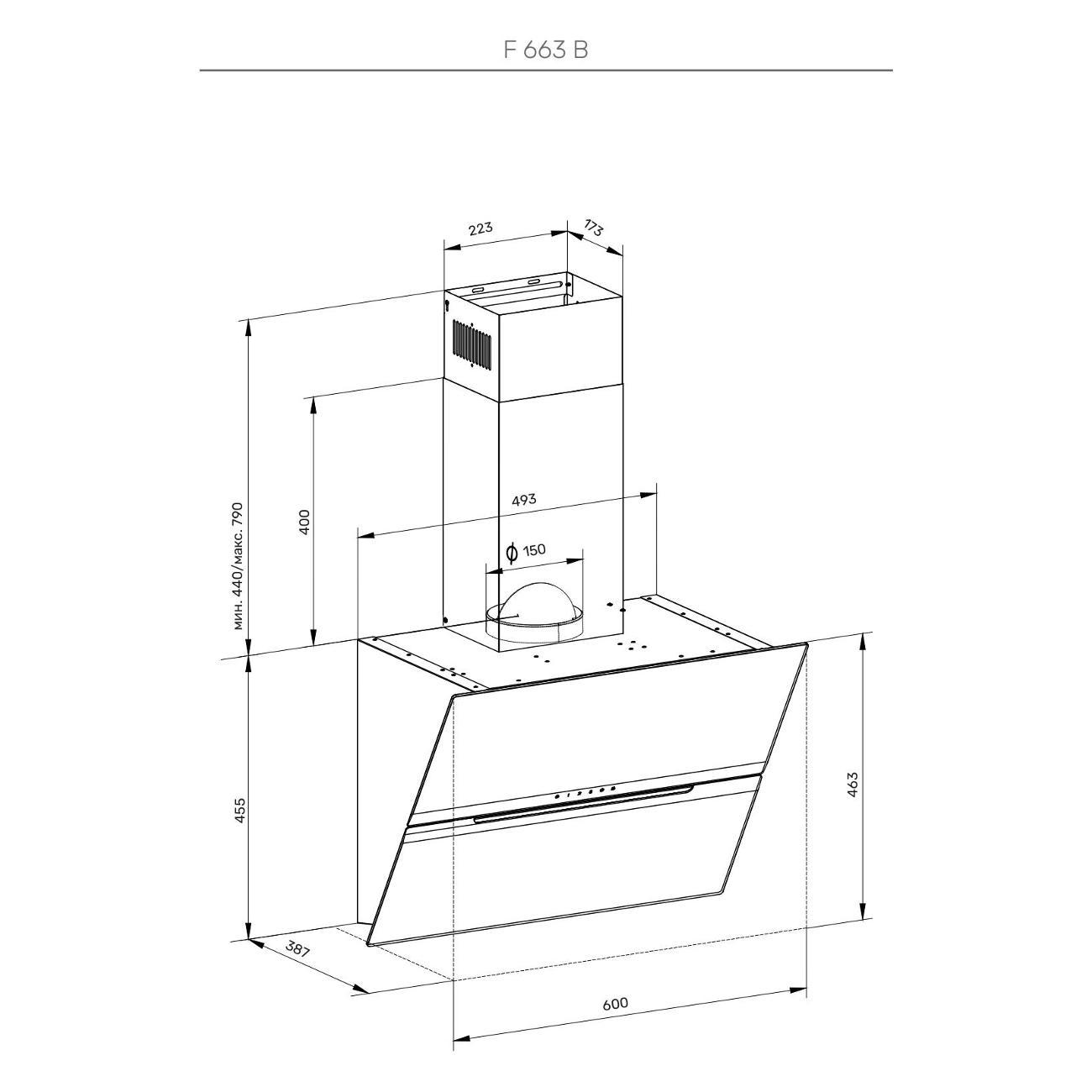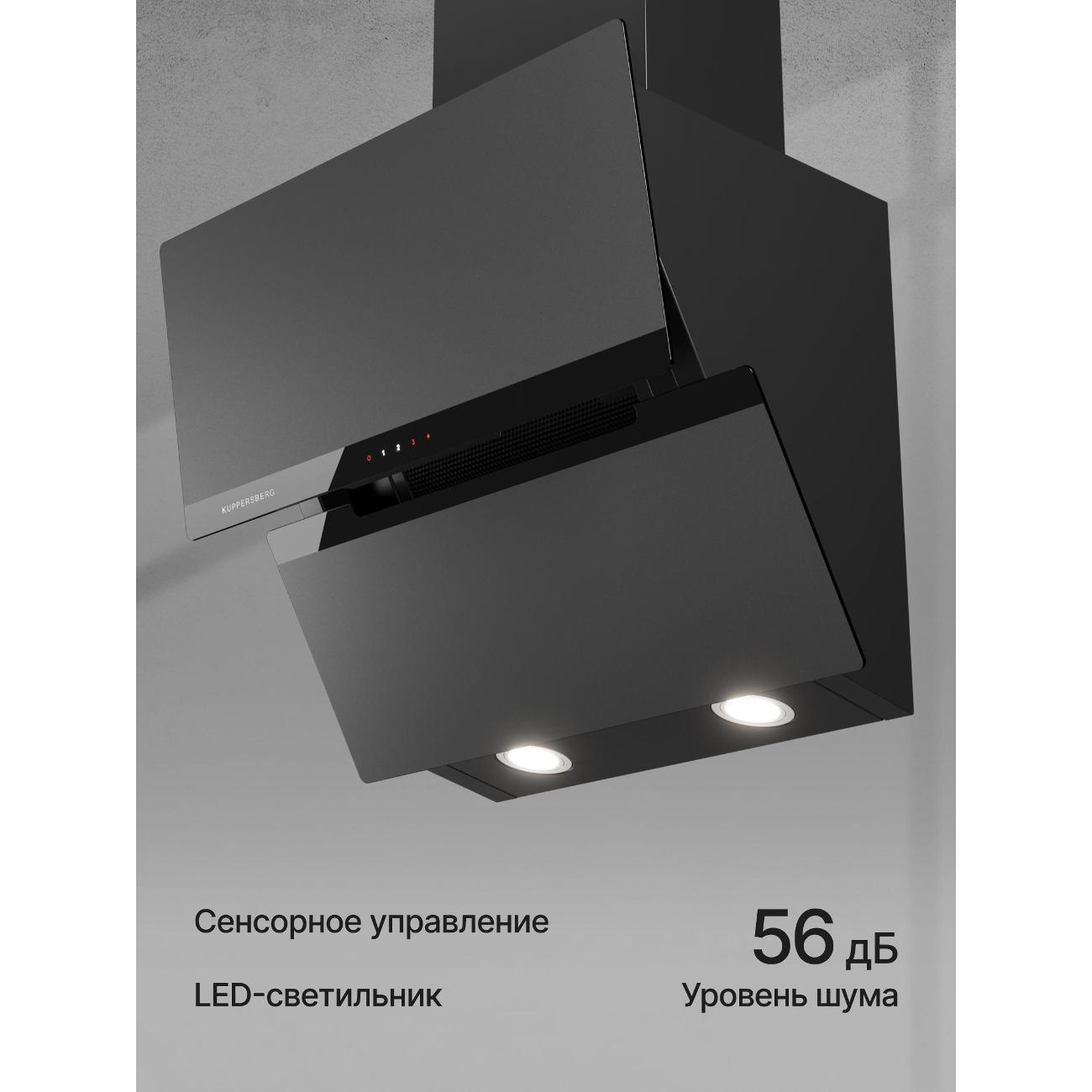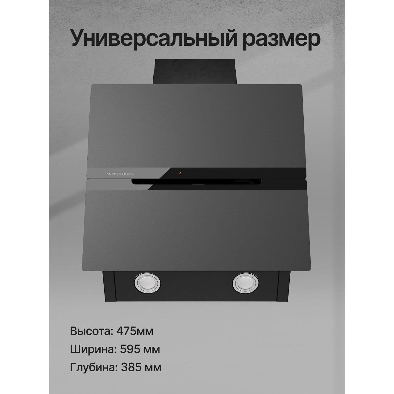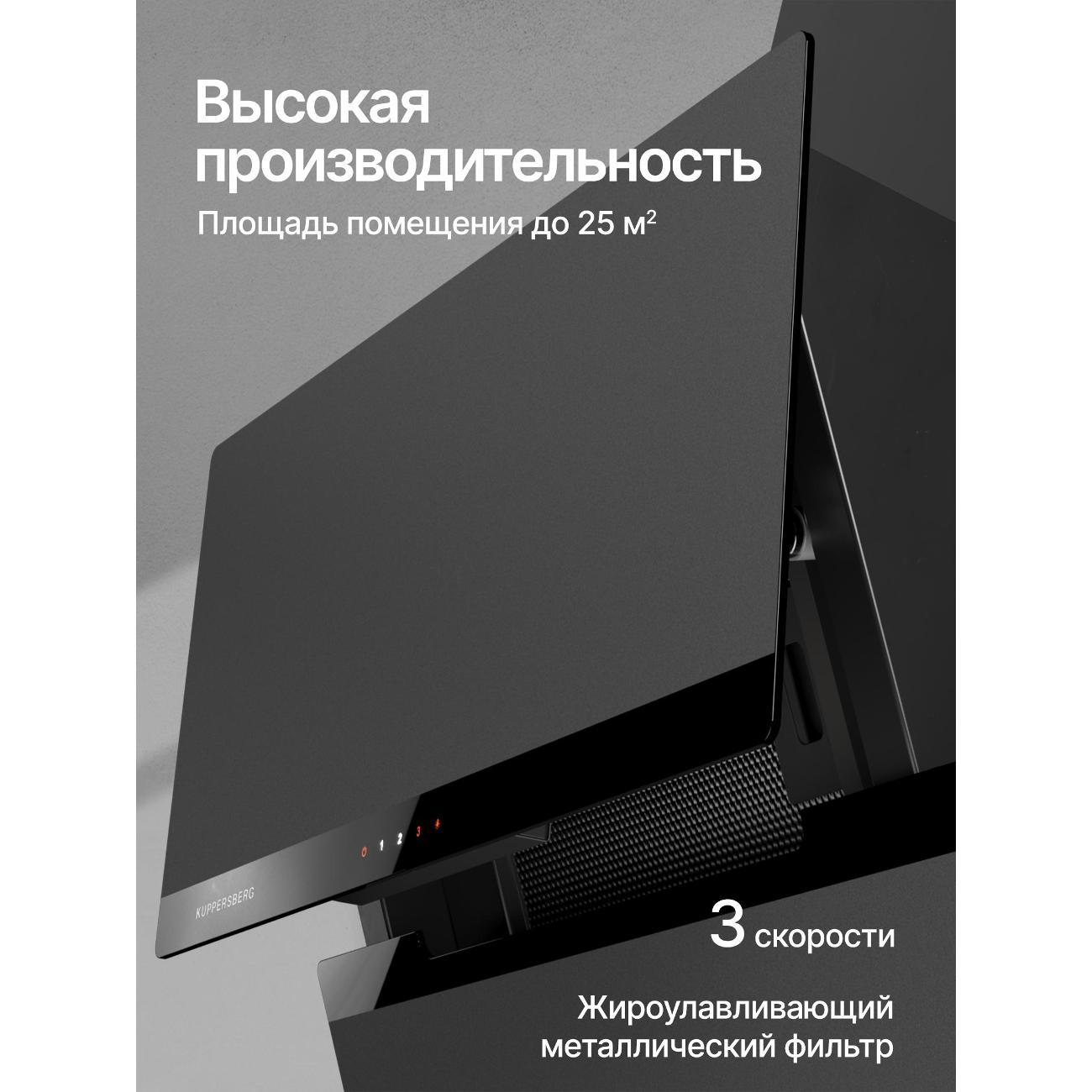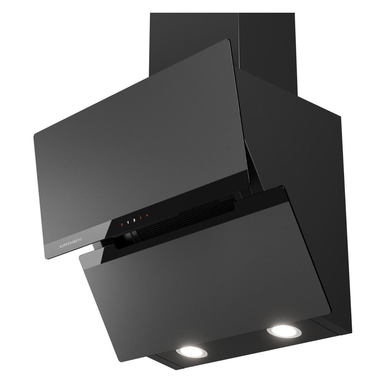 Вытяжка Kuppersberg F 663 B из коллекции High-Tech имеет наклонную переднюю панель — такая конструкция визуально облегчает прибор. Модель можно установить на высоте 65 см над электрической плитой или 75 см над газовой.