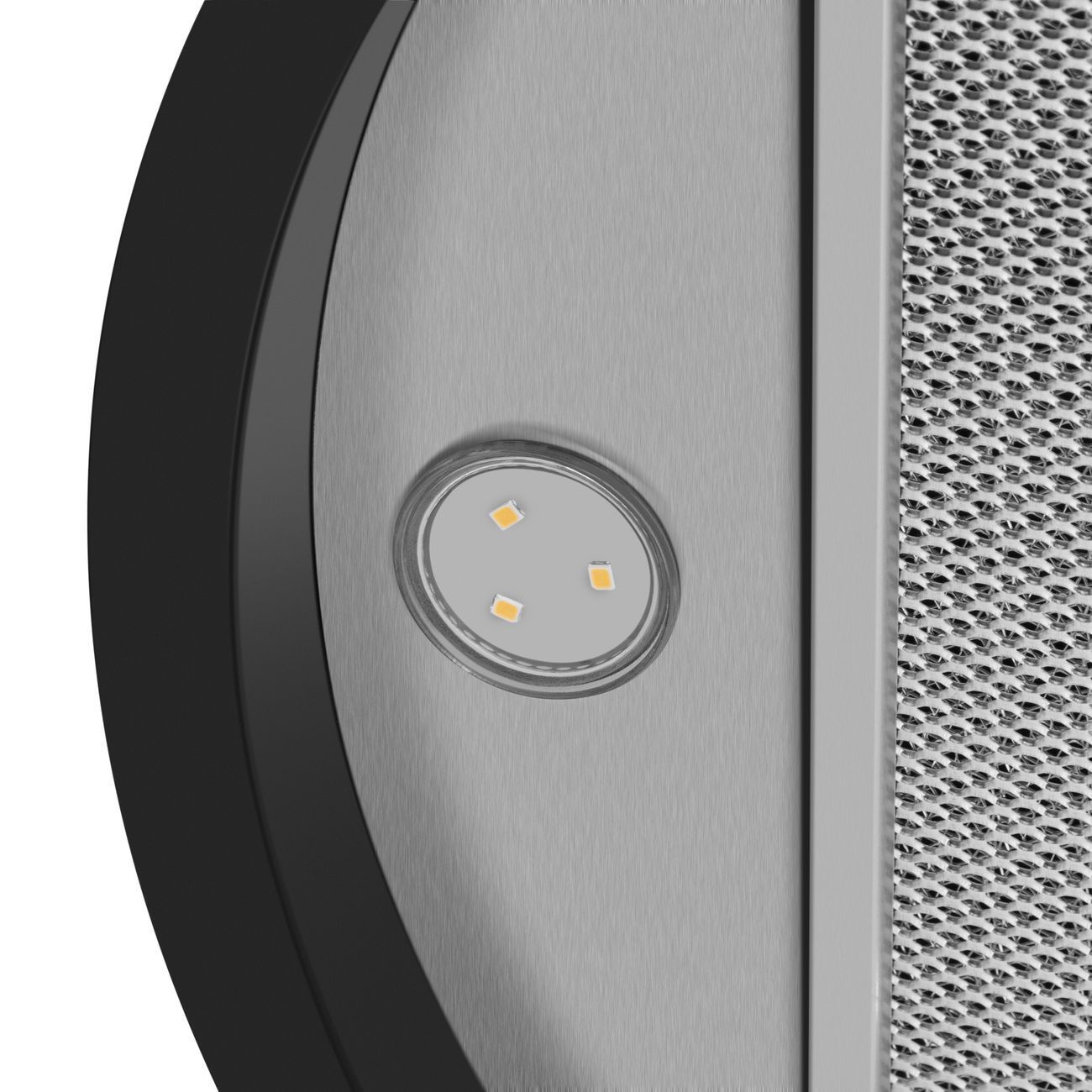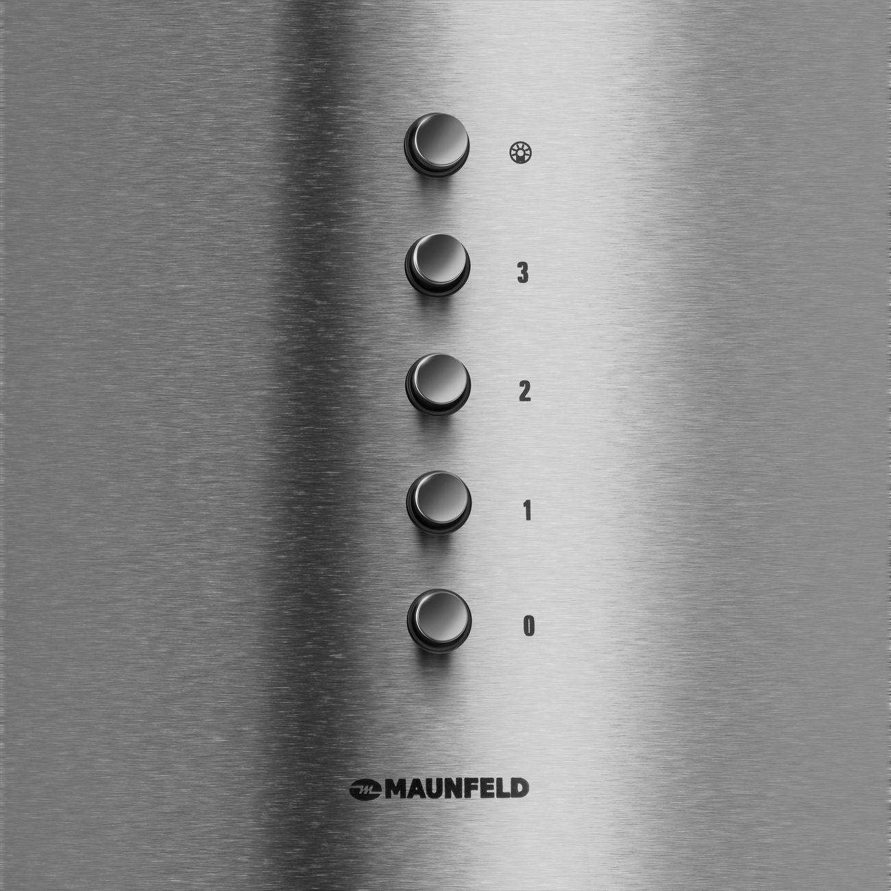 Управление механическое, выбор скоростей (их три) производится при помощи кнопок. Варочная панель освещается двумя светодиодами мощностью 2,2 Вт. Вытяжка оснащена одним мотором мощностью 260 Вт, уровень шума при работе не превышает 52 дБ. Брызги жира улавливает металлический сетчатый фильтр. Вес устройства — 20 кг.