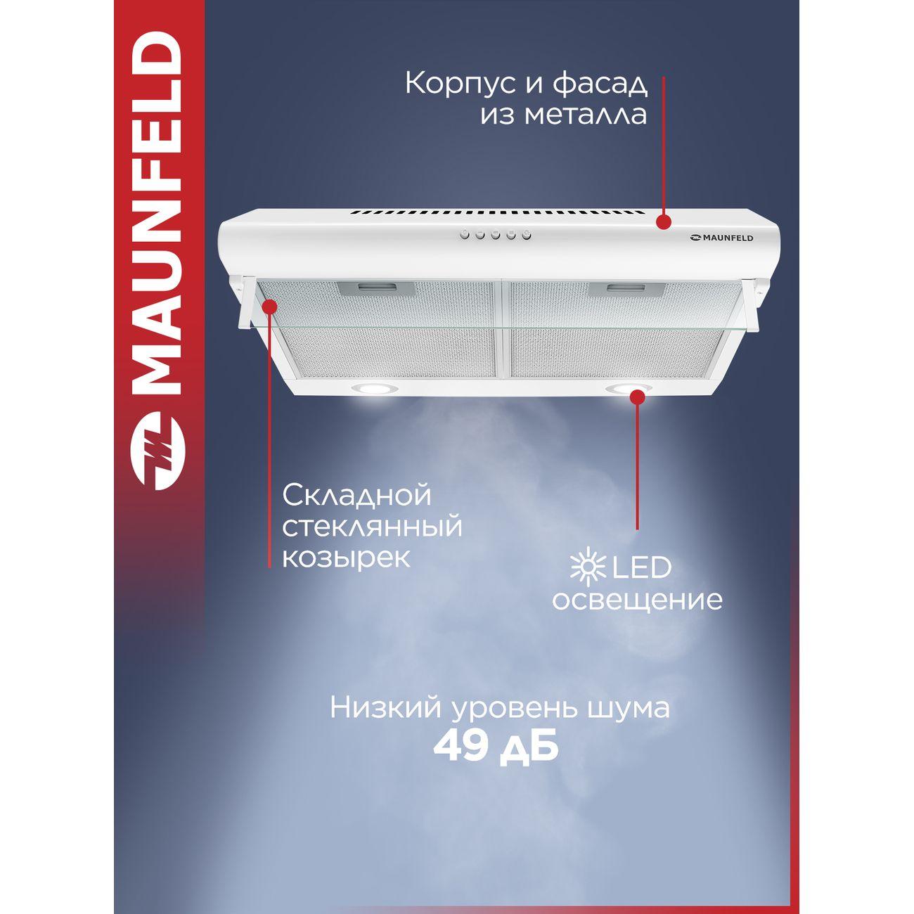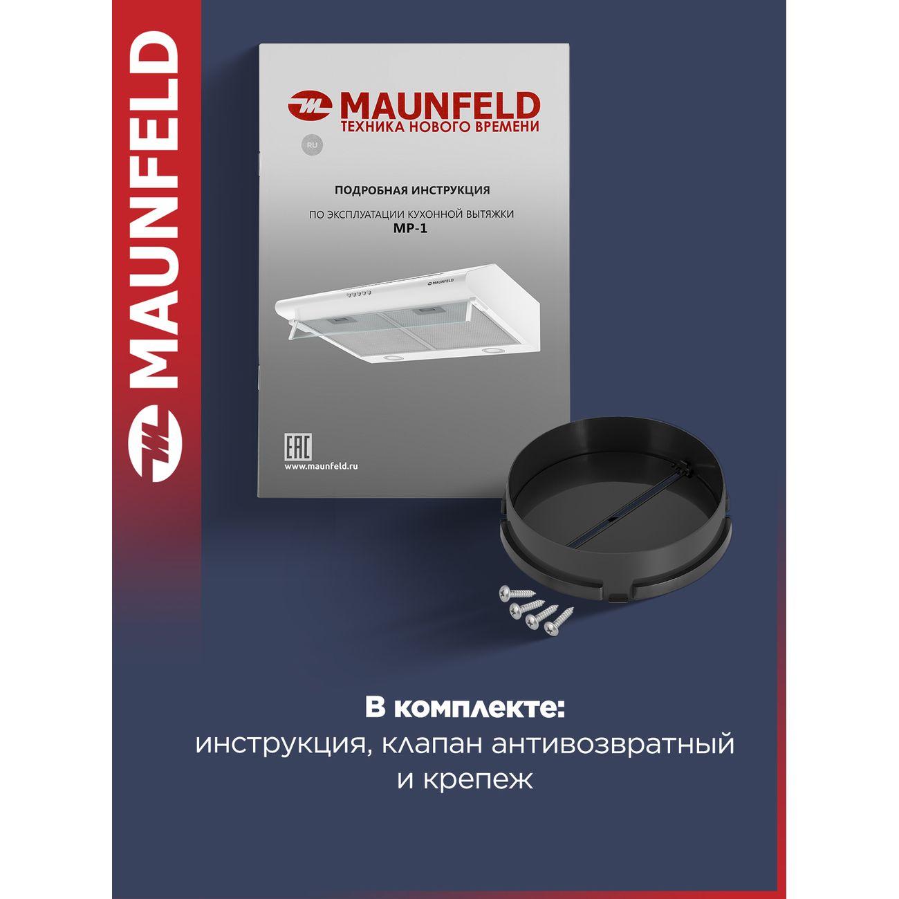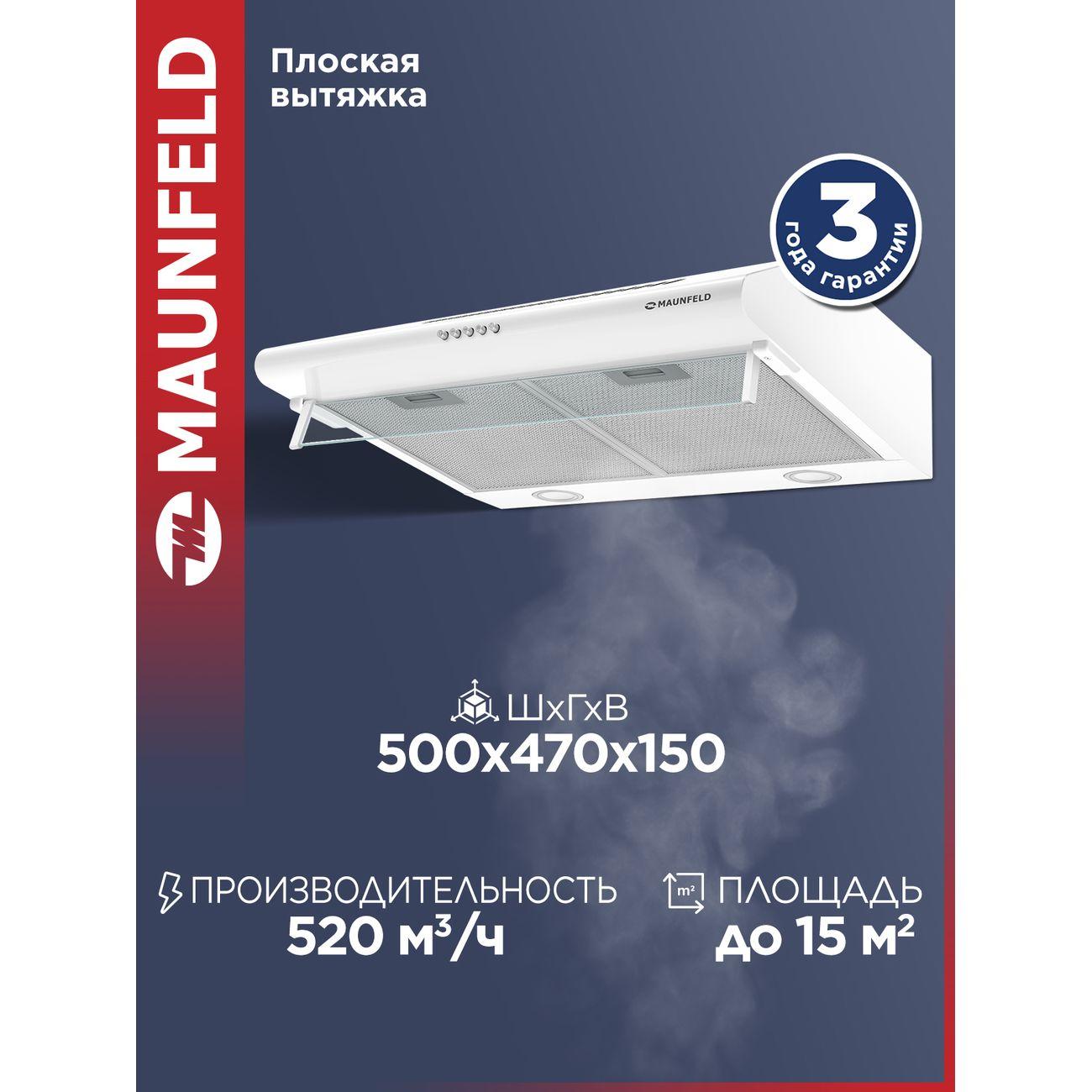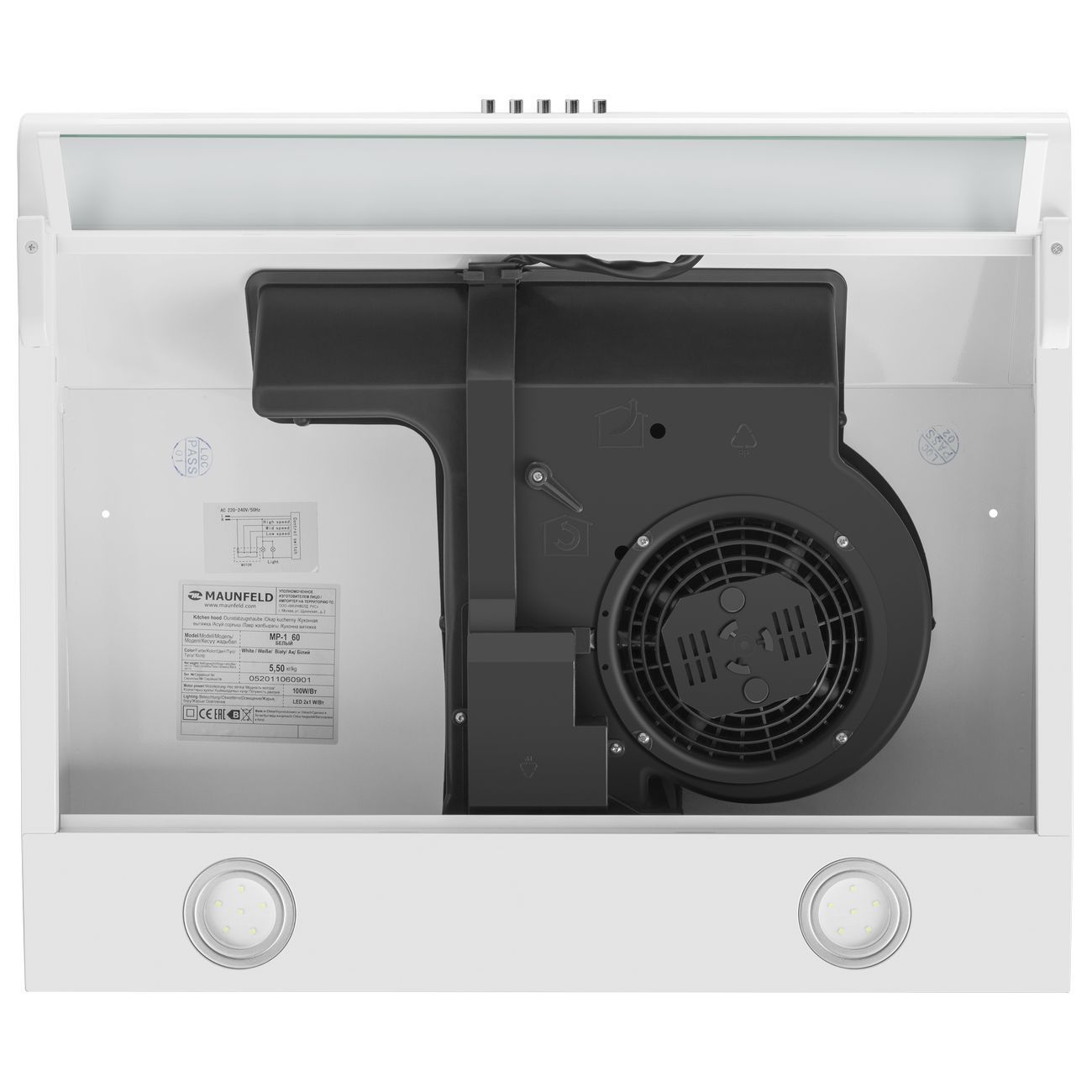 Вытяжка Maunfeld MP-1 50 белого цвета обладает размером 15х50х50 см и потребляет 102 Вт. Вес — 4,5 кг. Диаметр штуцера составляет 15 см. Корпус устройства изготовлен из металла. Работает от сети с помощью шнура длиной 1 м. Благодаря антивозвратному клапану посторонние запахи не попадают в помещение. Скорости работы можно переключать механическим способом.