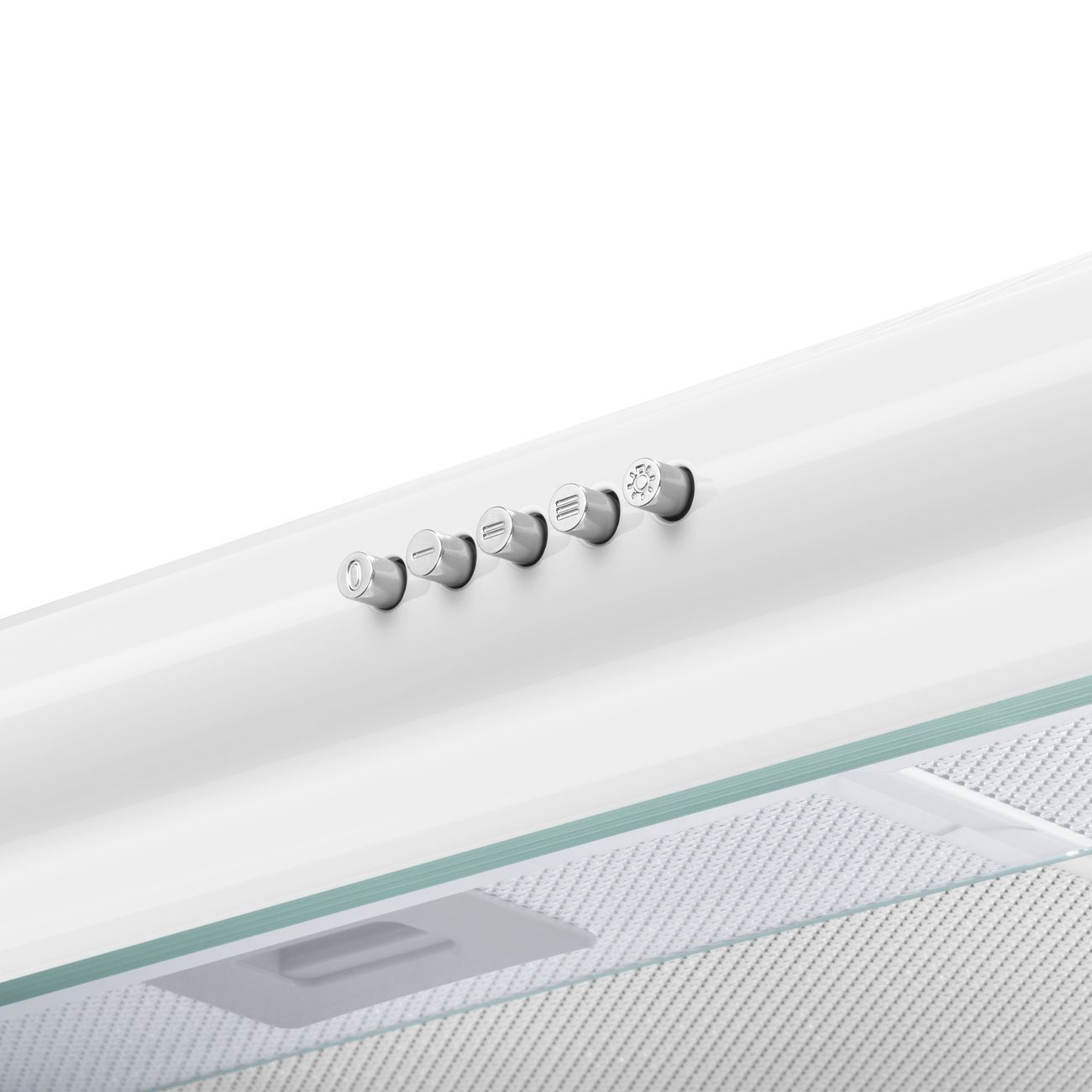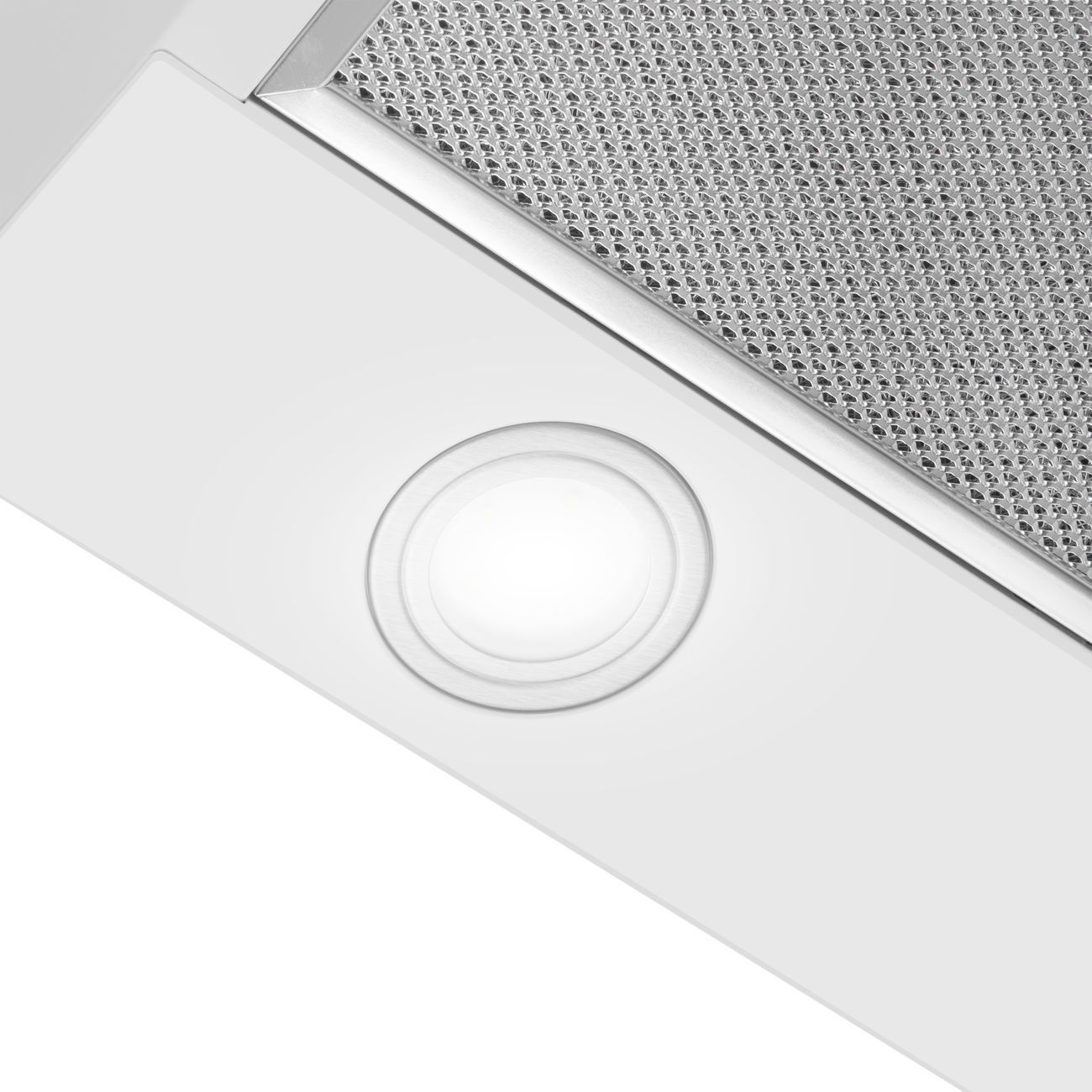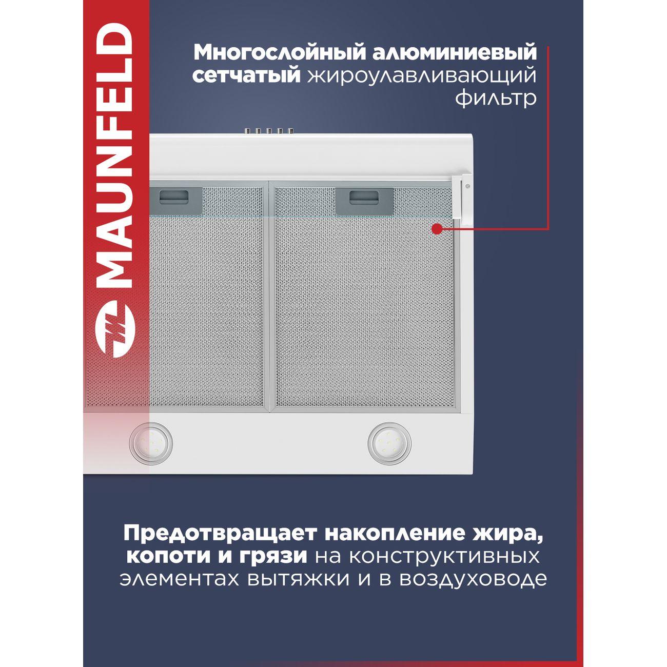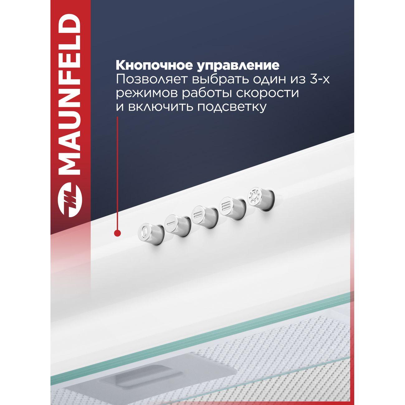 Вытяжка Maunfeld MP-1 50 белого цвета обладает размером 15х50х50 см и потребляет 102 Вт. Вес — 4,5 кг. Диаметр штуцера составляет 15 см. Корпус устройства изготовлен из металла. Работает от сети с помощью шнура длиной 1 м. Благодаря антивозвратному клапану посторонние запахи не попадают в помещение. Скорости работы можно переключать механическим способом.