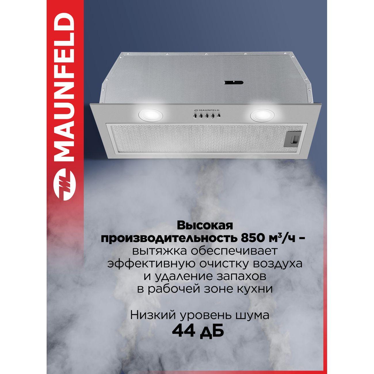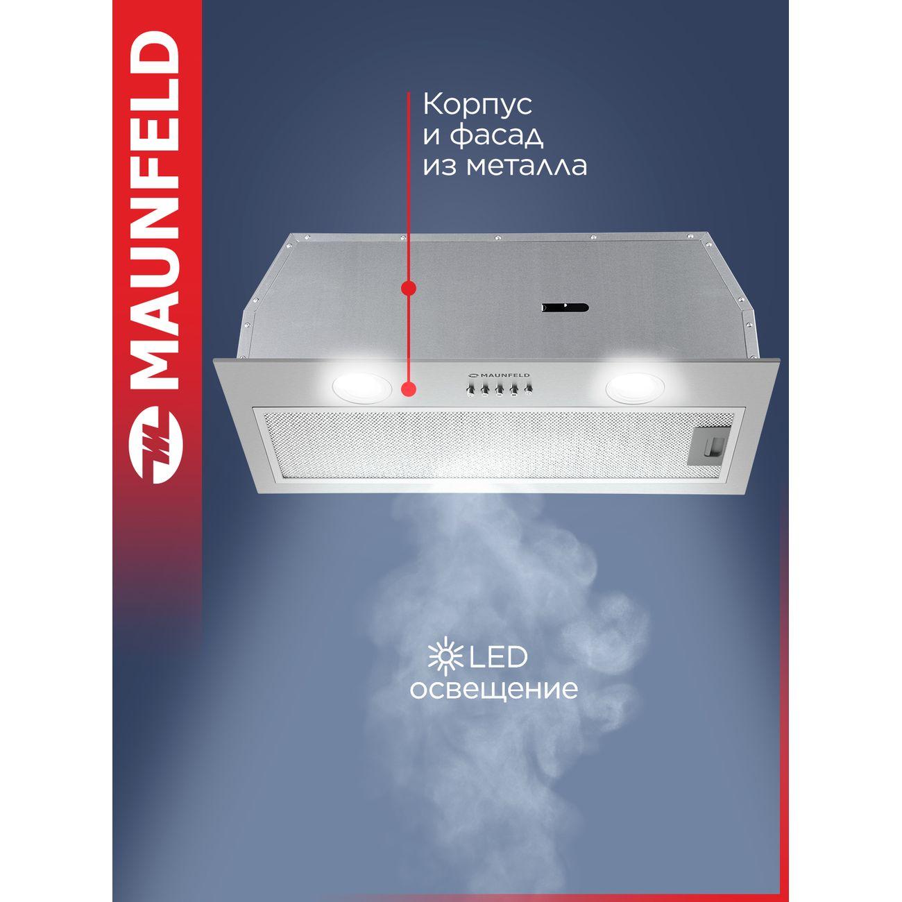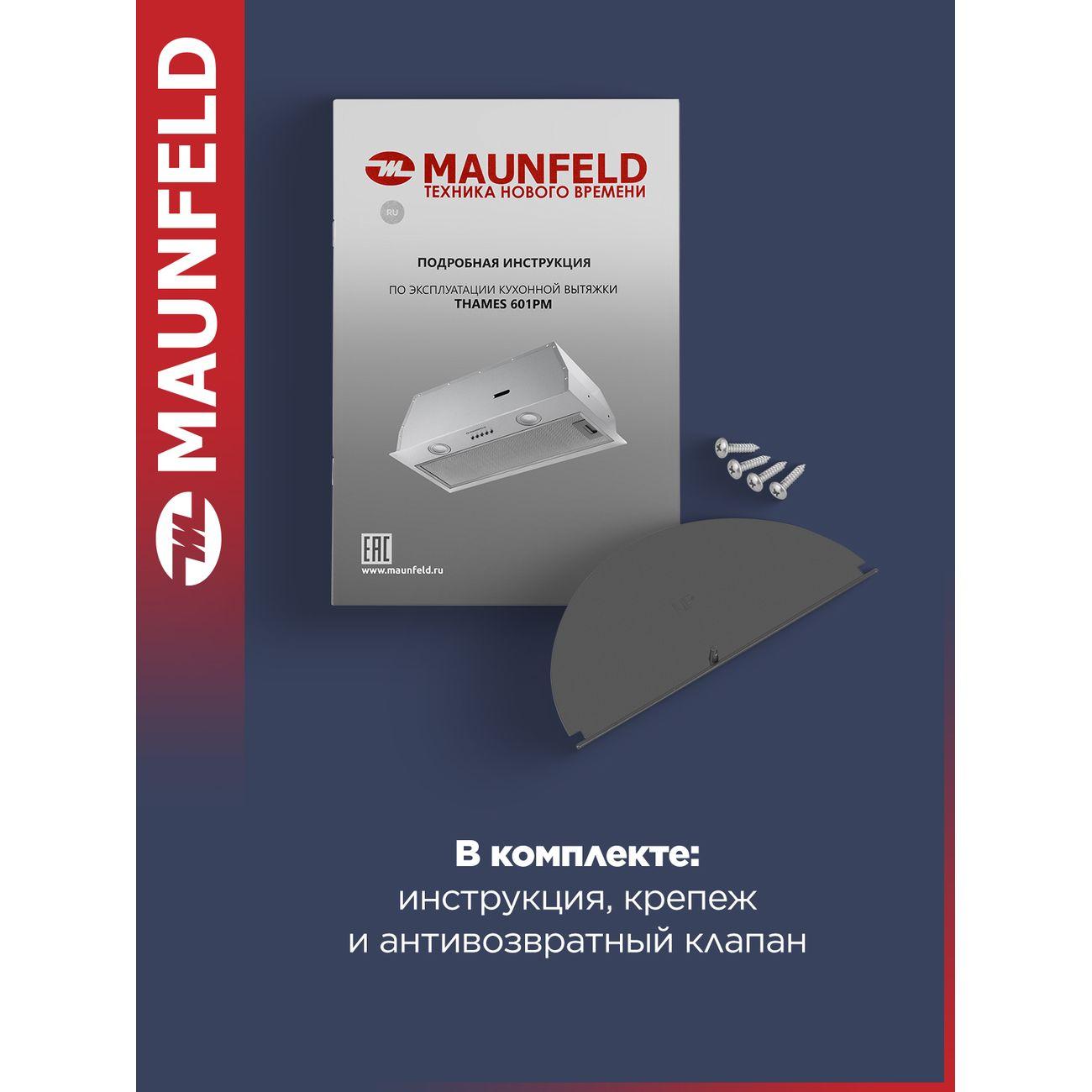 Встраиваемая вытяжка Maunfeld Thames 601PM цвета «нержавеющая сталь», шириной 60 см освещается светодиодными лампочками, располагающимися спереди. Модель весит 4,8 кг, потребляет 127 Вт электроэнергии и подключается к сети шнуром длиной 1,5 м.