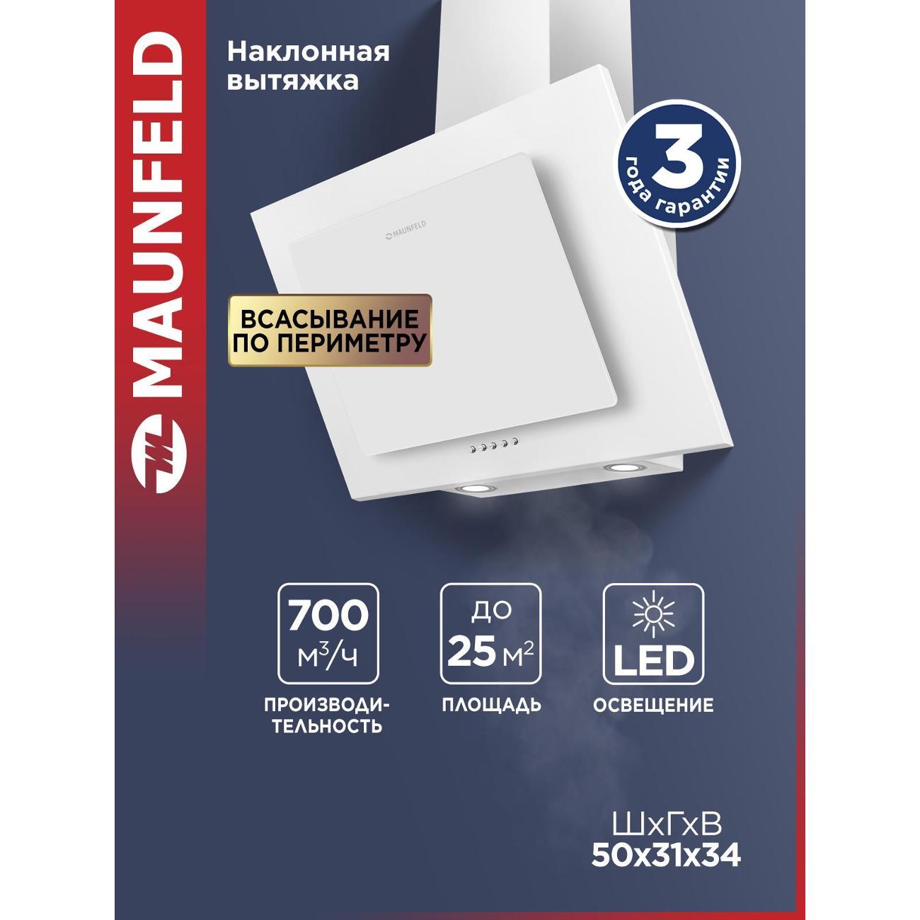 Вытяжка Maunfeld Tower 50 в корпусе белого цвета шириной 50 см работает в режимах отвода и рециркуляции. Для первого в комплект входит жиропоглощающий фильтр, для второго потребуется приобрести угольный модуль CF150. Производительность устройства достигает 700 м³/ч. Прибор рассчитан на использование по помещениях площадью до 20 м².