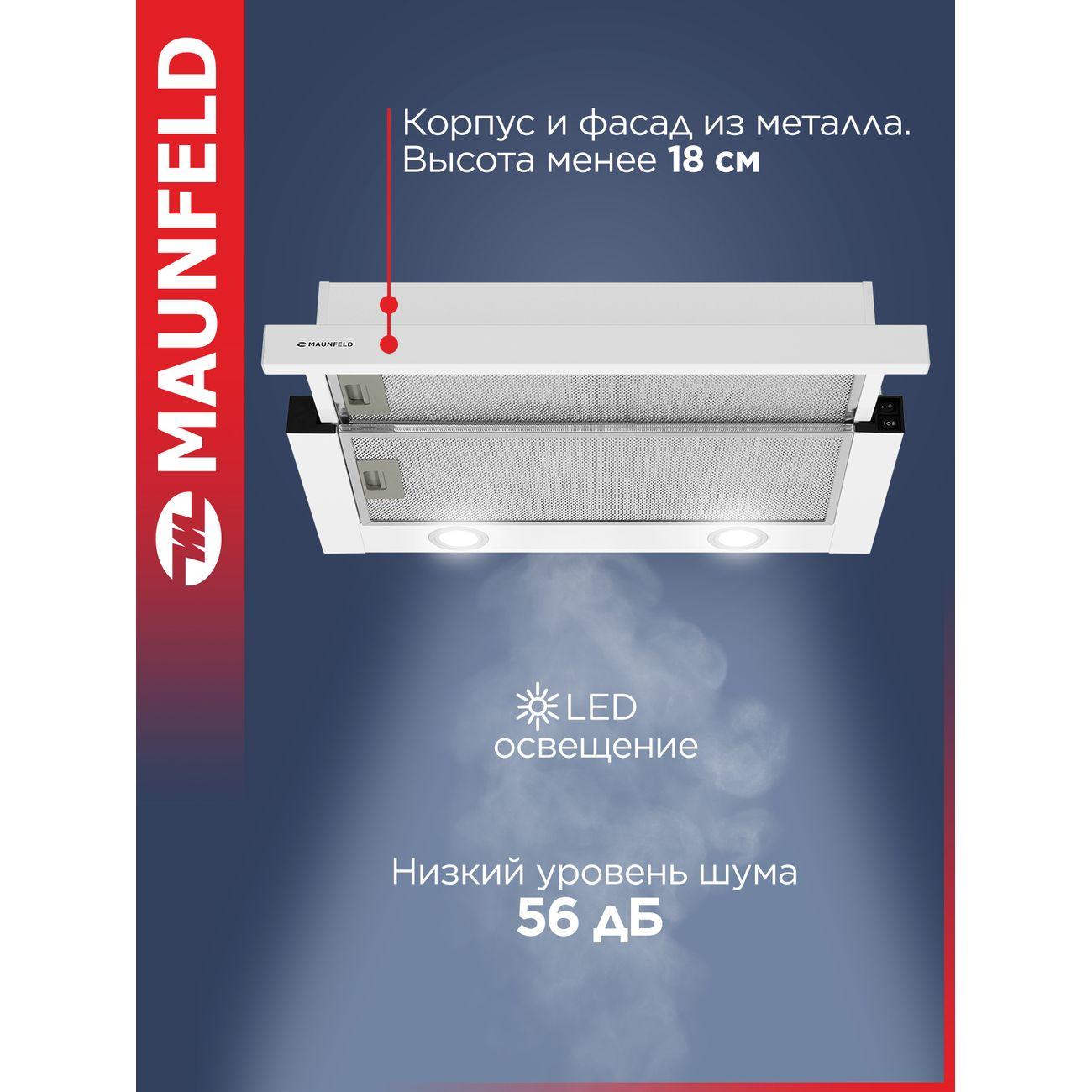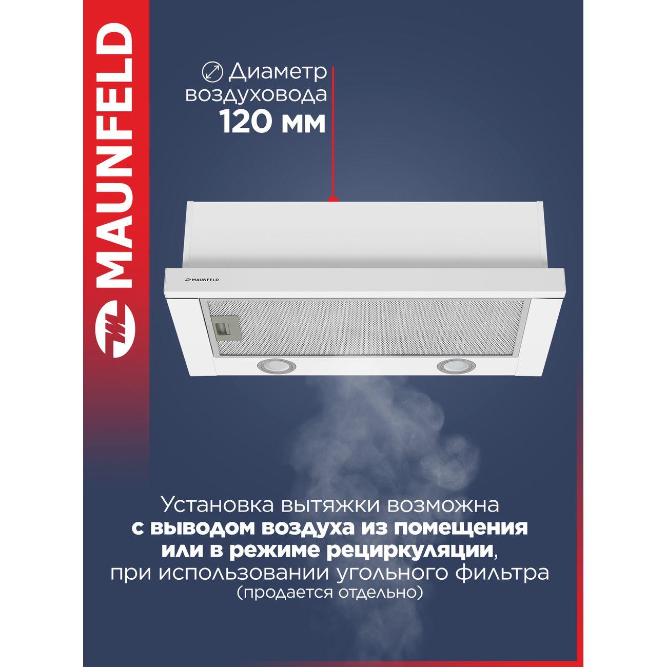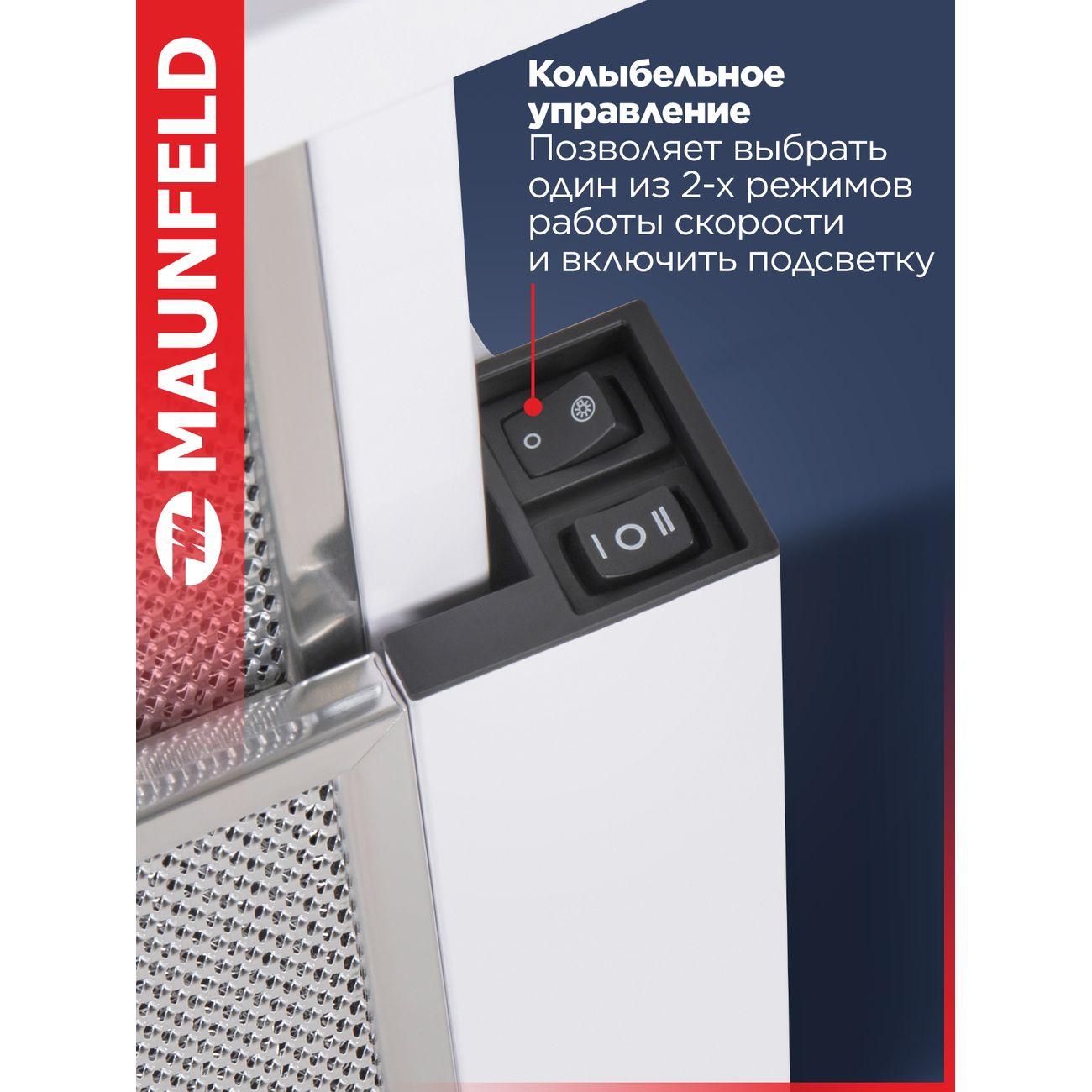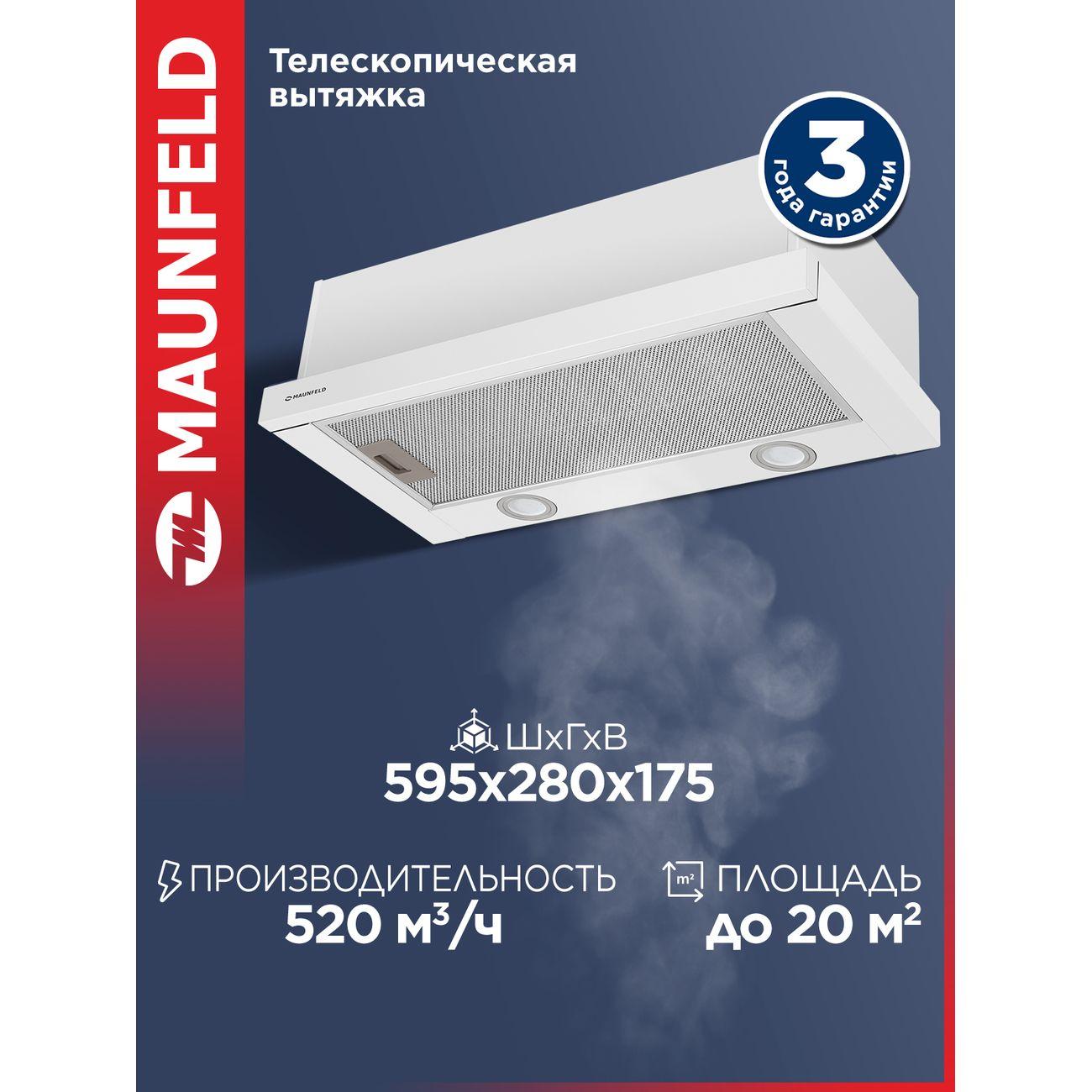 Белая вытяжка Maunfeld VS Light 60 шириной 60 см работает с производительностью до 520 м³/ч, очищая воздух в кухне габаритами до 20 м² (при высоте потолков 2,6 м). Модель освещается двумя светодиодными лампочками, расположенными сзади. Вес — 5,6 кг, энергопотребление — 102 Вт.