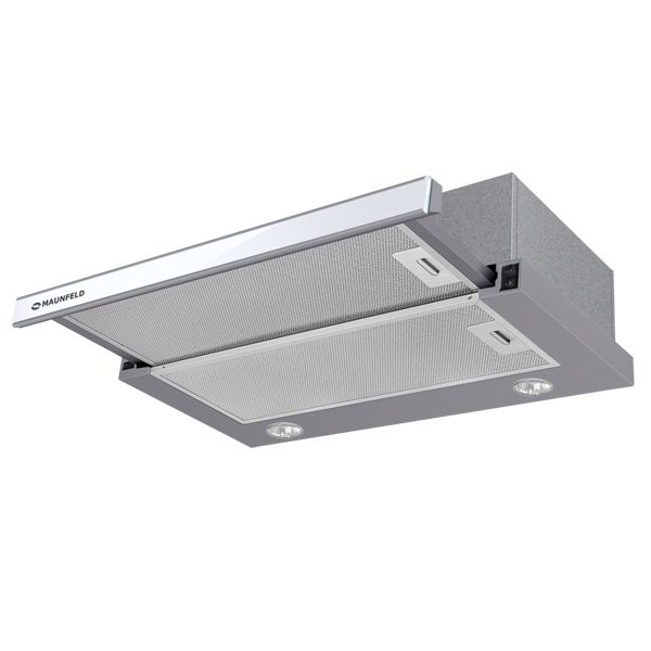Вытяжка Maunfeld VS Slide 60 цвета «металлик/белое стекло», шириной 60 см предназначена для обслуживания комнаты габаритами до 20 м² (при высоте потолков 2,6 м) и работает тихо — уровень шума не превышает 56 дБ при максимальной производительности 620 м³/ч (для опции «Отвод»). Жироулавливающий фильтр снимается для мытья и очистки.
