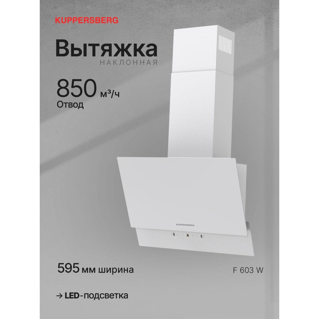 Вы можете купить Вытяжка наклонная Kuppersberg F 603 W в магазинах М.Видео по доступной цене. Вытяжка наклонная Kuppersberg F 603 W: подробное описание, фото и отзывы реальных покупателей, характеристики, возможность скачать инструкции и подобрать аксессуары.