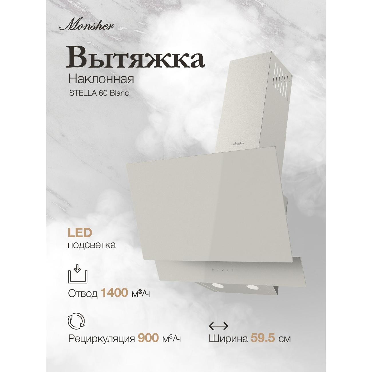 Вы можете купить Вытяжка наклонная Monsher STELLA 60 Blanc в магазинах М.Видео по доступной цене. Вытяжка наклонная Monsher STELLA 60 Blanc: подробное описание, фото и отзывы реальных покупателей, характеристики, возможность скачать инструкции и подобрать аксессуары.