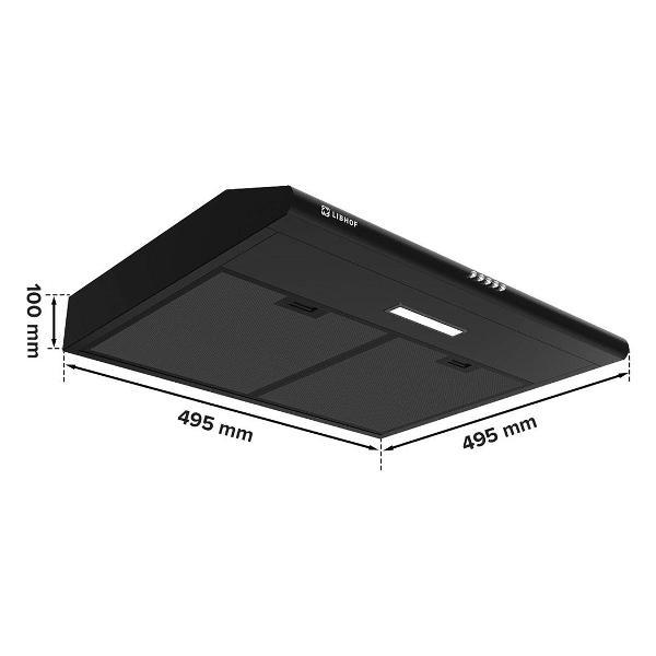 Плоская вытяжка Libhof LF-2550 Black обладает габаритами 100x495x495 мм и может работать в двух режимах: отвод воздуха и рециркуляция. Если на кухне есть возможность подключения к вентиляционной шахте, устройство будет удалять загрязненный воздух наружу. Если такой возможности нет, система рециркуляции очистит воздух через фильтры и выпустит обратно уже свежим. Производительность достигает 390 м3/ч в режиме отвода — устройство быстро справляться с чадом, запахами и продуктами горения, охватывая площадь до 14 м².