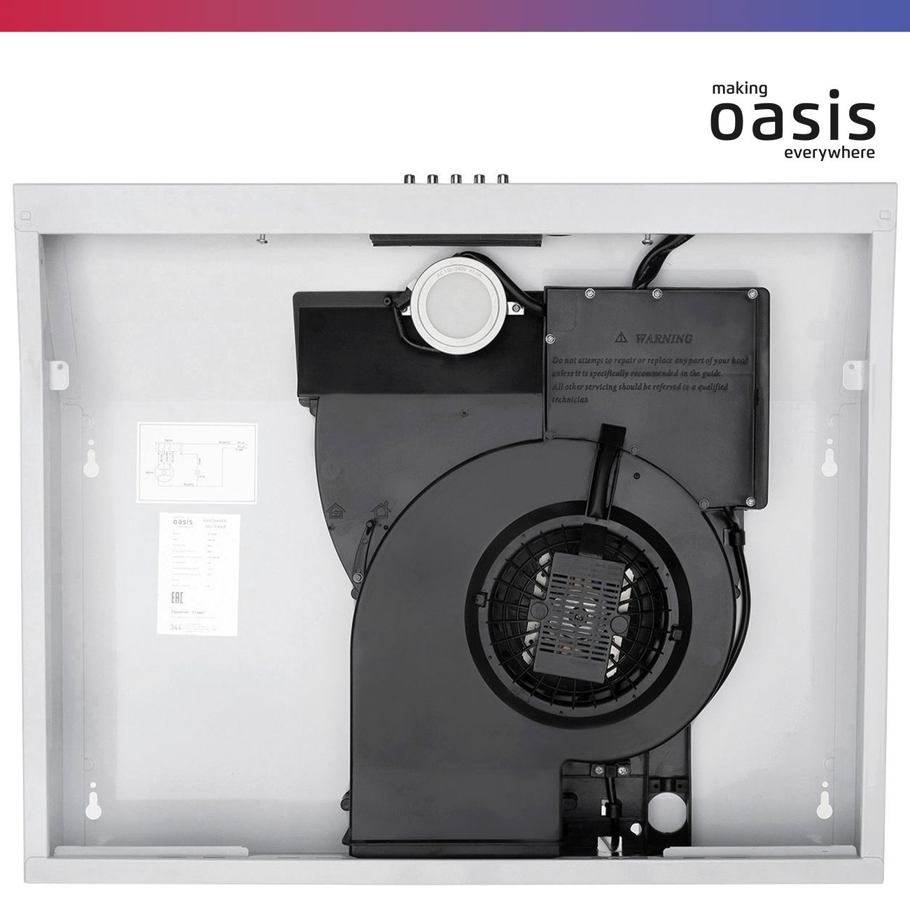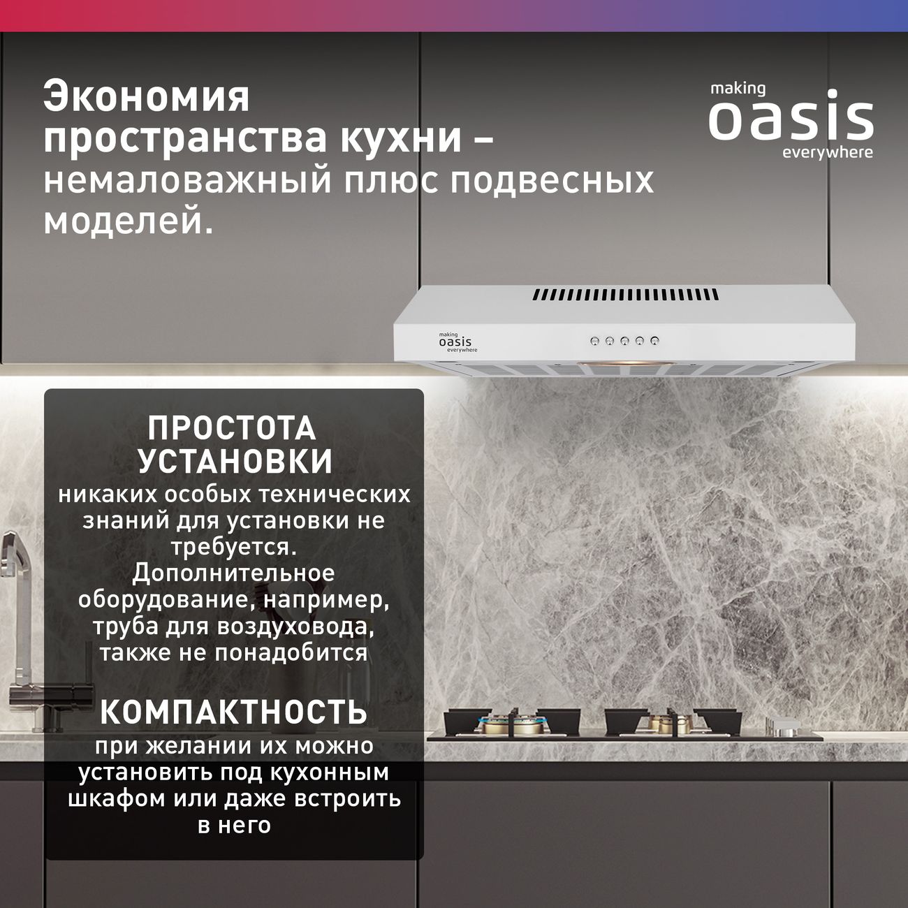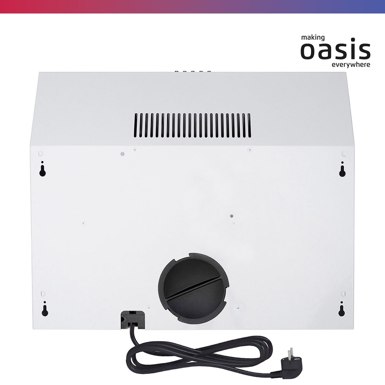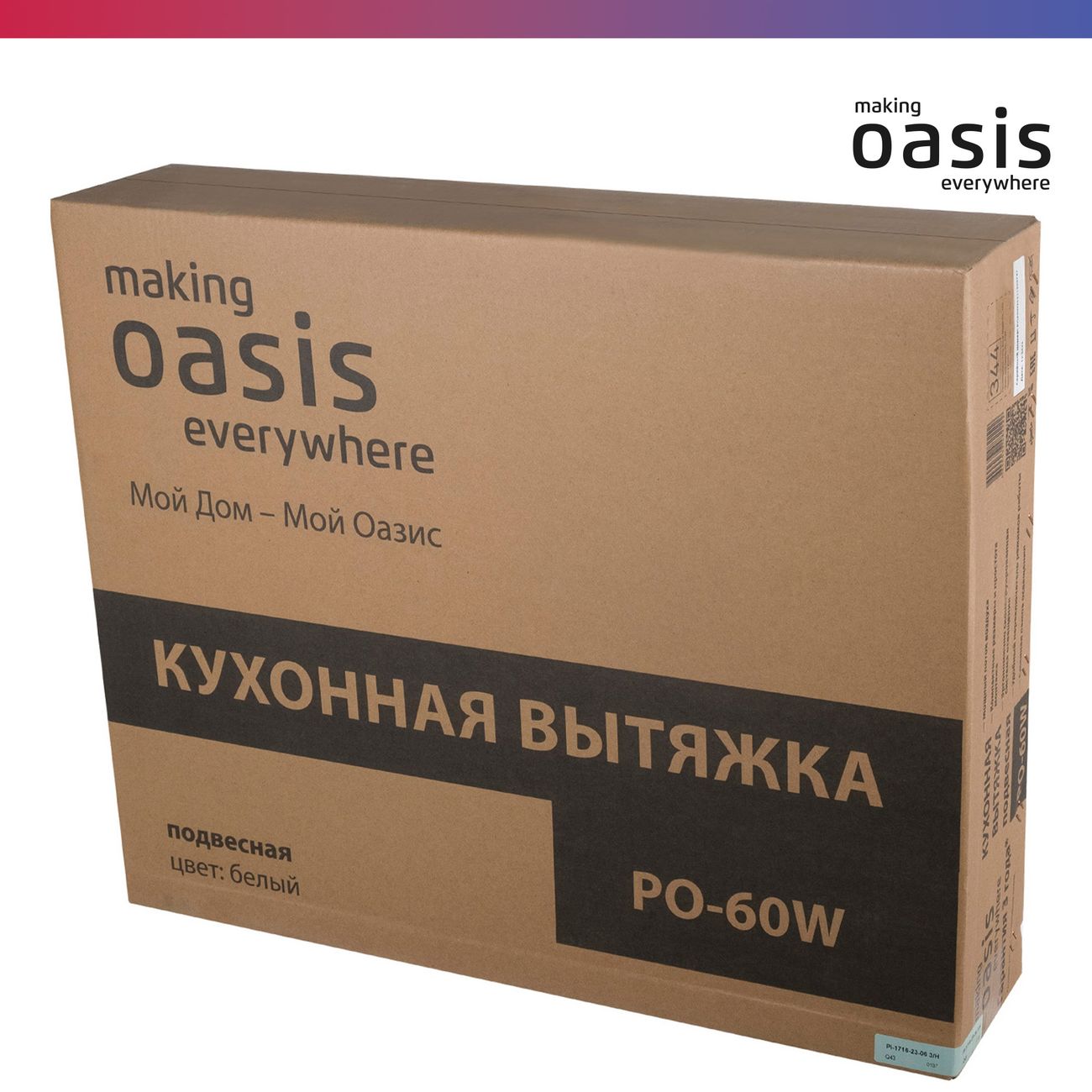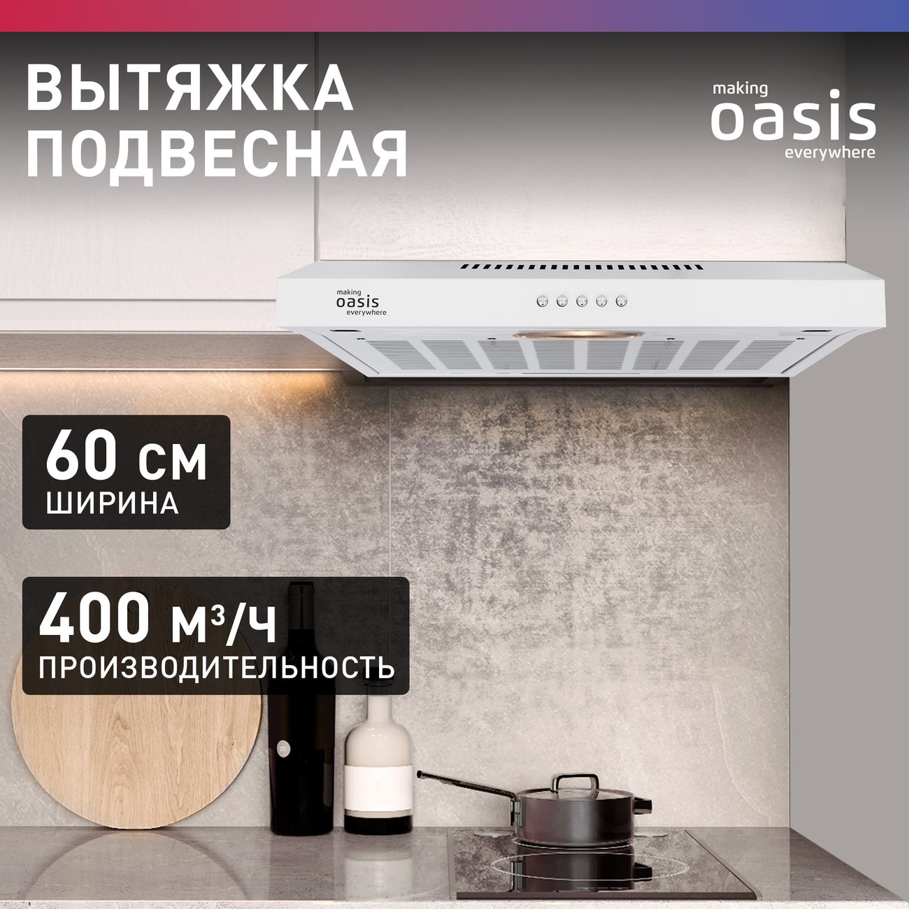 Подвесная вытяжка «making Oasis everywhere» PO–60W шириной 60 см удаляет запахи пищи из помещения, оснащена одним жиропоглощающим универсальным войлочным фильтром. Прибор снабжен антивозвратным клапаном, предотвращающим попадание запаха из общего вентиляционного канала. Три скорости работы, управление осуществляется при помощи кнопок.