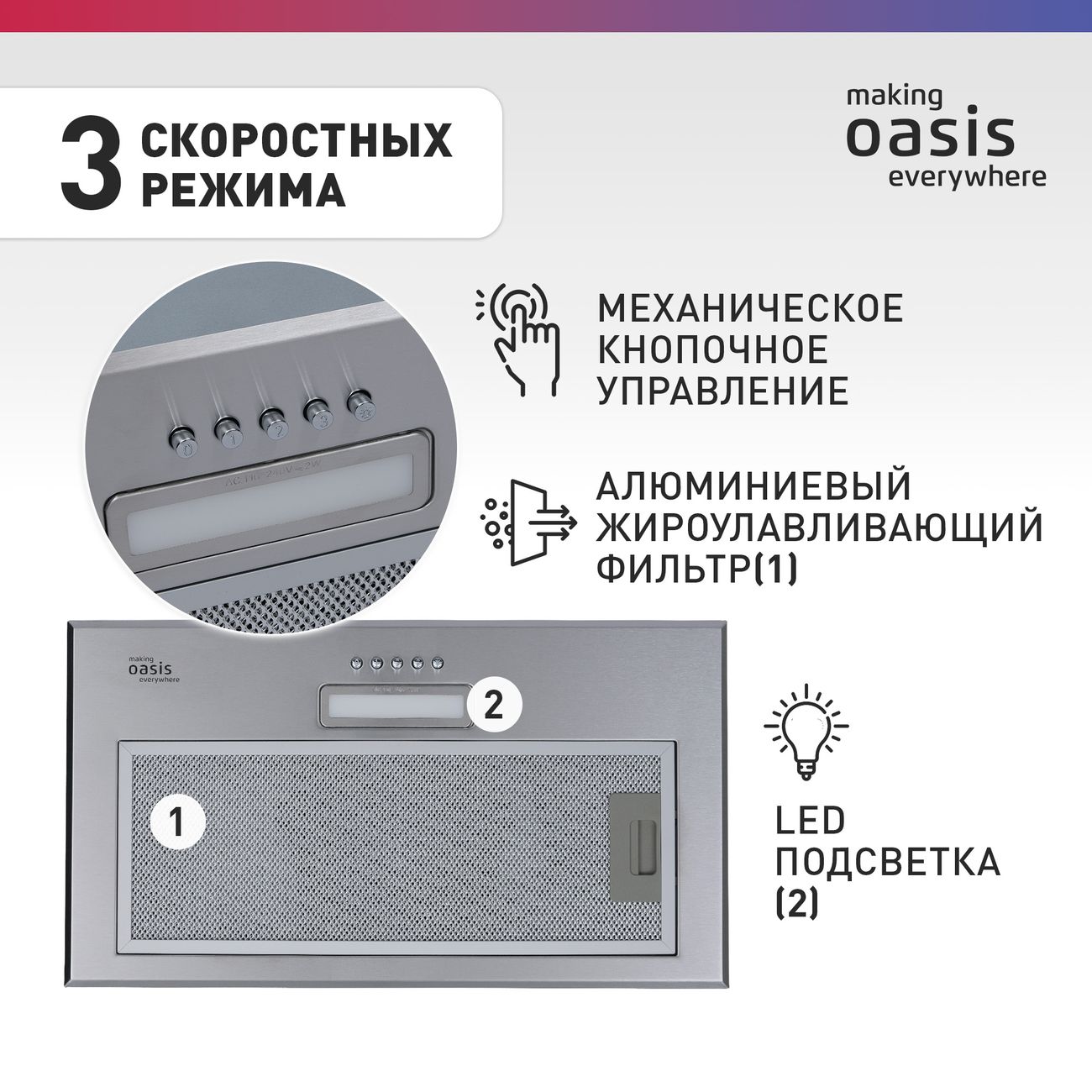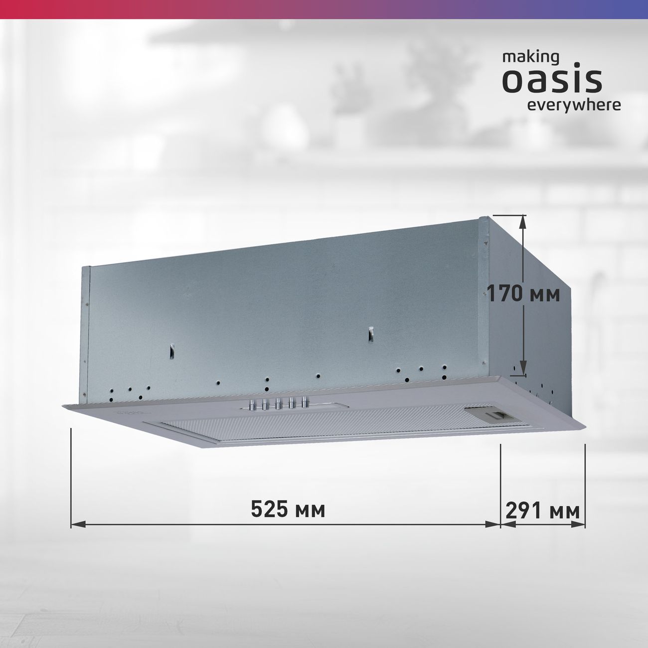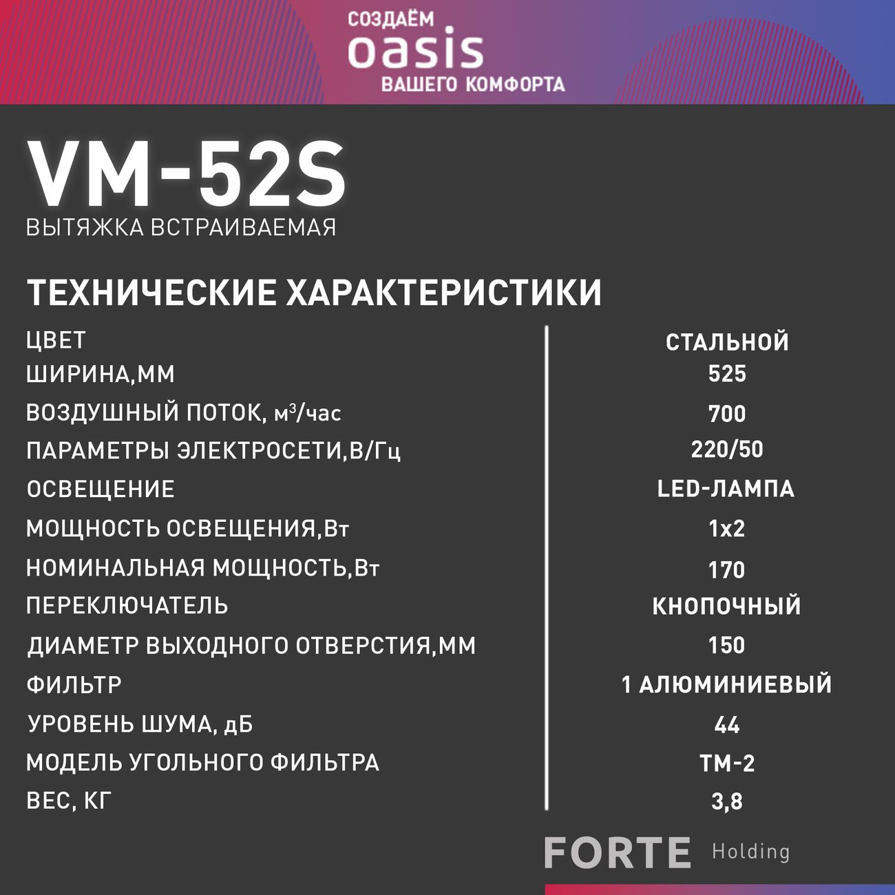 Полностью встраиваемая вытяжка «making Oasis everywhere» VM-52S предназначена для помещений площадью до 22 м². За счёт оптимальной мощности мотора можно очищать воздух в помещении от копоти и гари. Устройство характеризуется тихой работой, уровень шума составляет не более 44 дБ. Благодаря этому использование вытяжки комфортно в любое время. Для освещения рабочей зоны используется светодиодная подсветка.