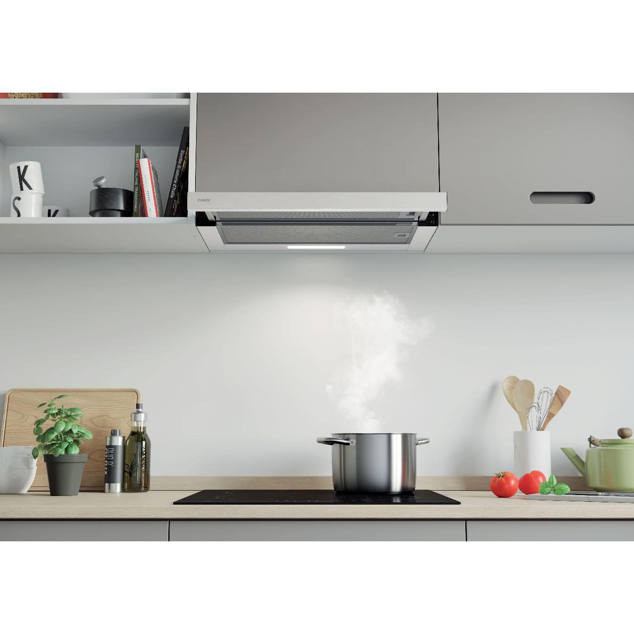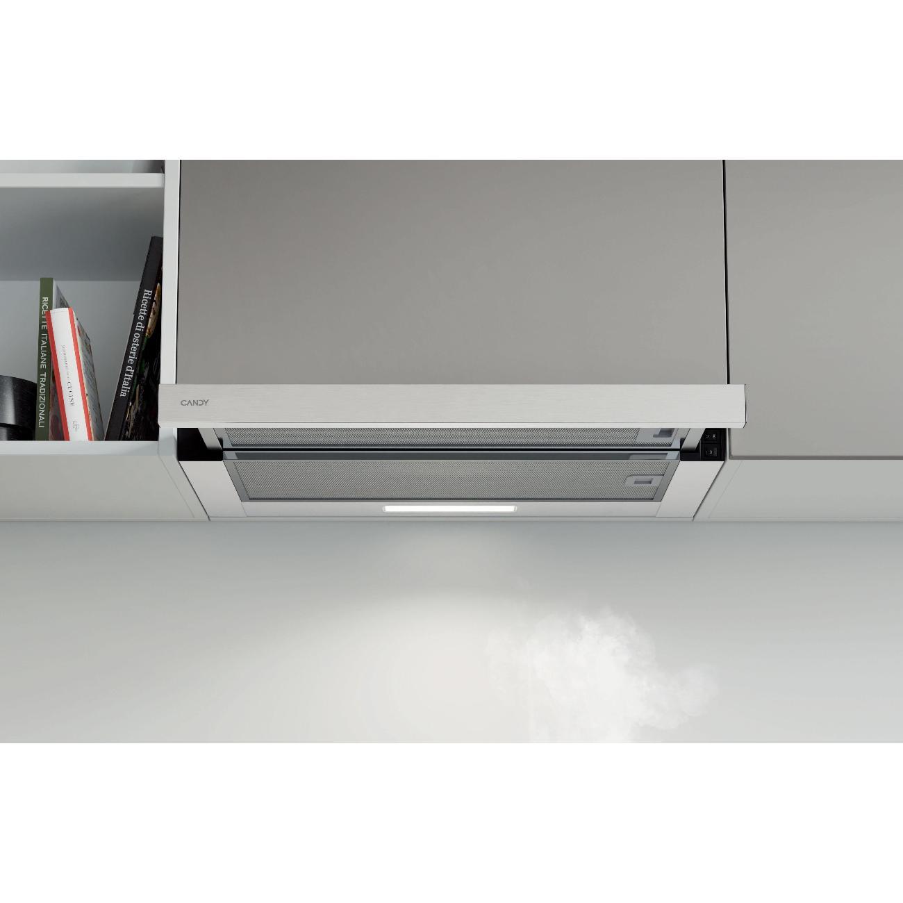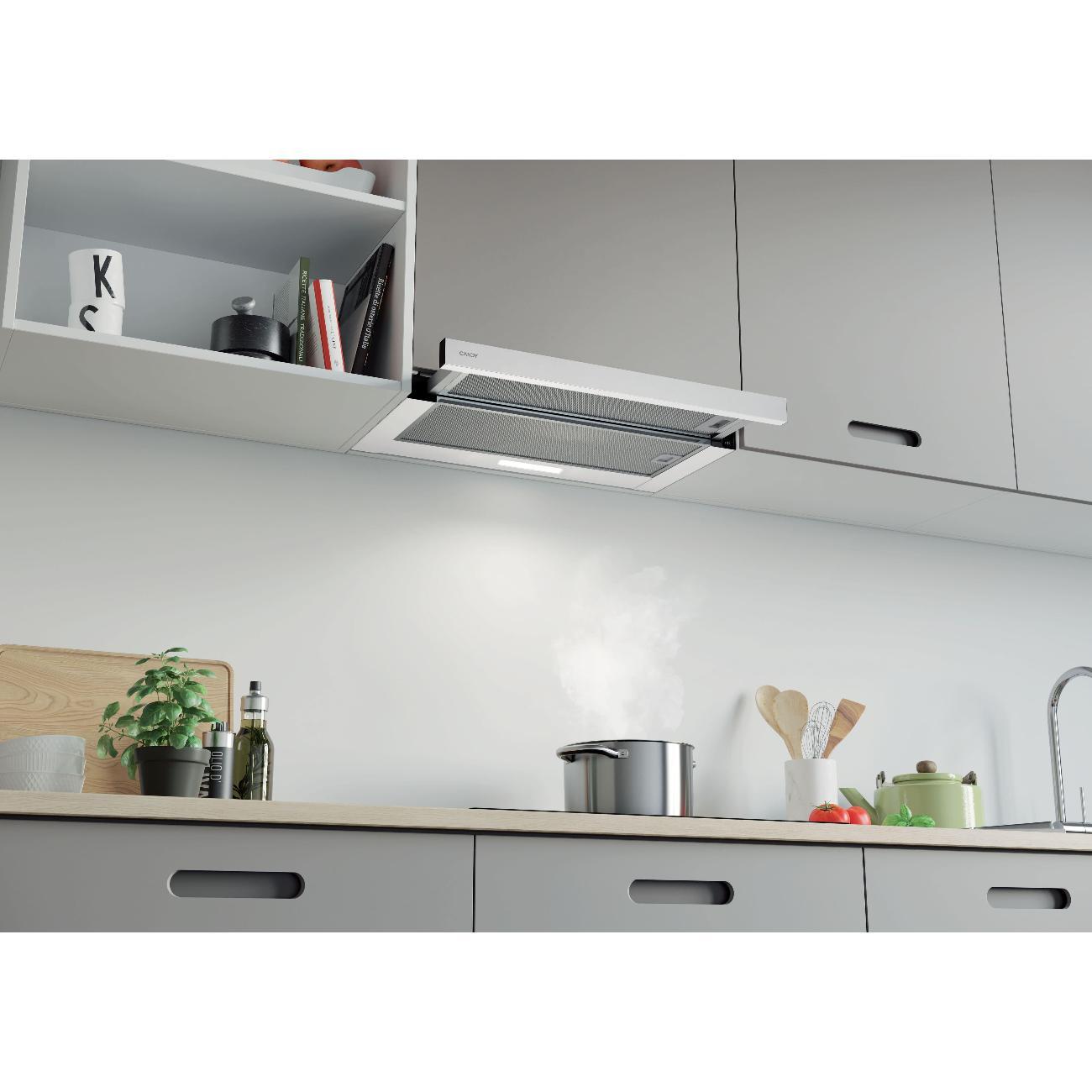 Встраиваемая в шкаф вытяжка Candy CBT60RWG-07 — телескопическая модель белого цвета для скрытого монтажа в кухонный гарнитур над варочной панелью. Устройство эффективно очищает воздух в двух режимах — отвода и рециркуляции.