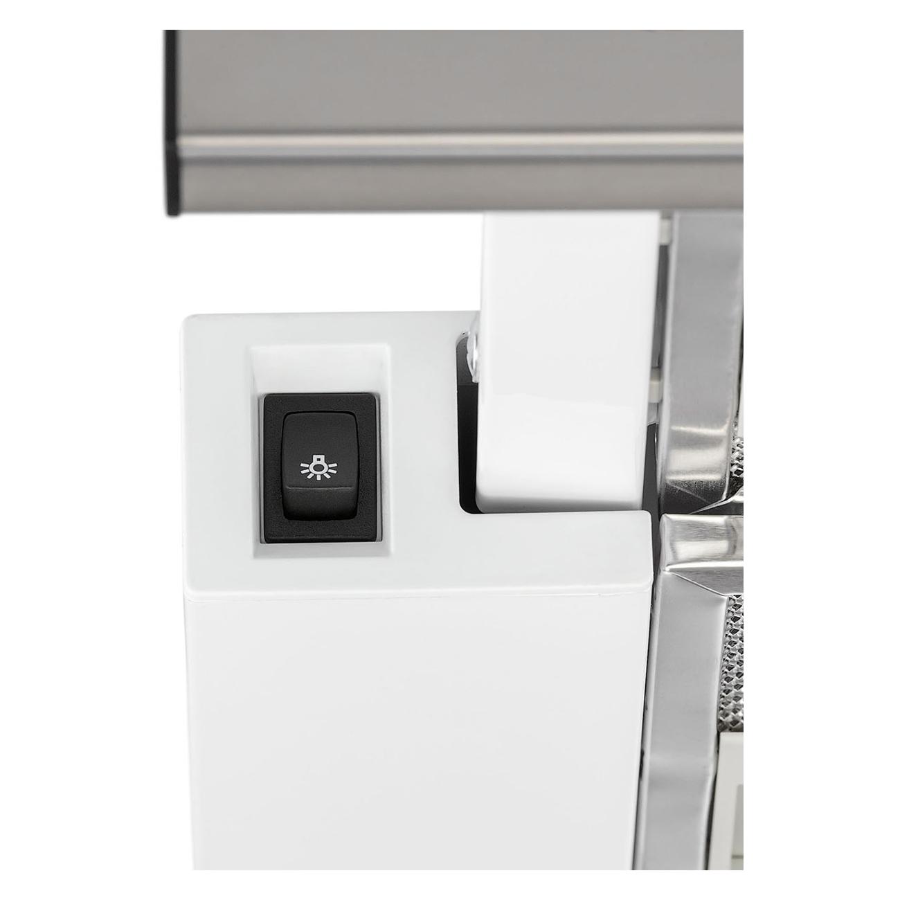Для управления предусмотрена кнопочная панель, позволяющая выбрать один из трех уровней мощности. Функция Slide-stop сохраняет последнюю заданную скорость. Корпус с выдвижным козырьком сделан из шлифованного металла, для подсветки варочной поверхности в него встроены галогеновые лампы. Размеры — 17,6х60х42,5 см, вес — 4,8 кг.