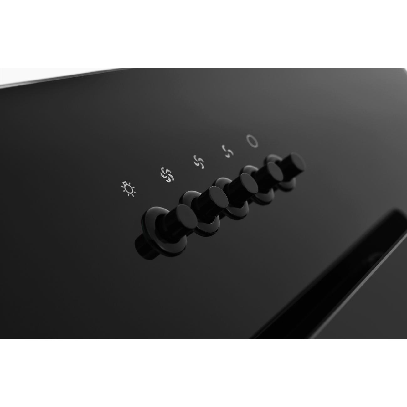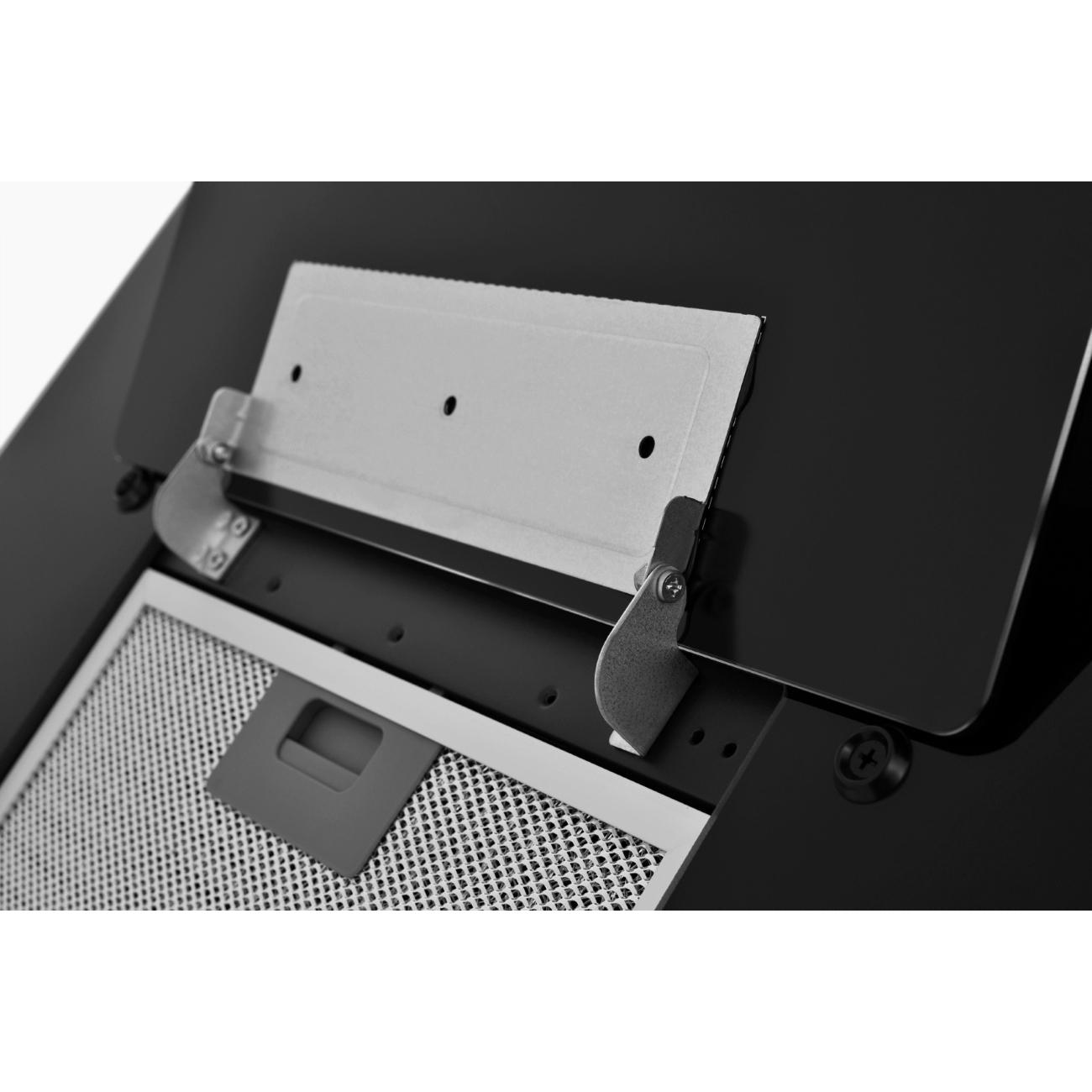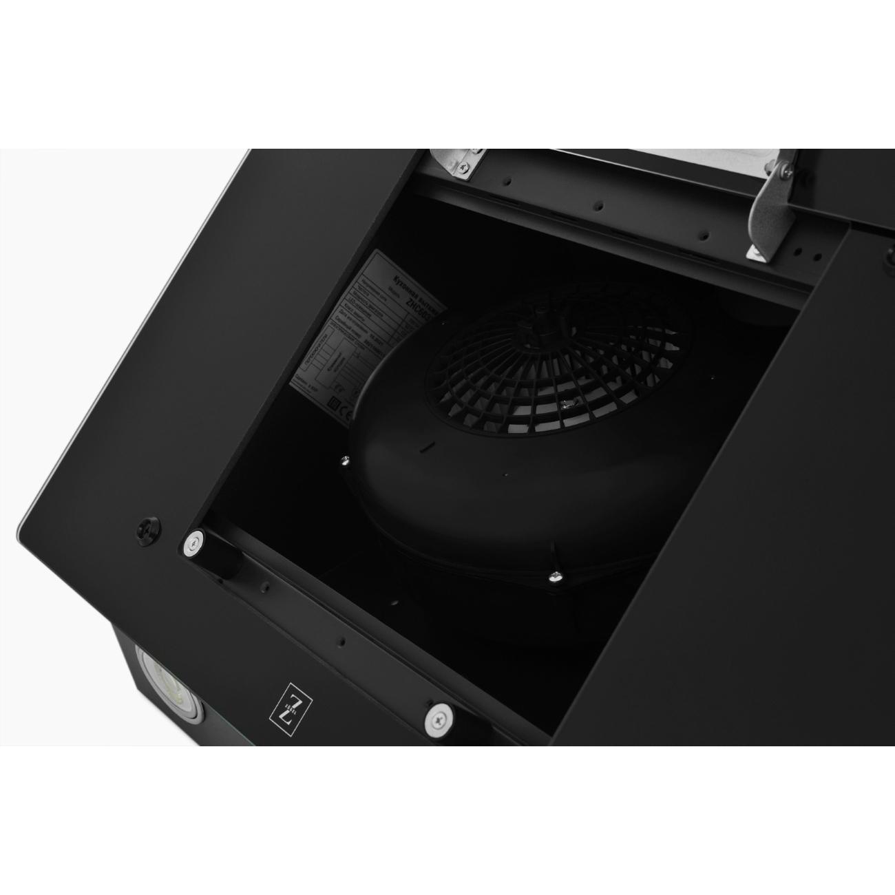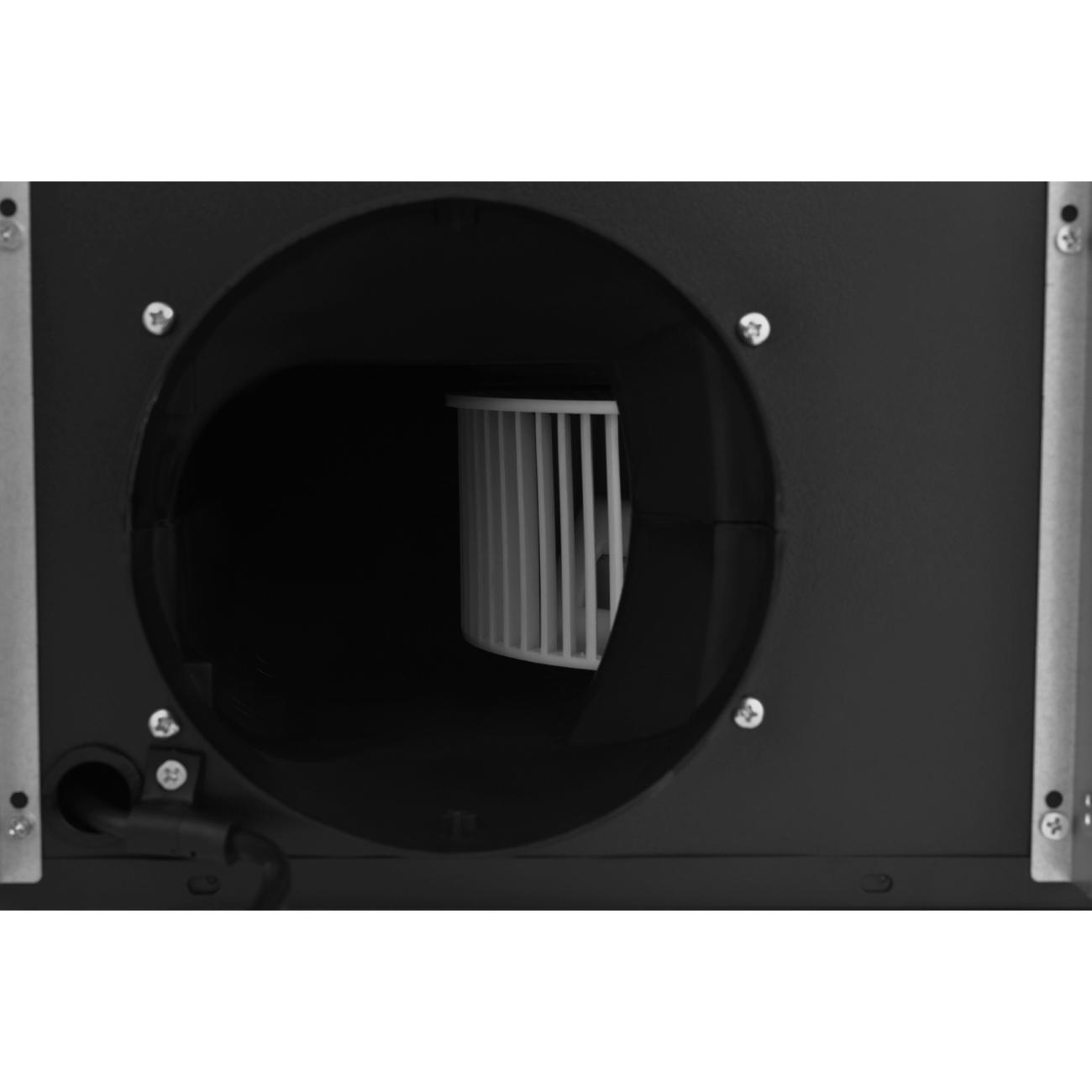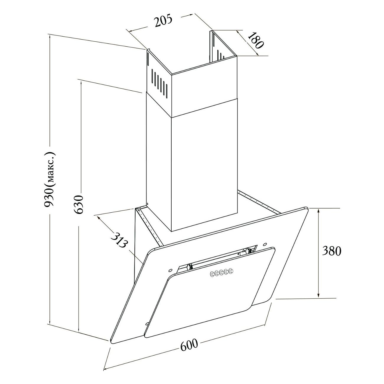 Снизу размещены светодиодные лампы для подсветки варочной поверхности на плите. Управление устройством осуществляется при помощи механических кнопок. Основная часть корпуса выполнена из прочной стали, фронтальная панель сделана из стекла. Встроен сетевой кабель длиной 1 м. Показатель энергопотребления равен 82 Вт. Уровень шума вытяжки в процессе работы не превышает 58 дБ.