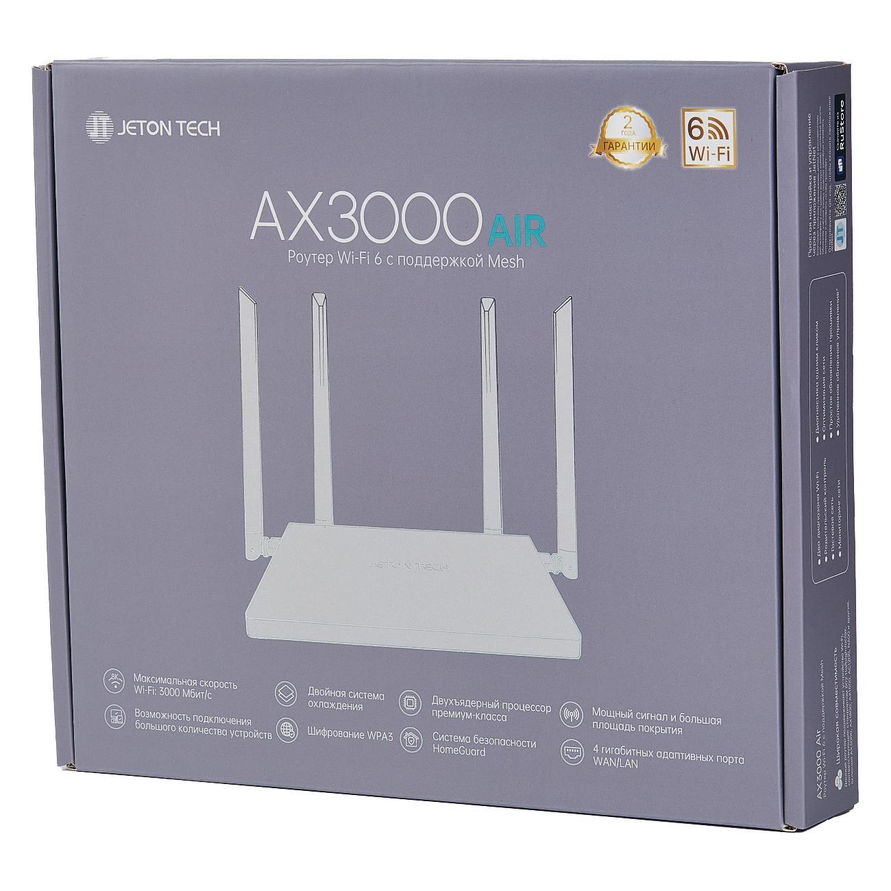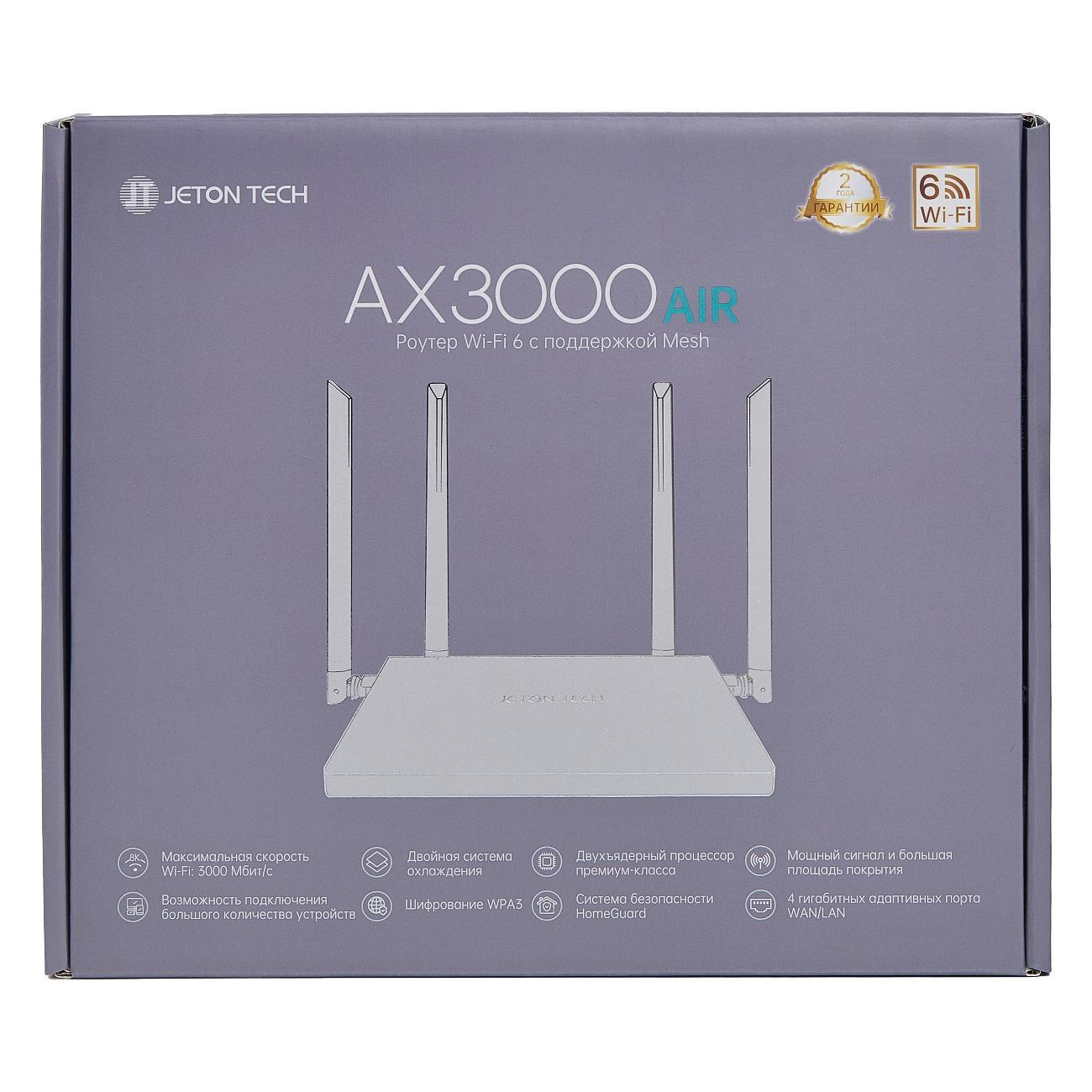 Вы можете купить Wi-Fi роутер Jeton Tech AX3000 Air в магазинах М.Видео по доступной цене. Wi-Fi роутер Jeton Tech AX3000 Air: подробное описание, фото и отзывы реальных покупателей, характеристики, возможность скачать инструкции и подобрать аксессуары.