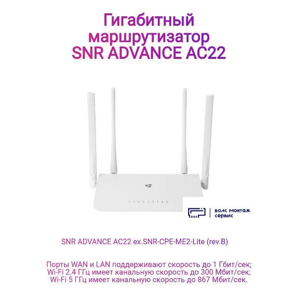Вы можете купить Wi-Fi роутер SNR ADVANCE AC22 в магазинах М.Видео по доступной цене. Wi-Fi роутер SNR ADVANCE AC22: подробное описание, фото и отзывы реальных покупателей, характеристики, возможность скачать инструкции и подобрать аксессуары.