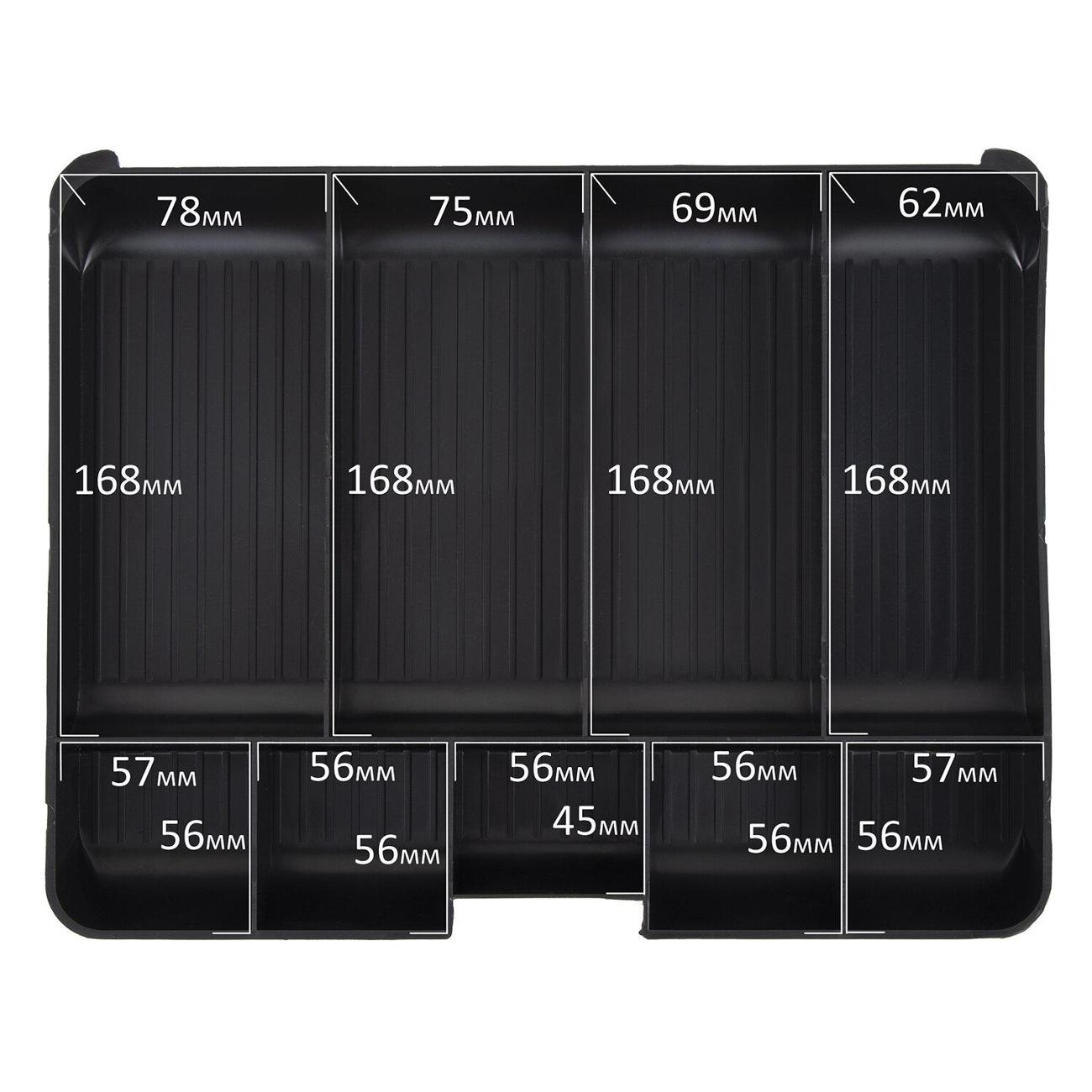 Съемный лоток из ударопрочного пластика с 9 отделениями: 4 для купюр и 5 для монет и украшений. Самая широкая ячейка - первая (78 мм). Она подходит для евро. Вторая ячейка - 75 мм. В нее входят белорусские купюры (72 мм). Третья ячейка - 68 мм. В нее войдут доллары США (66,3 мм). Российский рубль войдет в первые три ячейки. Четвёртая ячейка самая узкая - 63 мм. Подходит для карточек, ключей, печати. Под лотком есть пространство, где можно хранить документы и бумаги. Размер 30х24 см.