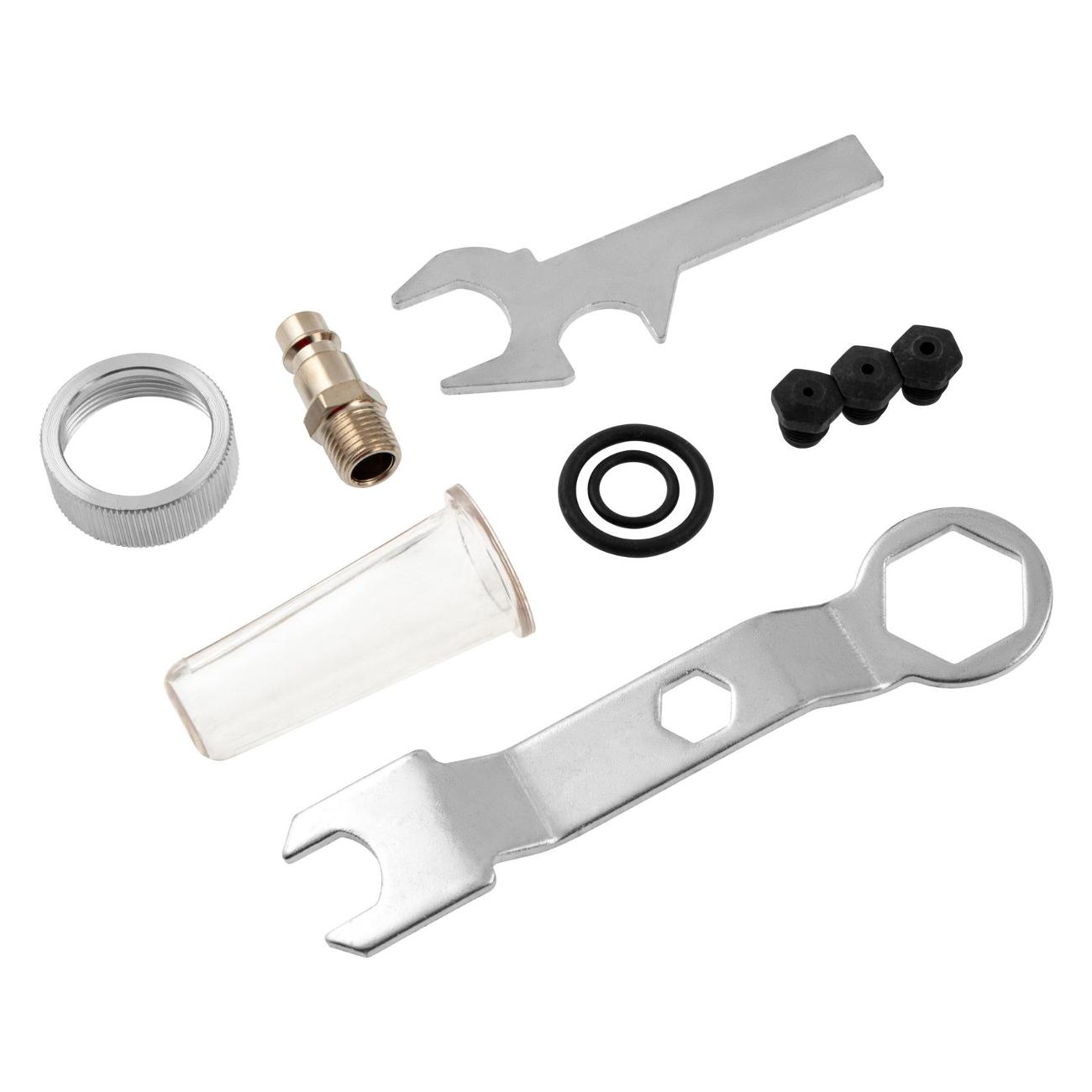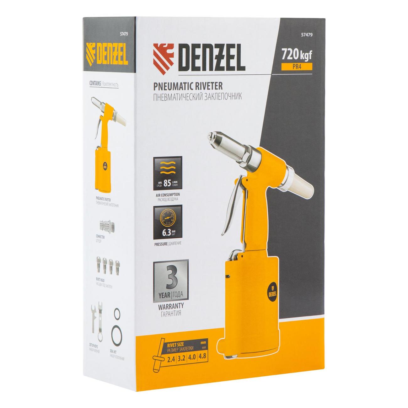 Электрический заклепочник Denzel PR4 подходит для работы с металлом и пластиком. Рабочее давление составляет 6,3 АТМ. Расход воздуха — 85 л/мин. В комплектацию включено четыре насадки. Конструкция отличается прочностью и износостойкостью. Она не содержит электроузлов, что сводит к нулю риск короткого замыкания.