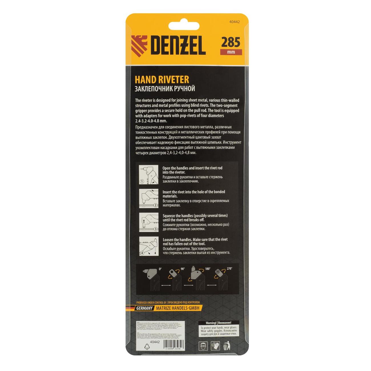 Вы можете купить Заклепочник ручной Denzel 40442 в магазинах М.Видео по доступной цене. Заклепочник ручной Denzel 40442: подробное описание, фото и отзывы реальных покупателей, характеристики, возможность скачать инструкции и подобрать аксессуары.