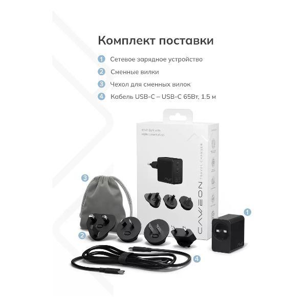 Универсальное сетевое зарядное устройство CAWEON со сменными вилками 65Вт, GaN — это универсальный адаптер питания, разработанный для путешествий по всему миру. Благодаря поддержке GaN и мощности 65 Вт он обеспечивает быструю зарядку, а комплект из четырех вилок (AU, EU, UK, US) гарантирует подключение в любой стране.