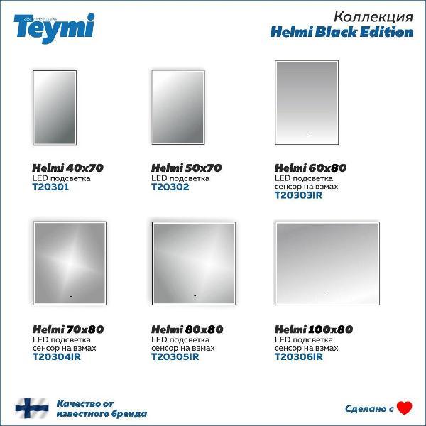 Особенности и характеристики: Зеркала коллекции Helmi Black Edition доступны в следующих размерах: -- 40 х 70 см – артикул на сайте T20301; -- 50 х 70 см – артикул на сайте T20302; -- 60 х 80 см – артикул на сайте T20303IR с сенсором на взмах; -- 70 х 80 см – артикул на сайте T20304IR с сенсором на взмах; -- 80 х 80 см – артикул на сайте T20305IR с сенсором на взмах; -- 100 х 80 см – артикул на сайте T20306IR с сенсором на взмах; -- Тип светильника: LED; -- Питание: от сети 220 Вольт; -- Срок службы диодов: 50 тысяч часов; -- Гарантийный срок: 24 месяца; -- Алюминиевая рама; -- Материал фасада: стекло; -- Оттенок подсветки: белый холодный; -- Страна бренда: Финляндия; -- Страна производства: Россия. Преимущества: -- Влагостойкое зеркальное полотно; -- LED подсветка; -- Стильный дизайн; -- Набор крепежей входит в комплектацию; -- Экономичность и эффективность использования. Подвесное зеркало Teymi Helmi со стильной черной алюминиевой рамой будет лучшим решением для вашего интерьера. Влагостойкие и прочные материалы премиум класса позволяют повесить зеркальное полотно на стену не только в ванную , туалет или душ , но и в коридор , прихожую или спальню . Тонкое интерьерное навесное полотно с алюминиевым корпусом и лед подсветкой смотрится современно и лаконично. Расположенная по периметру LED подсветка генерирует холодный свет, похожий на дневной, который способен освещать комнату без дополнительного освещения. Диоды рассчитаны на работу более 50 000 часов при непрерывной работе. Отражение не искажается и не затемняется при включении led панели. Модель не имеет выключателя, работает напрямую или от розетки сети 220V. Данная модель позволит вам сократить расходы электроэнергии на 60-80%. Корпус, состоящий из водонепроницаемого материала, защитит от случайных брызг все электрические и нагревательные элементы изделия, что позволит вам принимать ванну или душ, не опасаясь замыкания. Так же короб защищен от коррозии, а стекло устойчиво от царапин, это увеличивает срок пользования изделием в несколько раз. Вы можете выбрать такую же модель с другими габаритами в нашем размерном ряде. Гарантия на товар 2 года.