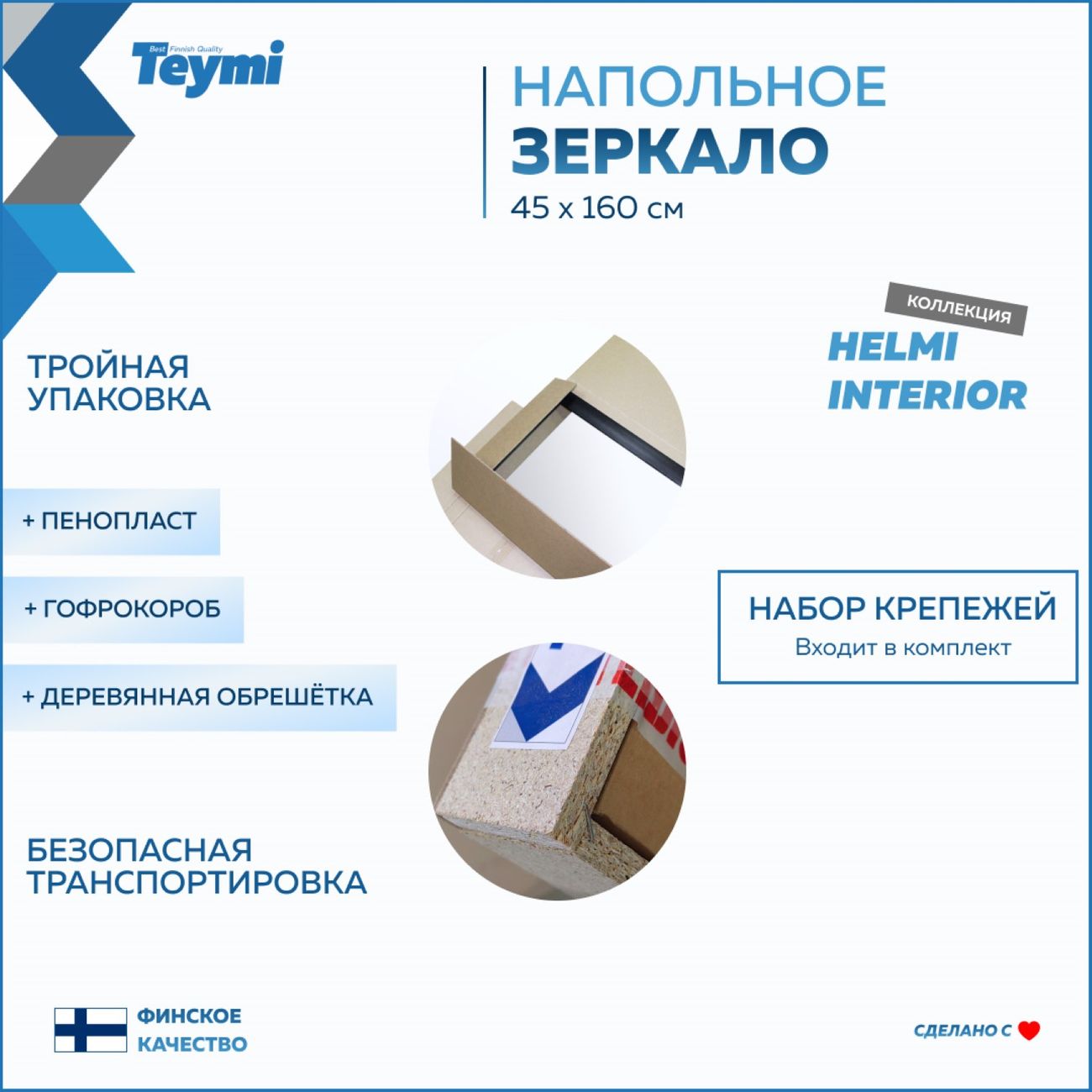 Особенности и характеристики:   Напольные зеркала коллекции Helmi Interior имеют размер 450х1600 мм и доступны в следующих цветах:   -- венге – артикул на сайте T20244, -- светлый дуб – артикул на сайте T20245   -- Зеркала БЕЗ ПОДСВЕТКИ, подключение подсветки не предусмотрено; -- Ширина зеркала: 45 см; -- Высота зеркала: 160 см; -- Рамка и подставка: влагостойкая МДФ-рама в плёнке ПВХ; -- Варианты цвета рамки: венге (чёрное дерево) / светлый дуб; -- Ширина рамки: 5,5 см; -- Изделие можно использовать как в напольном положении, так и повесить на стену; -- Материал фасада: стекло; -- Гарантия: 24 месяца; -- Страна бренда: Финляндия; -- Страна производства: Россия.   Преимущества:   -- Влагостойкое зеркальное полотно и рама – можно использовать в помещениях с повышенной влажностью (например, в ванных комнатах); -- Дизайн в стиле ретро; -- Набор крепежей входит в комплектацию; -- Экономичность и эффективность использования.   Продукция из коллекции Teymi Helmi Interior — это стильное напольное зеркало прямоугольной формы, созданное в винтажном стиле. Изделие станет настоящим украшением интерьера вашей спальни, гостиной или прихожей. Влагостойкие материалы, из которых произведено зеркало, позволяют его использование также и ванных комнатах: рамка изготовлена из МДФ, покрытого плёнкой ПВХ.   Зеркало надёжно упаковано в гофрокартон с пенопластовыми прокладками и деревянную обрешётку, обеспечивающую безопасную транспортировку изделия. Комплектация: Зеркало, набор крепежей, паспорт, инструкция, гарантийный талон.
