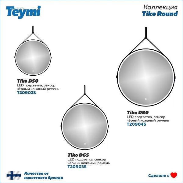 Особенности и характеристики:   Зеркала коллекции Tiko Round доступны в следующих размерах:   -- Ø 50 см – артикул на сайте T20902S; -- Ø 65 см – артикул на сайте T20903S; -- Ø 80 см – артикул на сайте T20904S;   -- Управление: сенсорная кнопка; -- Тип светильника: LED; -- Форма: круглая; -- Особенности: подвешивается на ремень из натуральной кожи; -- Регулировка ремня по высоте: да; -- Питание: от сети 220 Вольт; -- Срок службы диодов: 50 тысяч часов; -- Гарантийный срок: 24 месяца; -- Материал фасада: стекло; -- Оттенок подсветки: белый холодный; -- Страна бренда: Финляндия; -- Страна производства: Россия.   Преимущества:   -- Влагостойкое зеркальное полотно; -- LED подсветка; -- Стильный дизайн; -- Набор крепежей входит в комплектацию; -- Экономичность и эффективность использования.   Круглое интерьерное подвесное зеркало Teymi Tiko – это эксклюзивный авторский дизайн для вашей ванной комнаты . Каждая деталь навесного зеркала в ванну продумана с точки зрения удобства, современных технологи и эстетики. Износостойкий ремень из черной натуральной кожи с функцией регулировки полотна по высоте является оригинальным декоративным изделием, который украсит интерьер не только санузла, но и коридора , прихожей , гостиной или спальни . С его помощью вы можете повесить на стену изделие на нужную вам высоту и поменять ее в любой момент без демонтажа. LED-подсветку включает сенсорная кнопка , реагирующая на касание. Датчик сенсорного выключателя срабатывает быстро, менее чем за 1 секунду. Влагостойкие и водонепроницаемые материалы премиум качества имеют защиту IP-44 от попадания брызг воды и пыли, что делает применение изделия безопасным для ванны , туалета , душа и других помещений с высокой концентрацией влаги. Светодиоды генерируют холодный свет и позволяют осветить комнату без дополнительного света, они способны прослужить более 50 000 часов при непрерывной работе. Лед подсветка позволяет снизить расходы электроэнергии на 60-80%. Изделие подключается к сети 220V через розетку или напрямую через кабель. Teymi Tiko соответствует директиве безопасности для здоровья человека Rosh, имеет повышенную устойчивость к царапинам и защиту от коррозии. Вы можете подобрать светодиодное зеркальное полотно другого диаметра с такими же функциями в нашем размерном ряде. Гарантия на товар 2 года.