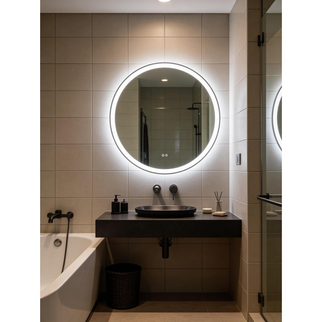 Круглое зеркало с подсветкой UNI-FLOW M-201 диаметром 80 см - это высокотехнологичный элемент интерьера, сочетающий в себе минималистичный дизайн и максимальный комфорт. Отсутствие рамы делает его визуально легким, позволяя гармонично вписаться в любое современное пространство.Преимущества модели: Интеллектуальное освещение: Сенсорная система позволяет одним касанием менять атмосферу в ванной, выбирая между уютным теплым (2700K), естественным дневным (4000K) или бодрящим холодным светом (6400K). Всегда четкое отражение: Встроенная функция антизапотевания избавляет от необходимости протирать зеркало после принятия душа - поверхность остается идеально чистой. Удобное управление: Чувствительный сенсорный переключатель мгновенно реагирует на касание, обеспечивая простоту эксплуатации. Надежность и безопасность: Электрические компоненты выполнены по стандарту CE, что гарантирует долгий срок службы и защиту во влажной среде.